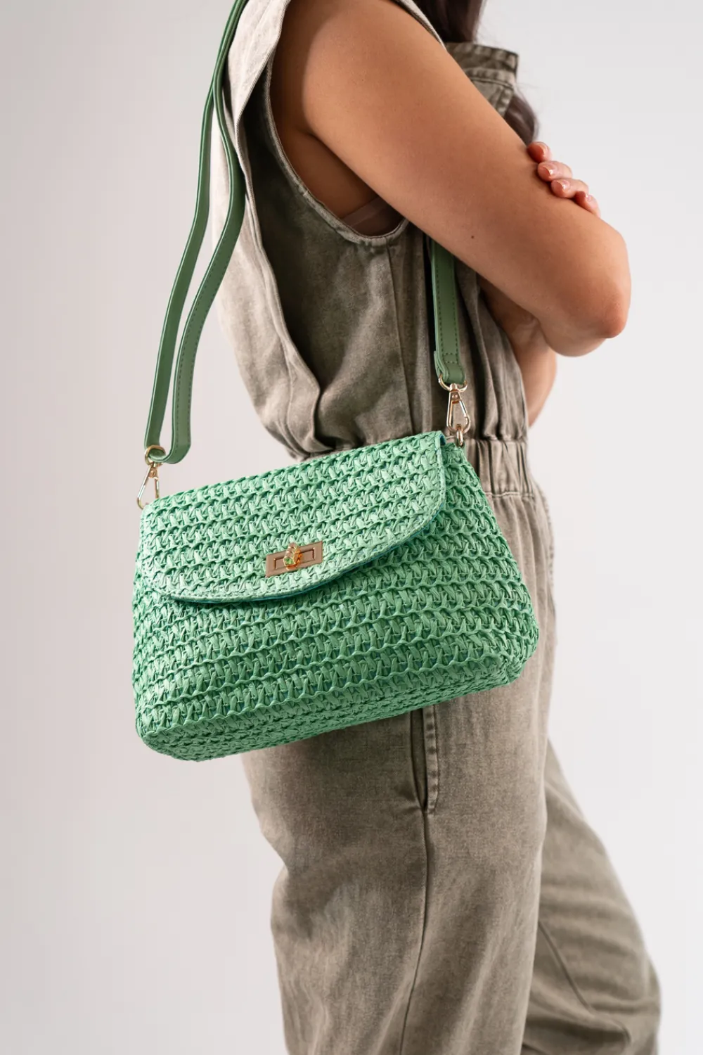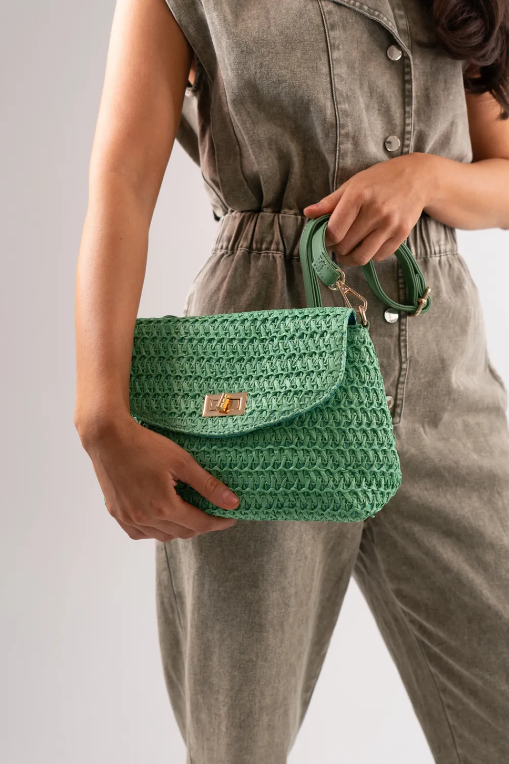 This one size, green woven bag from Polly is made of synthetic materials and features a clasp closure and detachable shoulder strap. Its woven raffia effect adds a touch of elegance to any outfit. Perfect for a day out or a special occasion.