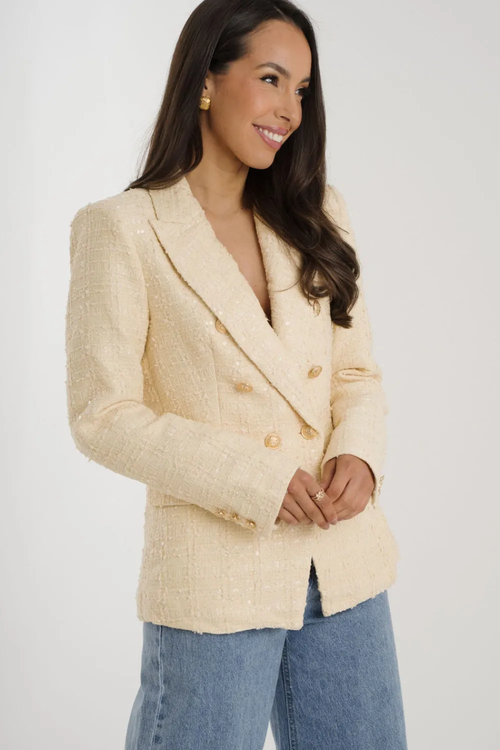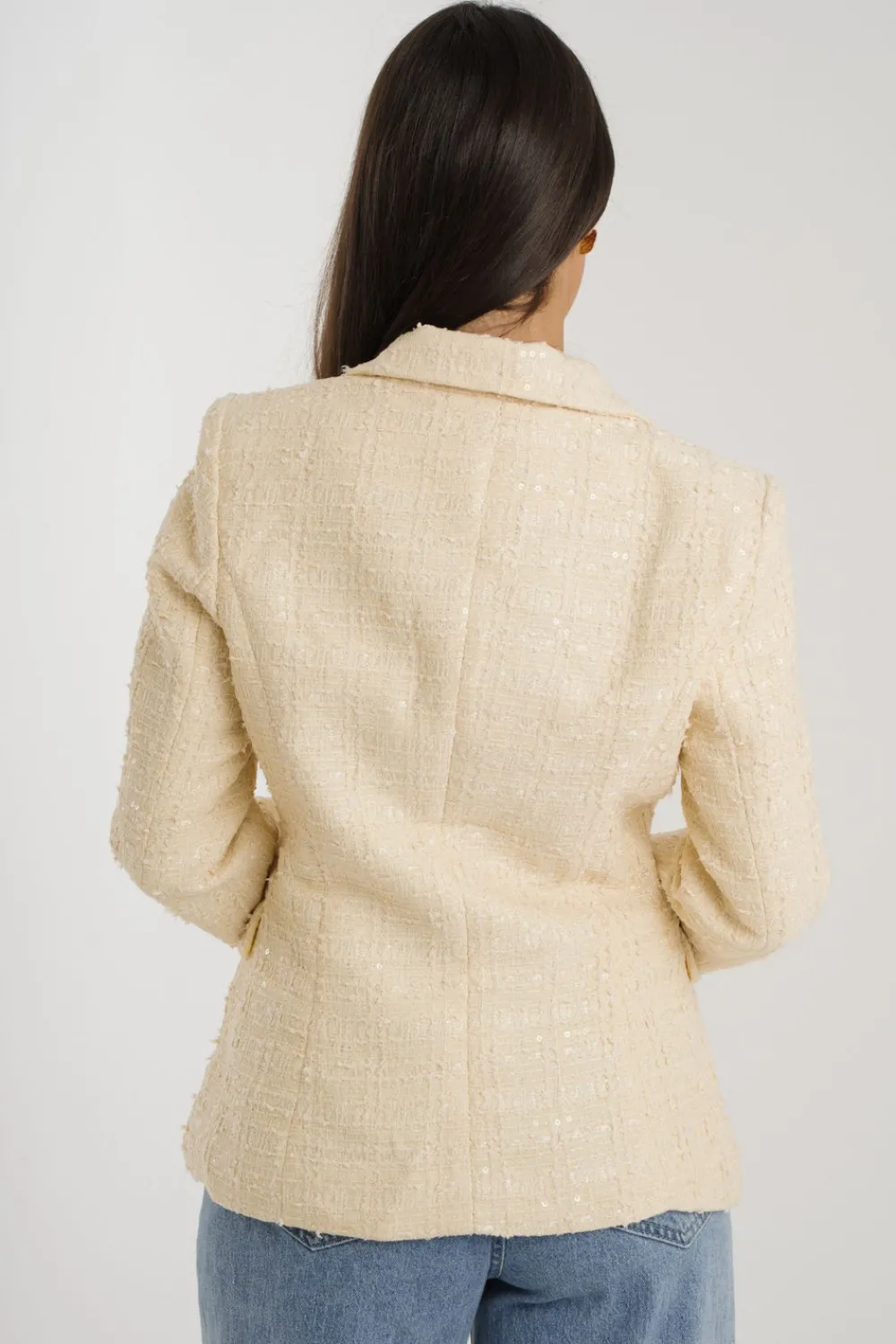 This elegant Arabella tweed blazer features a sophisticated collar and a flattering tweed style. The blush pink colour adds a touch of femininity while the button front and pockets provide functionality. With long sleeves and a subtle shimmer, it’s the perfect addition to any wardrobe.