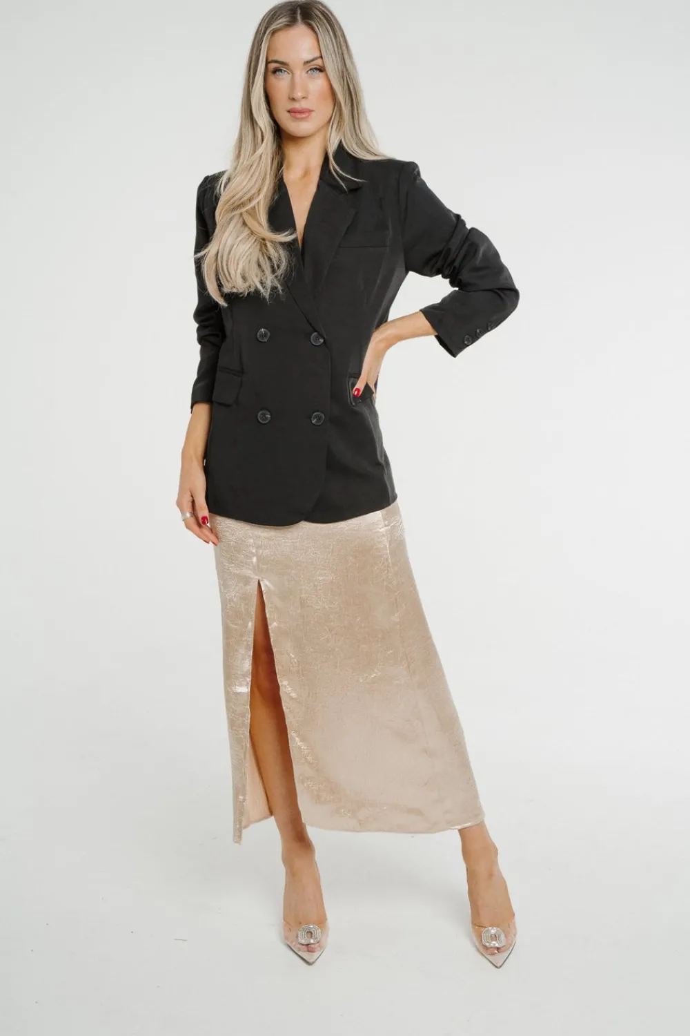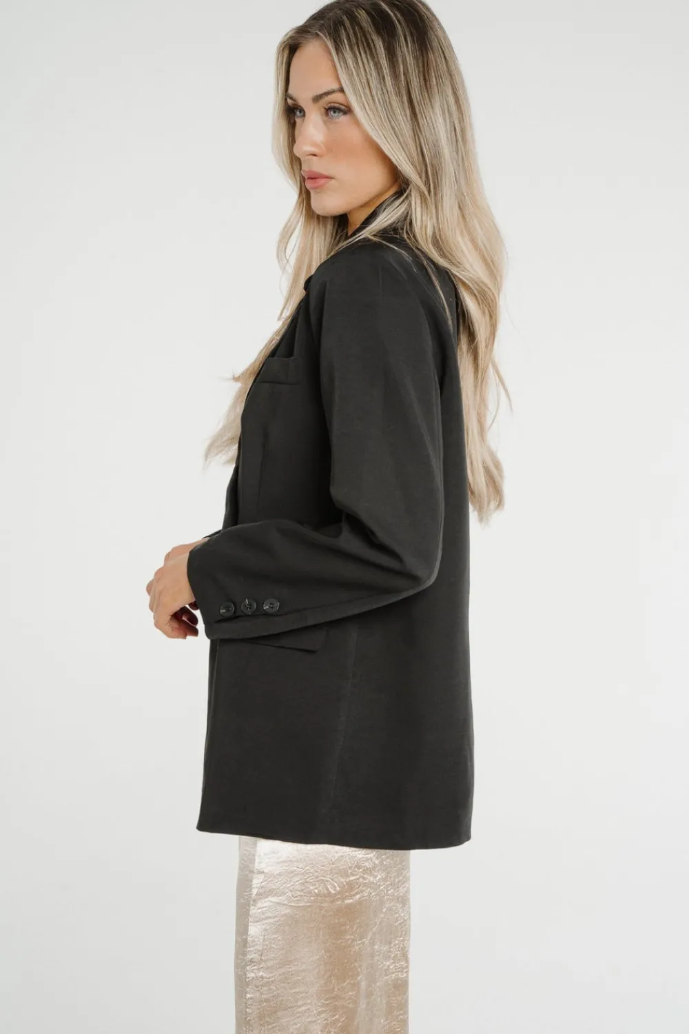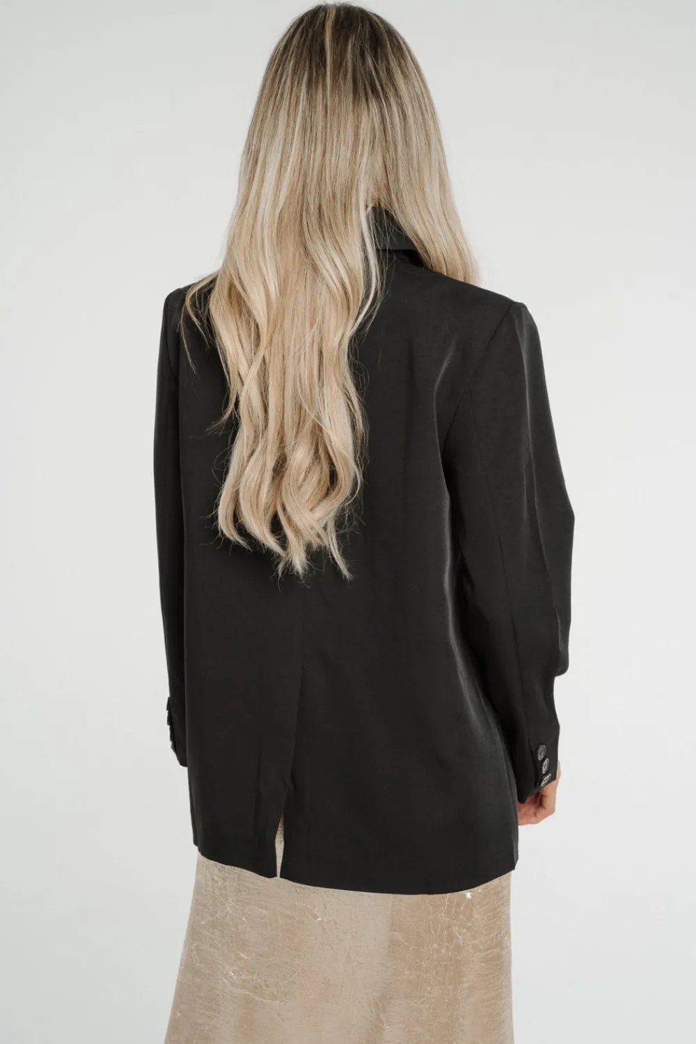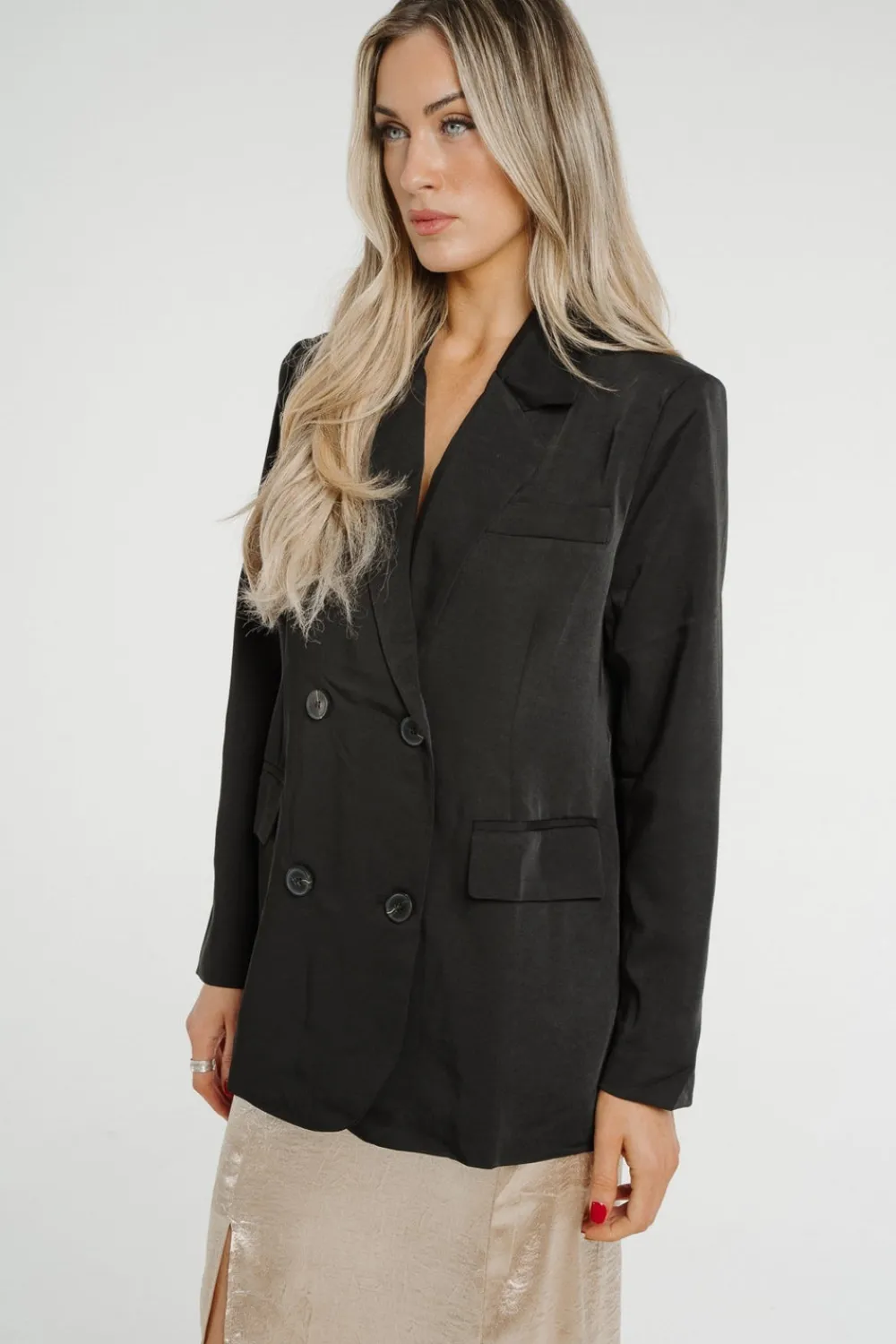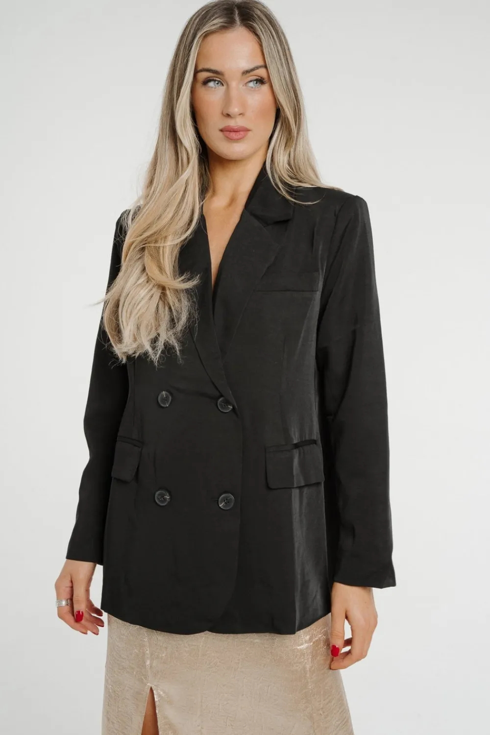 Effortlessly chic and versatile, the Jane Blazer in Black is a must-have wardrobe staple. Featuring a double-breasted design and faux pockets, this lined blazer offers a boyfriend fit that exudes sophistication. Perfect for any occasion, this black blazer is a timeless piece that adds a touch of elegance to your look.
