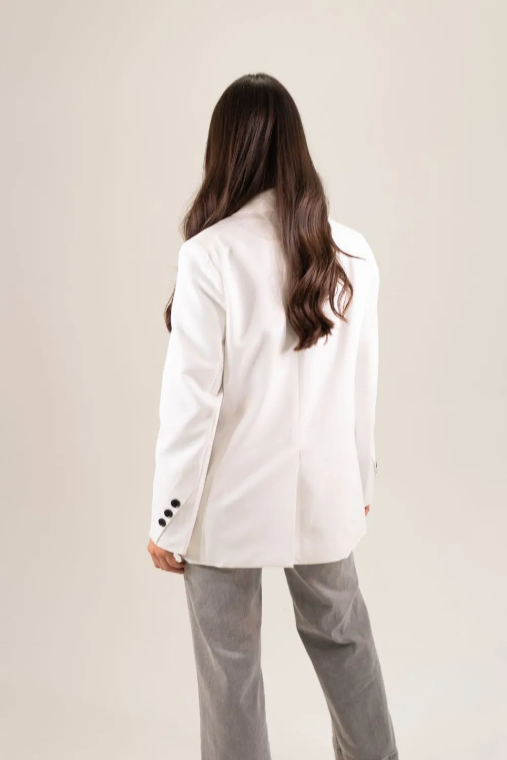 The Nadia Blazer in White is a sophisticated and timeless piece, perfect for any professional setting. With a classic collar, faux pockets, and a double breasted design, this blazer is both stylish and functional. The black buttons add a touch of contrast to the crisp white colour. Stay polished and put together with this sleek and elegant blazer.