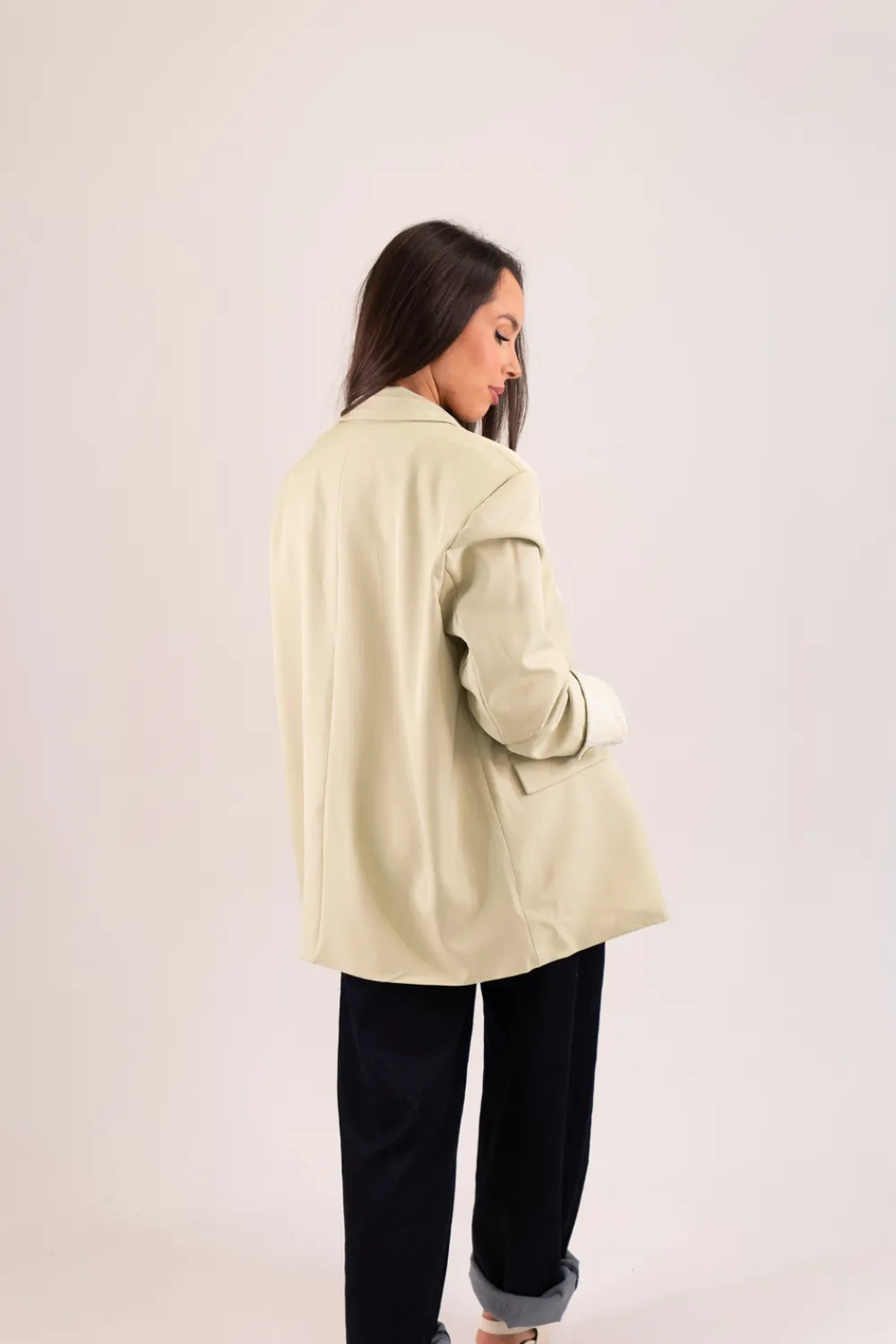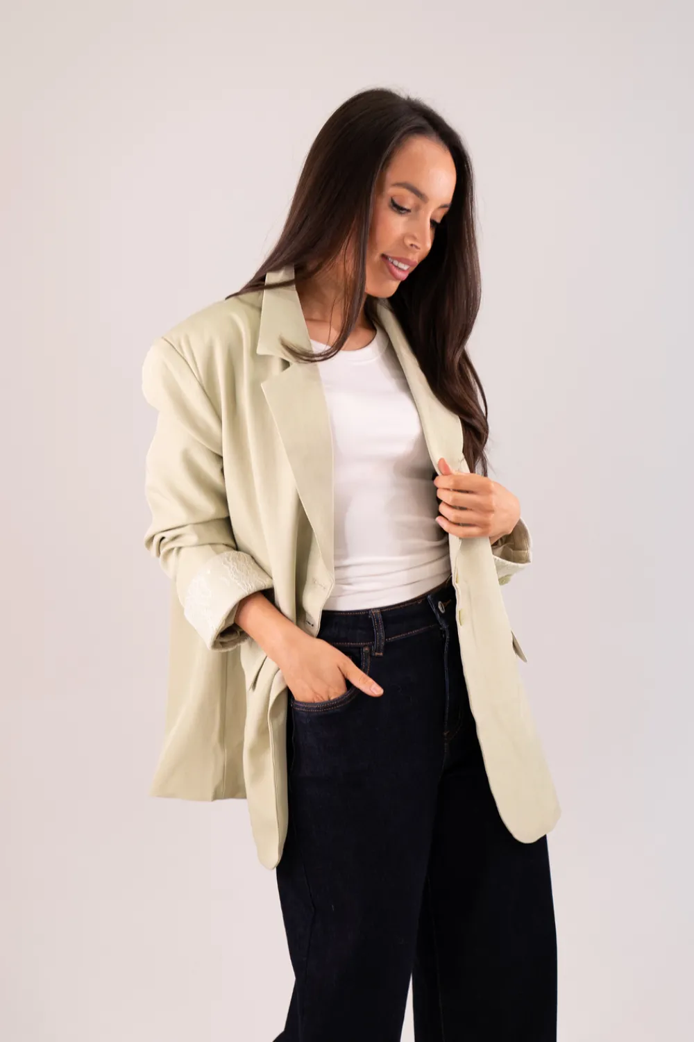 This Willow Contrast Cuff Blazer is a must-have for any fashion-forward wardrobe. The mint colour adds a touch of freshness, while the lace turn-up cuffs and collar add a delicate touch. The faux pockets and two button front offer a classic look, while the oversized fit and lining provide comfort and style. Elevate your wardrobe with this elegant blazer.
