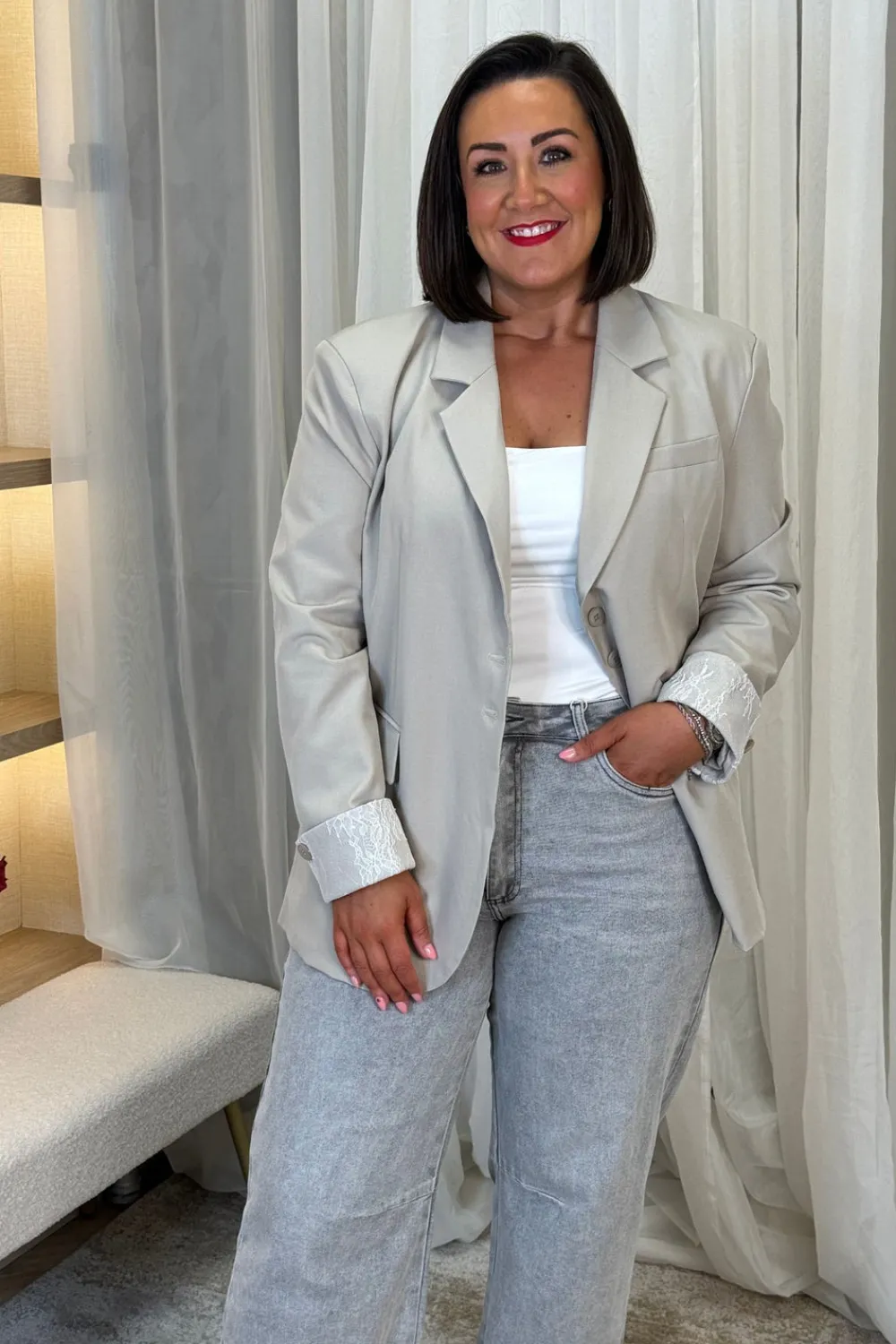 Enhance your professional wardrobe with our Willow Contrast Cuff Blazer in a versatile neutral colour. The lace detailing on the turn-up cuffs adds a touch of elegance, while the collar and faux pockets elevate the classic design. The two-button front and oversized fit provide both comfort and style.