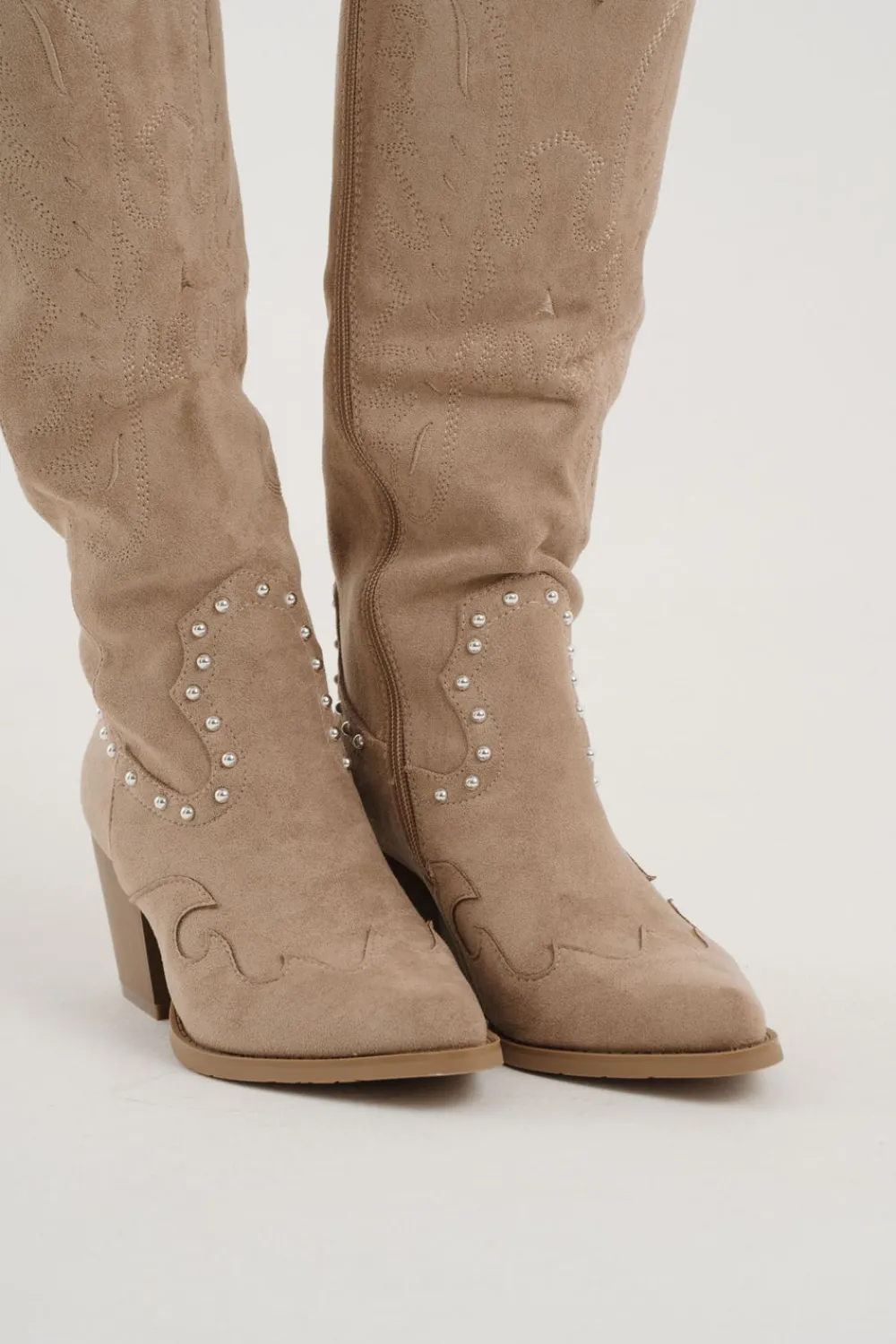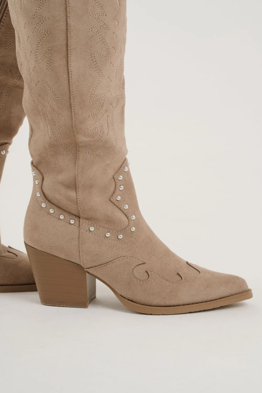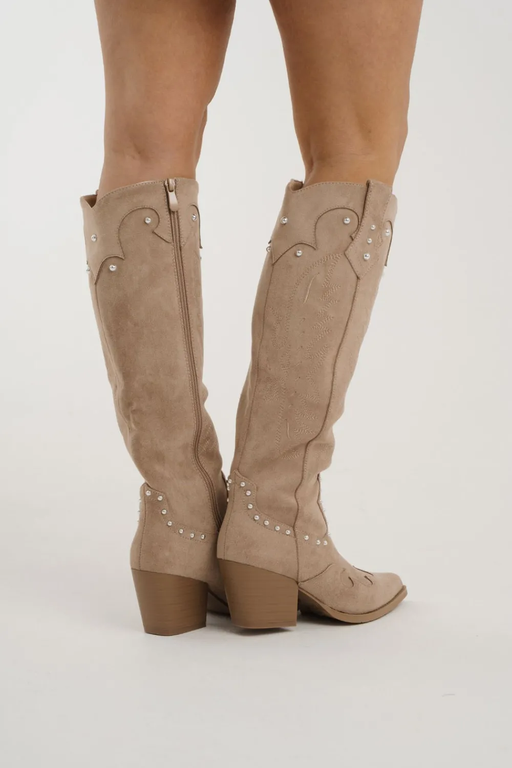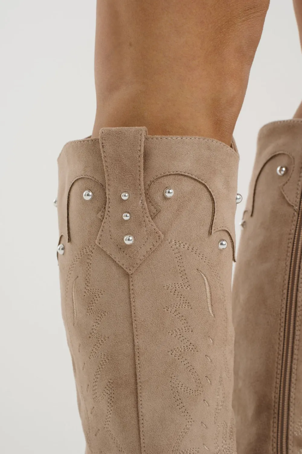 Expertly crafted with faux suede and featuring a pointed toe and stud embellishments, our Cathy Western Boots add a touch of edgy chic to your wardrobe. With a comfortable block heel, inner zip, and knee-length design, these boots are perfect for any occasion. Available in a neutral colour to complement any outfit.