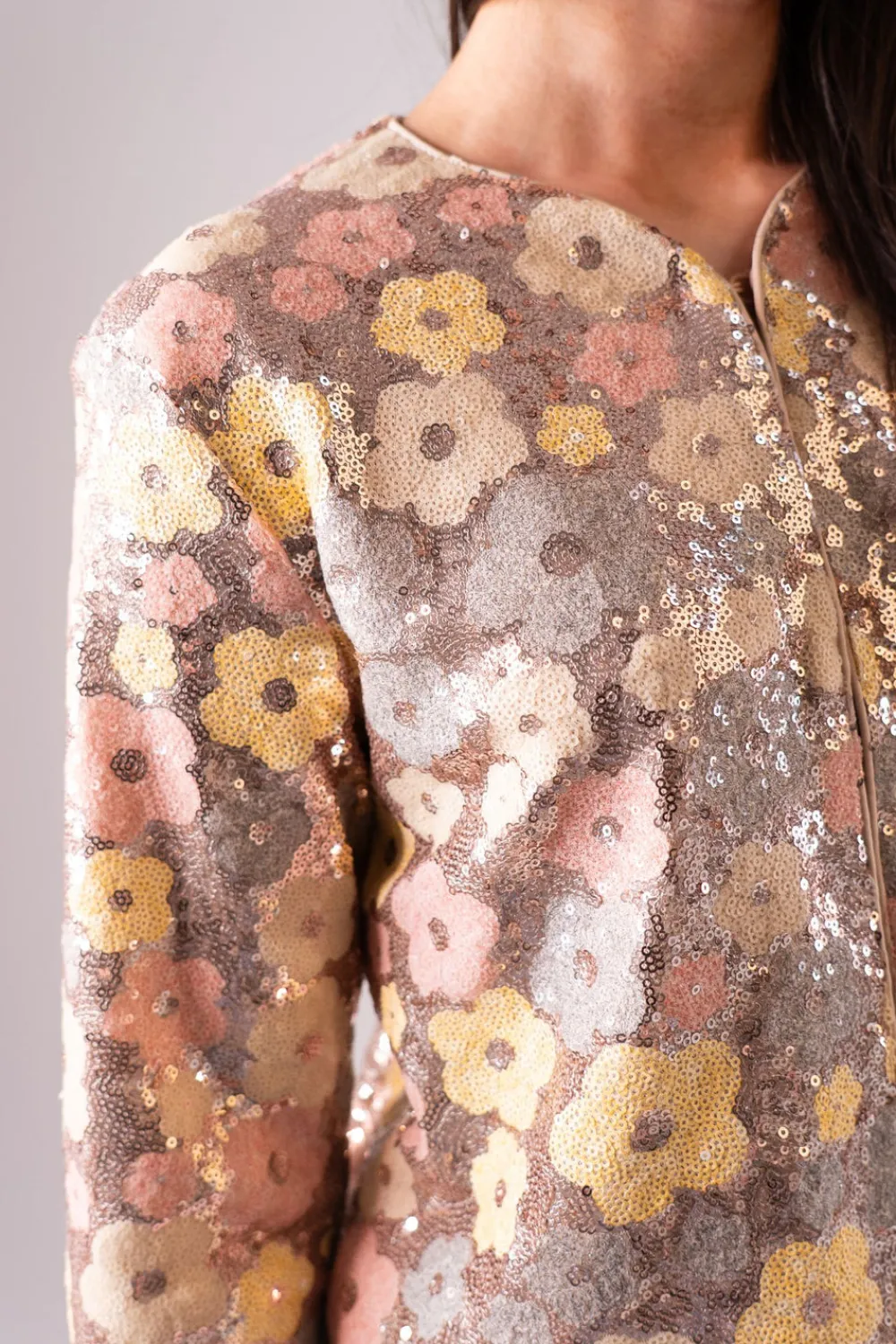 Expertly designed for a touch of elegance, the Carolyn Sequin Floral Jacket in Rose Gold features stunning sequin embellishments and delicate floral details. Its long sleeves and lined interior offer comfort and style, while the crop cut and clasp closure add a trendy touch. Perfect for any occasion, this jacket will elevate your look with its gorgeous rose gold tones.