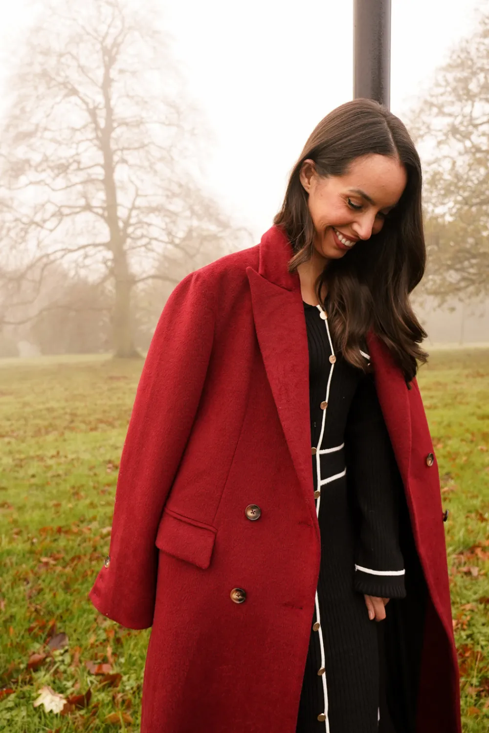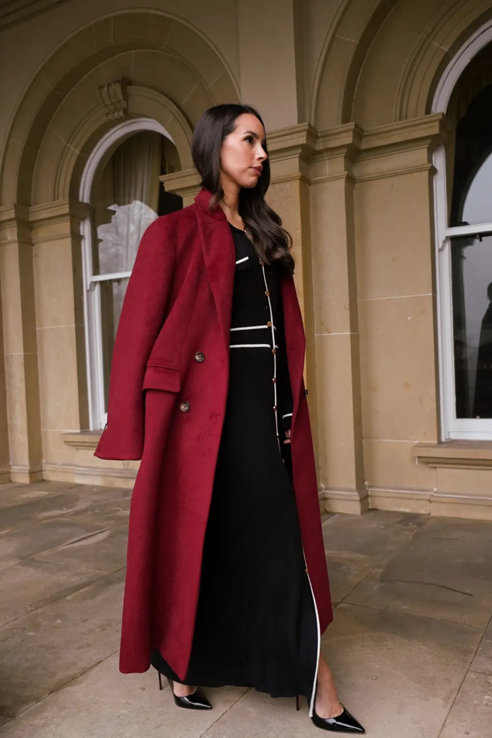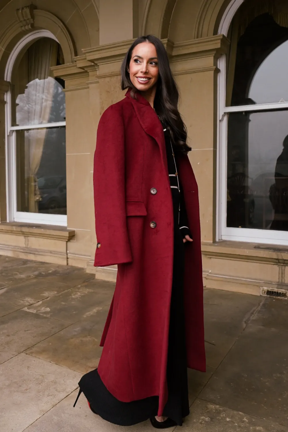 This Love Laura Coat in wine red offers a sophisticated and stylish look with its double breasted button front, faux pockets, and button detail cuffs. The back split adds an element of elegance while the lining provides warmth and comfort. Perfect for any occasion with a length of 119cm from shoulder to hem.