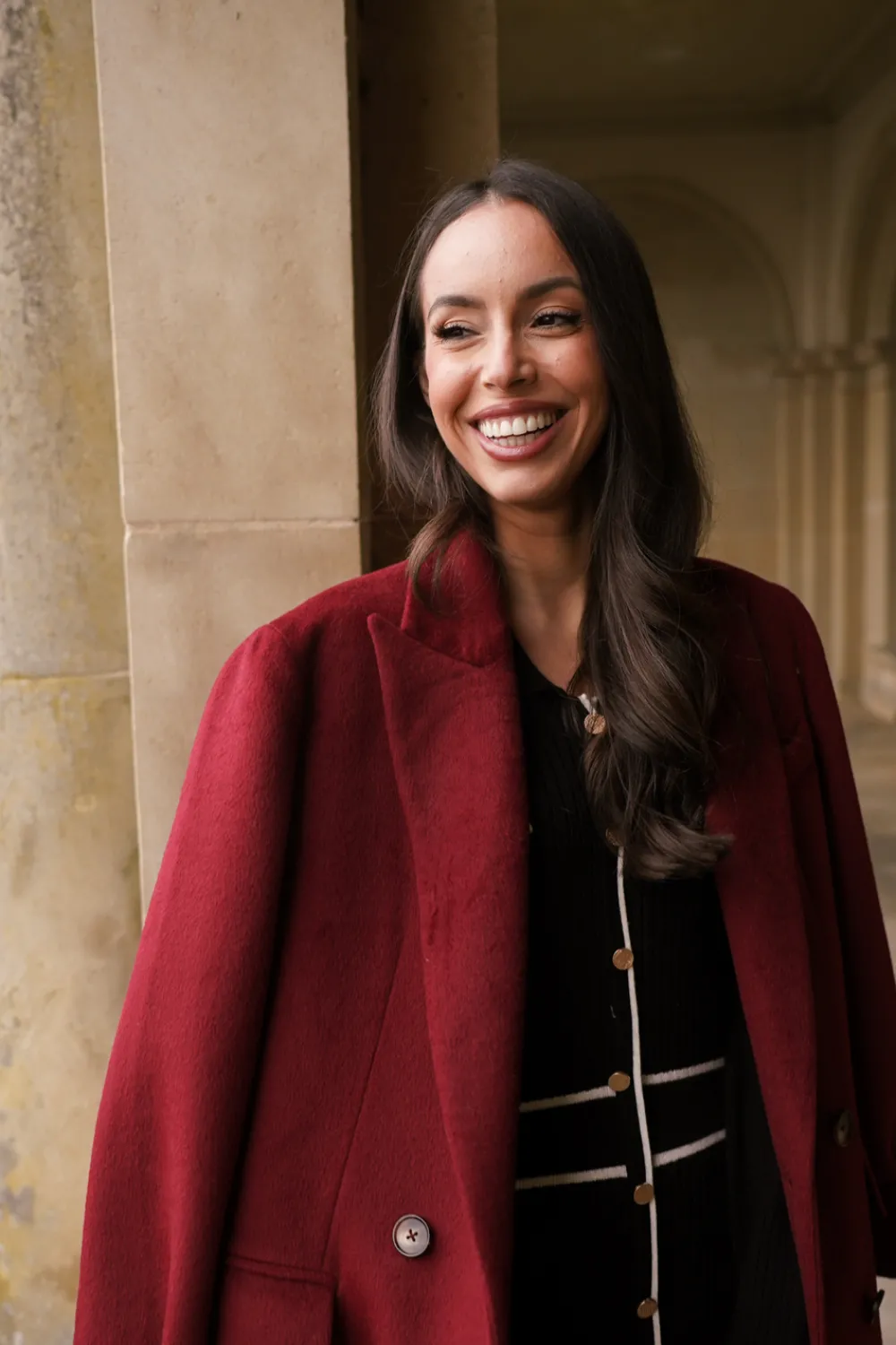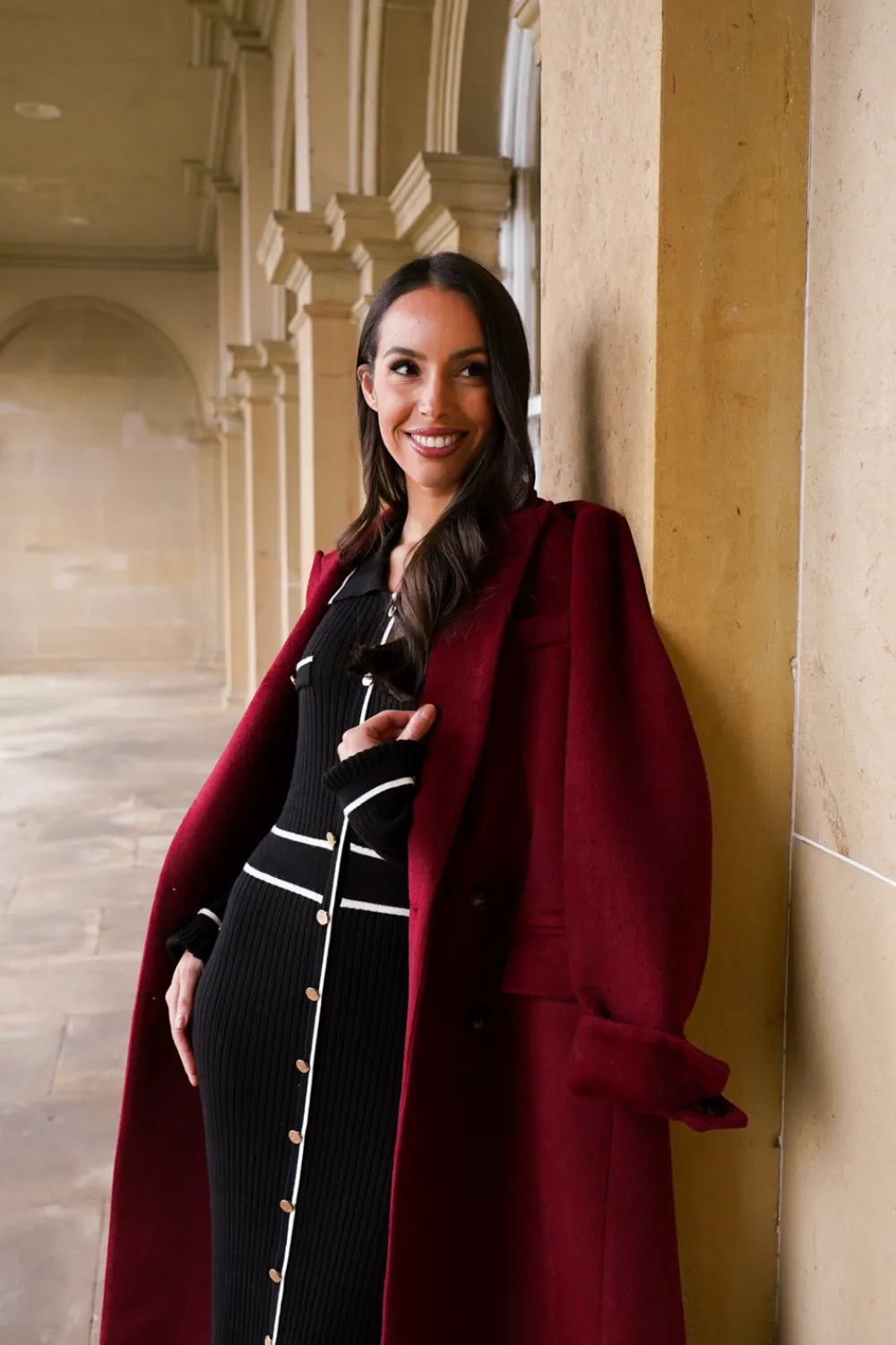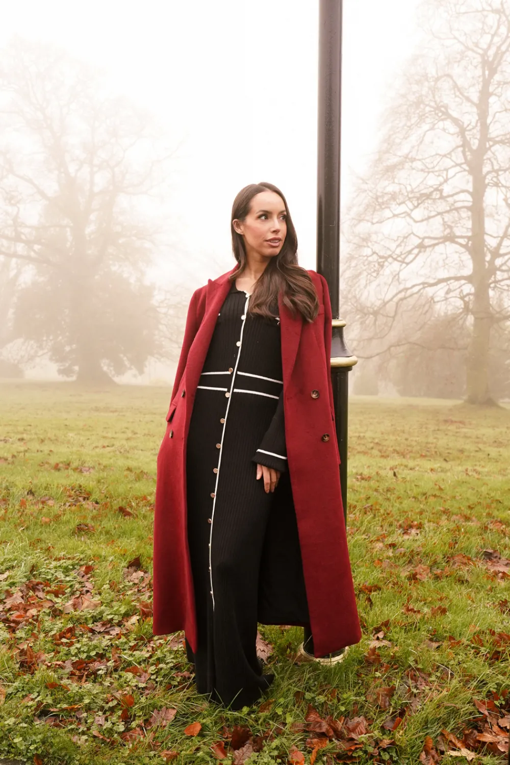 This Love Laura Coat in wine red offers a sophisticated and stylish look with its double breasted button front, faux pockets, and button detail cuffs. The back split adds an element of elegance while the lining provides warmth and comfort. Perfect for any occasion with a length of 119cm from shoulder to hem.