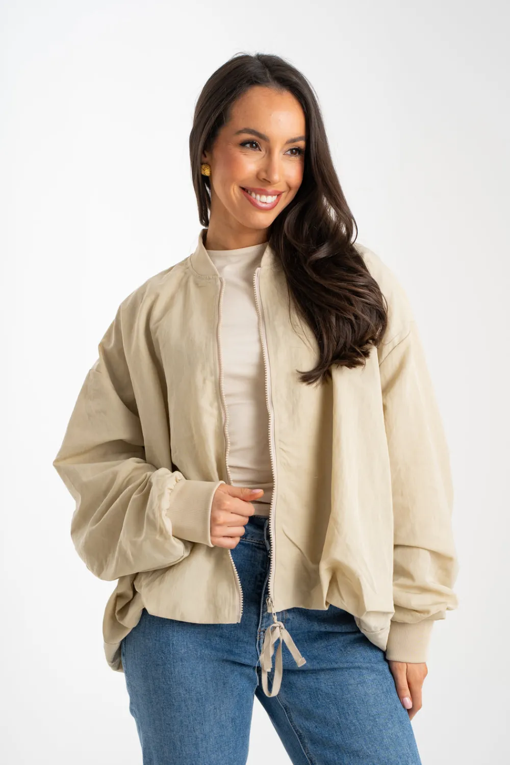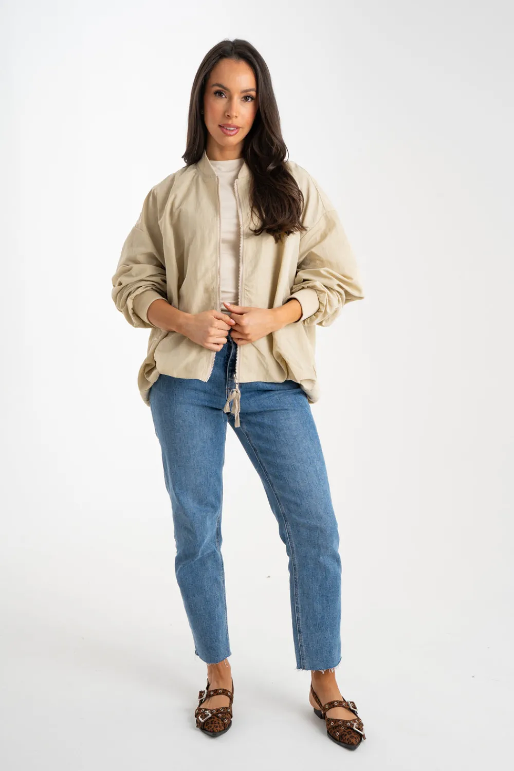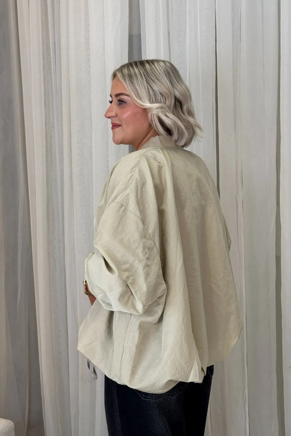 This Paige Oversized Bomber Jacket in Neutral is the perfect combination of comfort and style. The round neck, fitted cuffs, and zip front provide a flattering fit, while the oversized style adds a trendy touch. With convenient pockets and a neutral colour, this jacket is a versatile addition to any wardrobe.