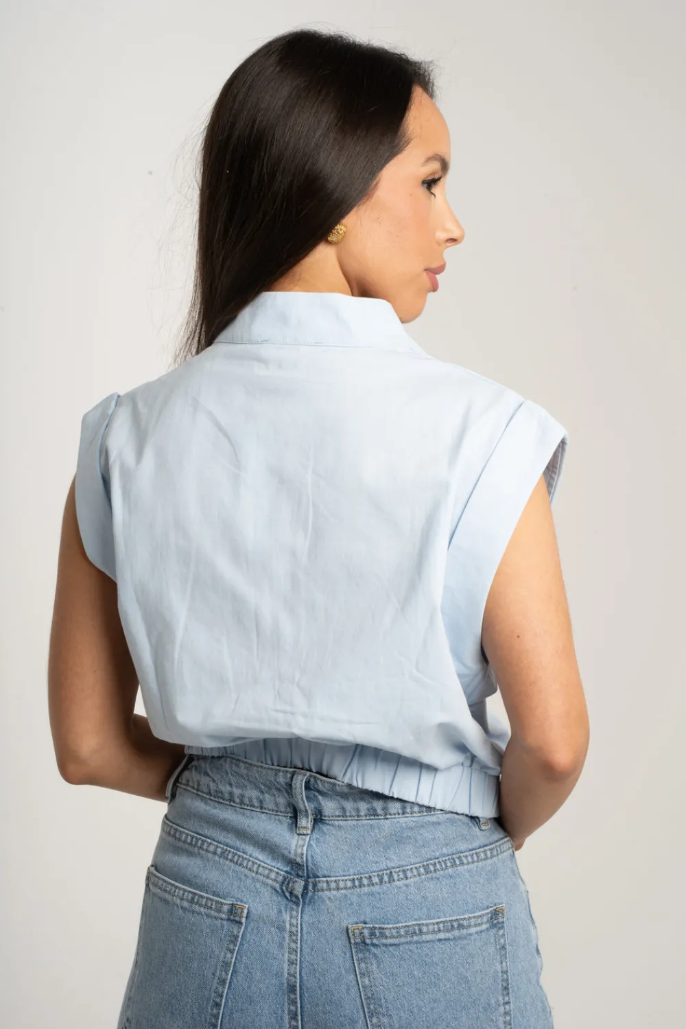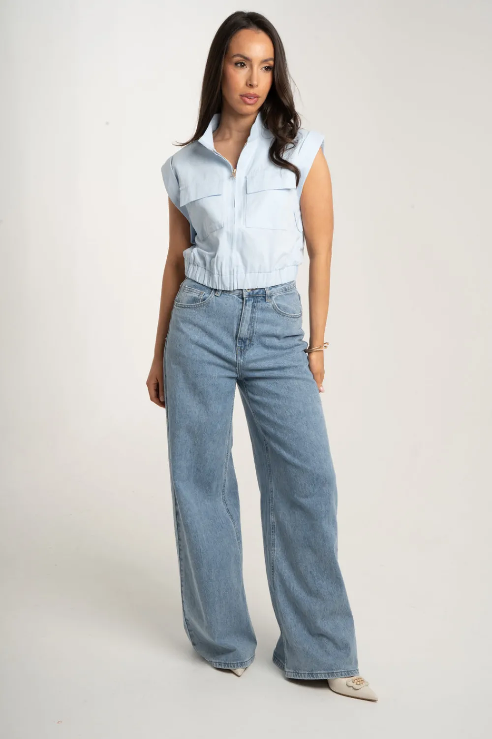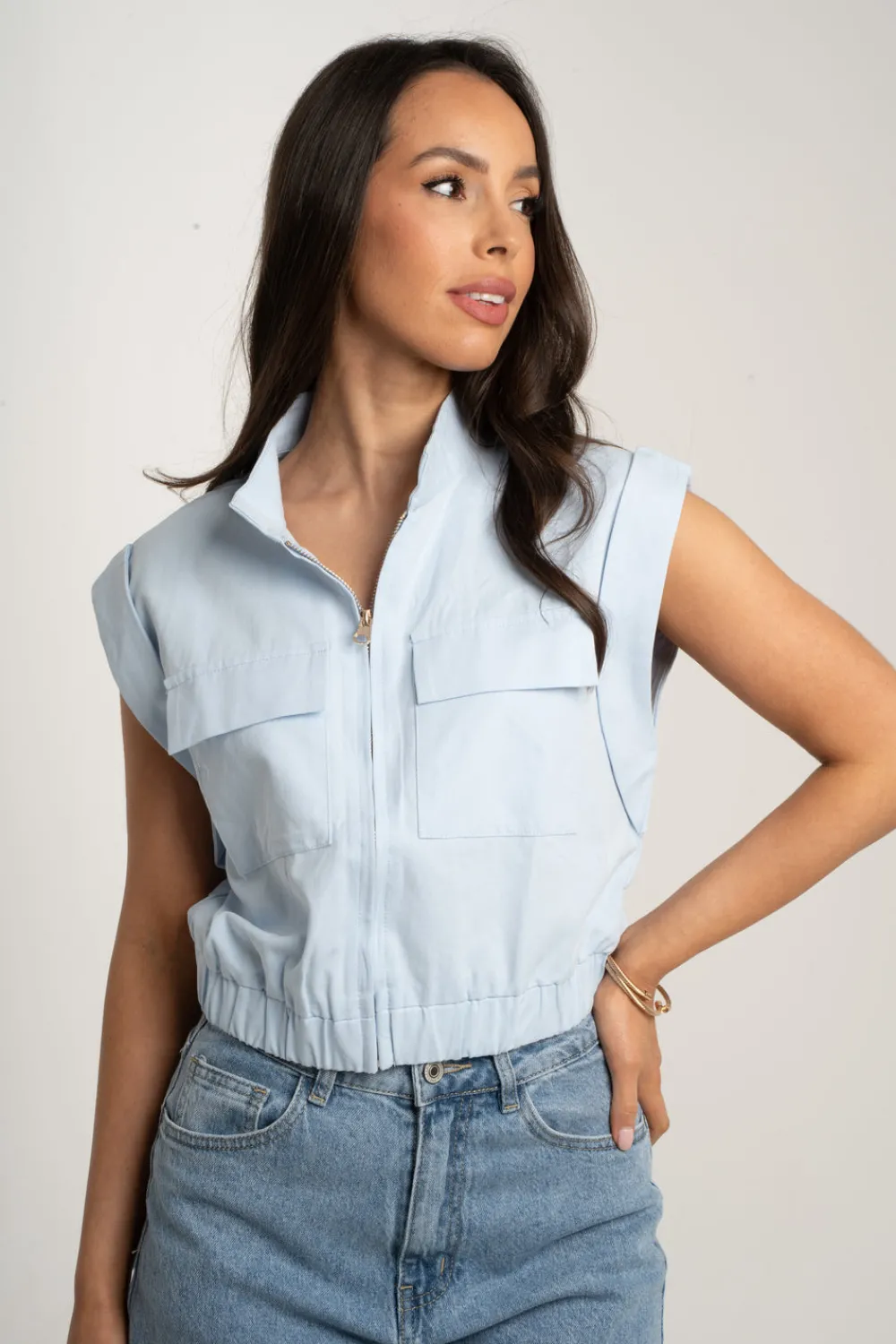 Expertly crafted, the Polly Sleeveless Cargo Jacket features a classic collar and a convenient zip front. With its sleeveless design and elasticated hem, it offers maximum comfort and mobility. Made from durable and breathable cotton, it also boasts large pockets for secure storage. In a stylish blue hue, this jacket is a must-have for any wardrobe.