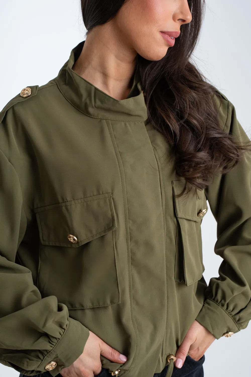 Expertly designed for functionality and style, the Una Cargo Jacket In Khaki features a gold button front and round neck. With long sleeves and button cuffs, it offers a tailored fit and a drawstring waist for a flattering look. Plus, the cargo style pockets add a touch of utility to this versatile khaki jacket.