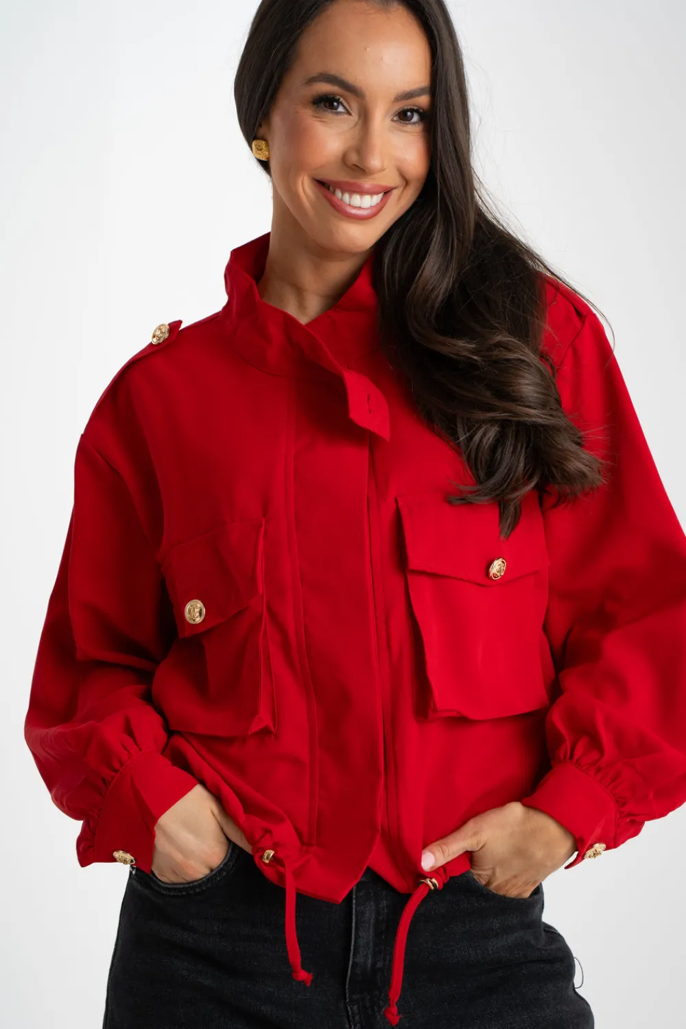 Add a touch of sophistication to your wardrobe with the Una Cargo Jacket in Red. This stylish jacket features a gold button front, round neck, and long sleeves with button cuffs. The drawstring waist cinches in at the waist for a flattering fit, while the cargo style pockets provide functionality. Made in a vibrant red colour, this jacket is sure to make a statement.