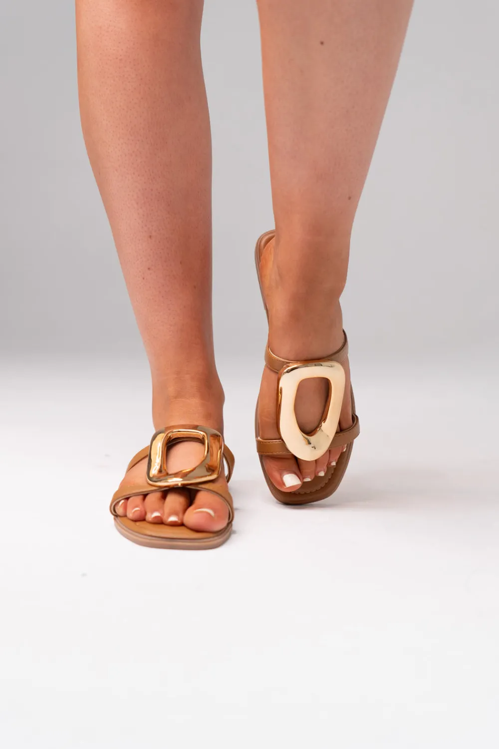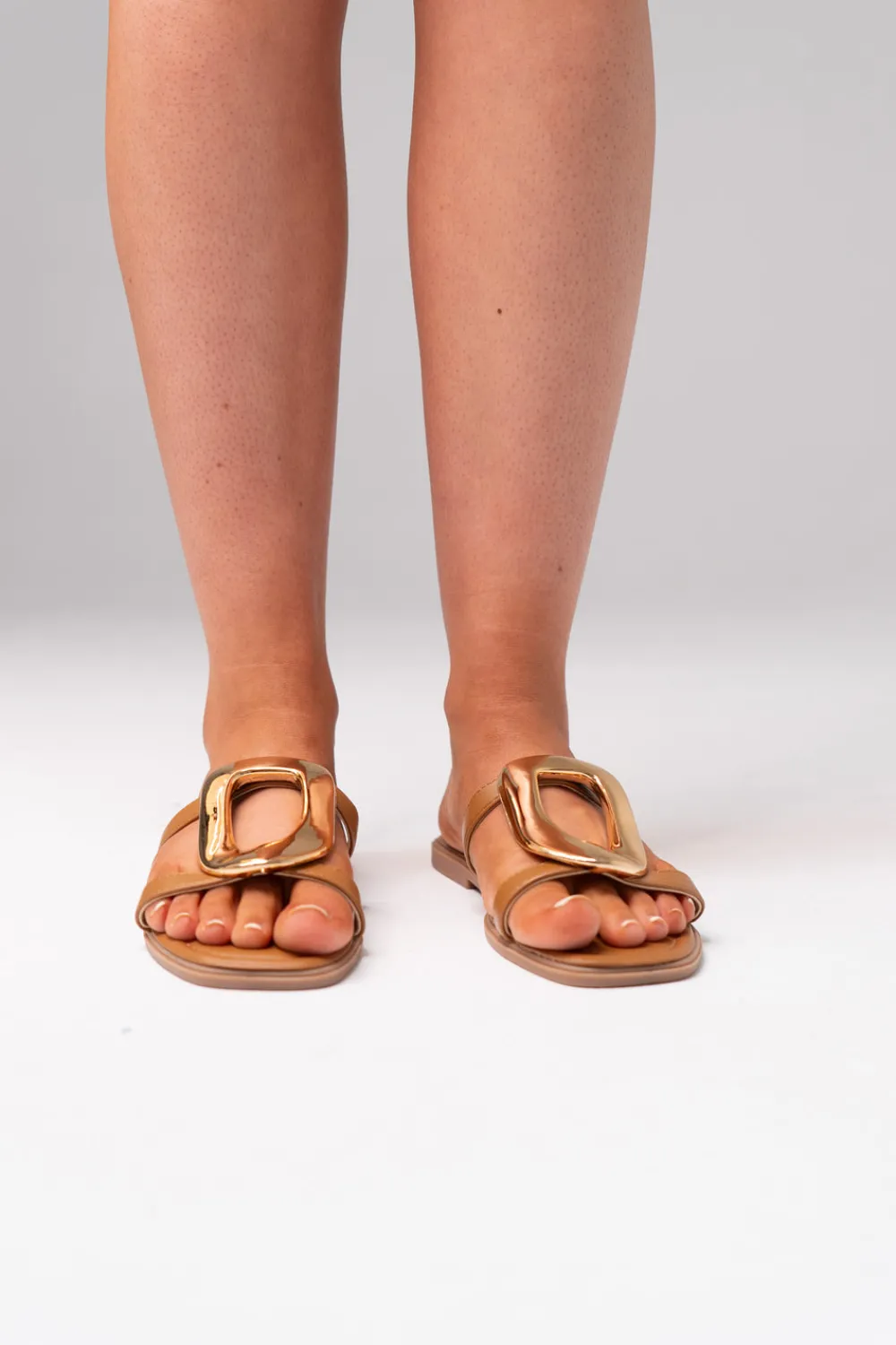 Expertly crafted flat flip flops in a versatile camel shade featuring elegant gold buckle detailing. The fine synthetic straps provide a comfortable slip-on design, making these the perfect blend of style and practicality for warm-weather occasions. An essential addition to your summer footwear collection.
