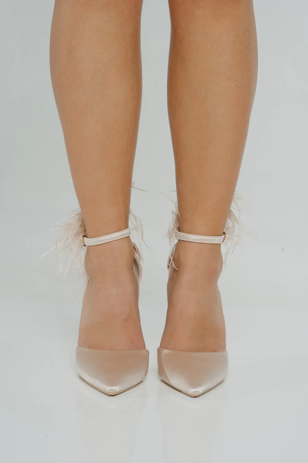 Introducing the Izzy Feather Detail Heel in Champagne. With a pointed toe and 11cm heel, these heels add a touch of glamour to any outfit. The feather detail ankle strap and faux satin material add luxurious touches, making them not only stylish but comfortable to wear.