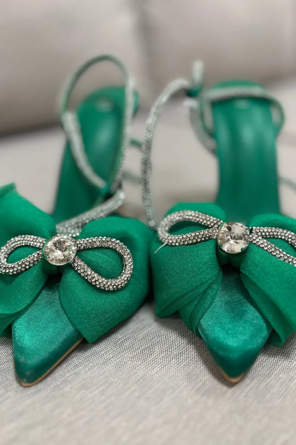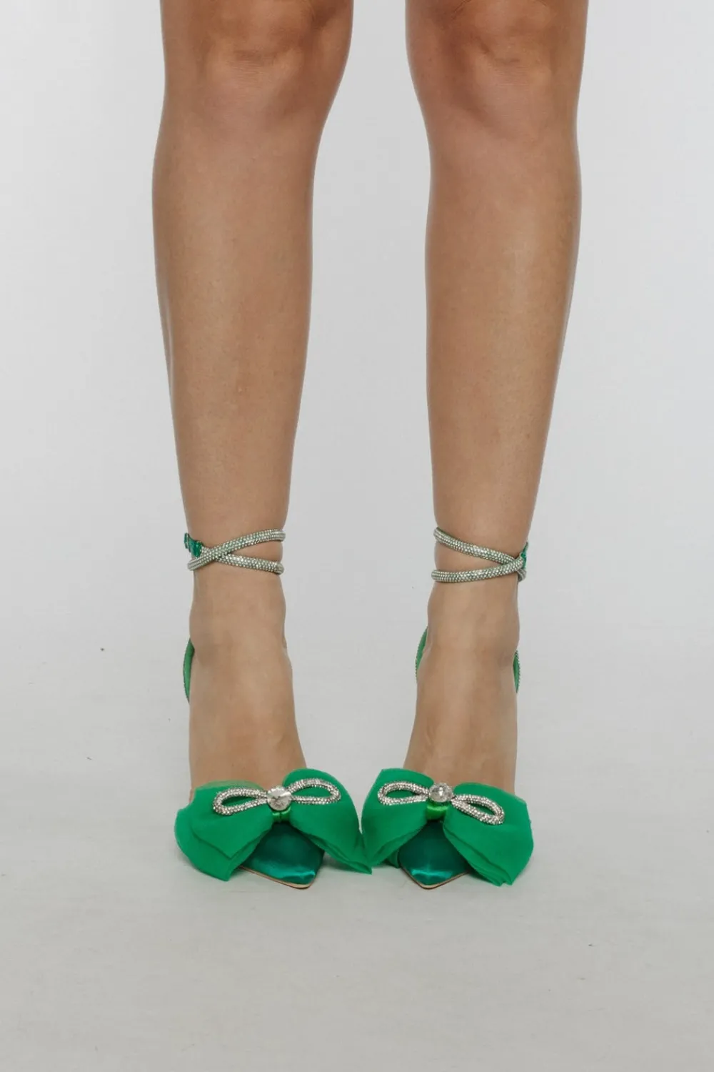 Elevate your style with the Lauren Bow Heel in Green. Featuring a chic bow and dazzling diamante detail, these satin heels add a touch of glamour to any outfit. The wrap around strap ensures a secure fit while the vibrant green colour adds a pop of colour to your look.
