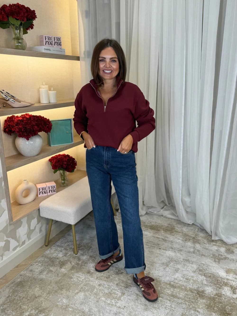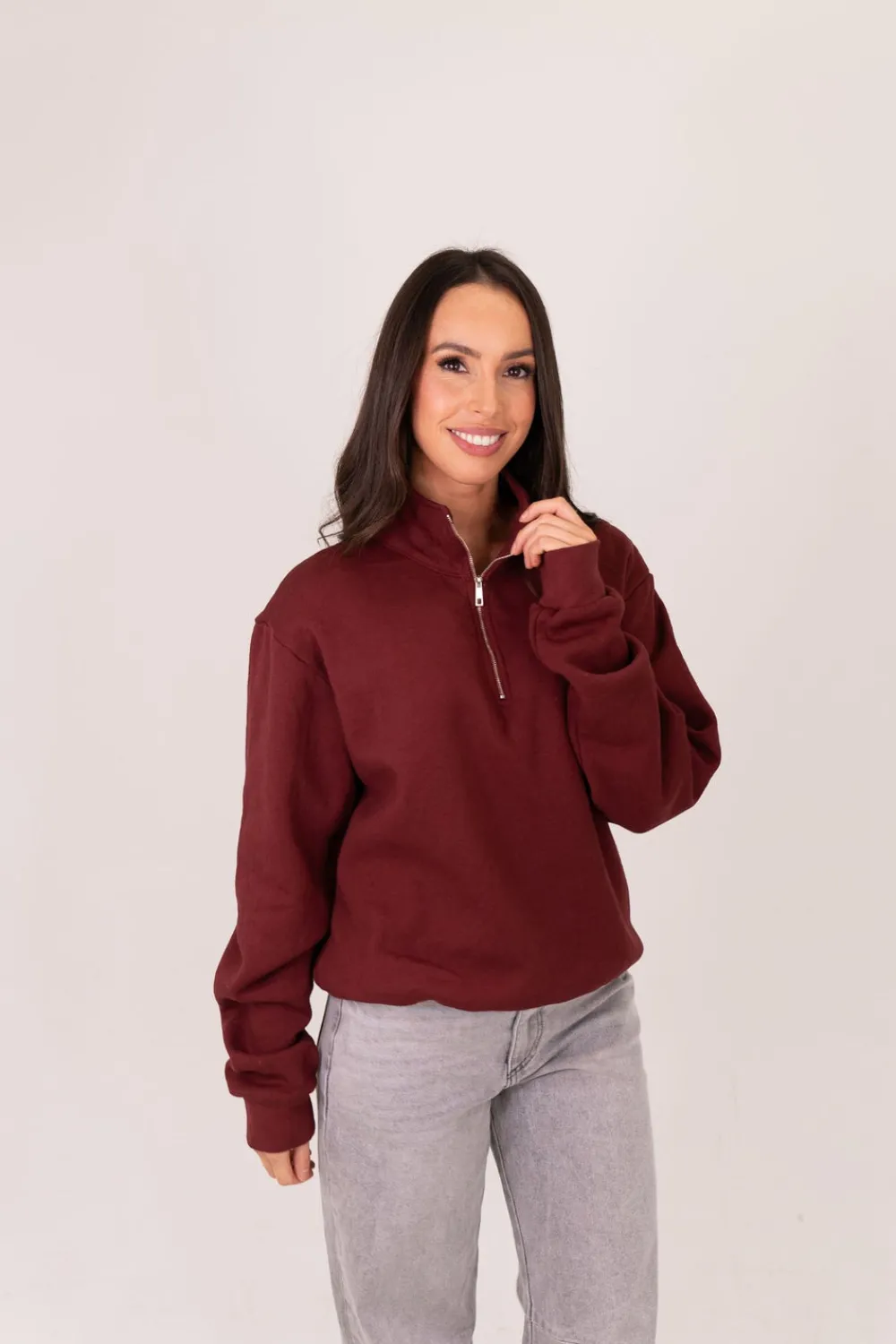 The Poppy Half Zip Sweatshirt is the perfect addition to your wardrobe. With its half zip design and collar, it offers both style and comfort. The comfortable fit makes it suitable for sizes 8-14. Stay warm and fashionable with the long sleeve design in a rich Bordeaux colour.