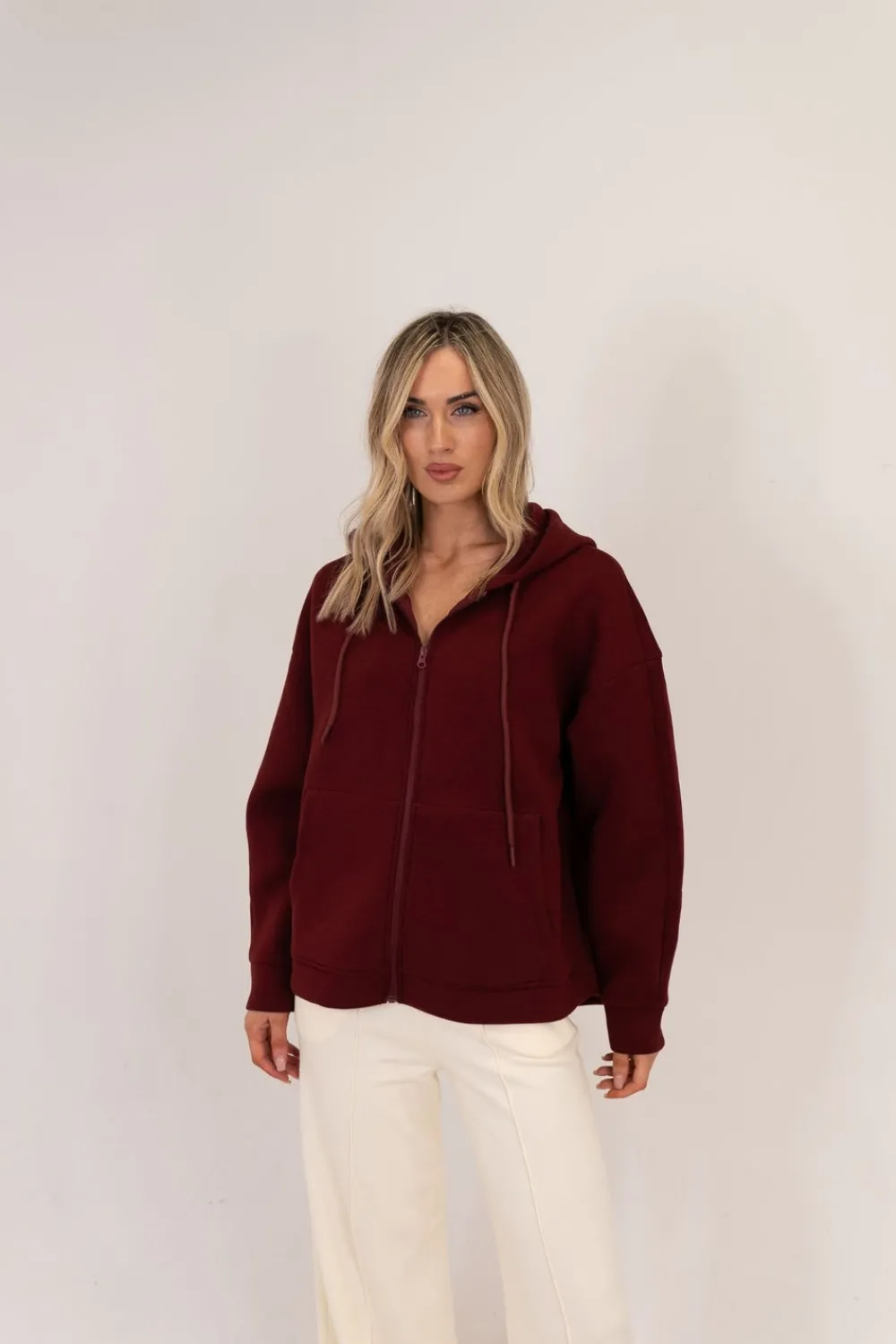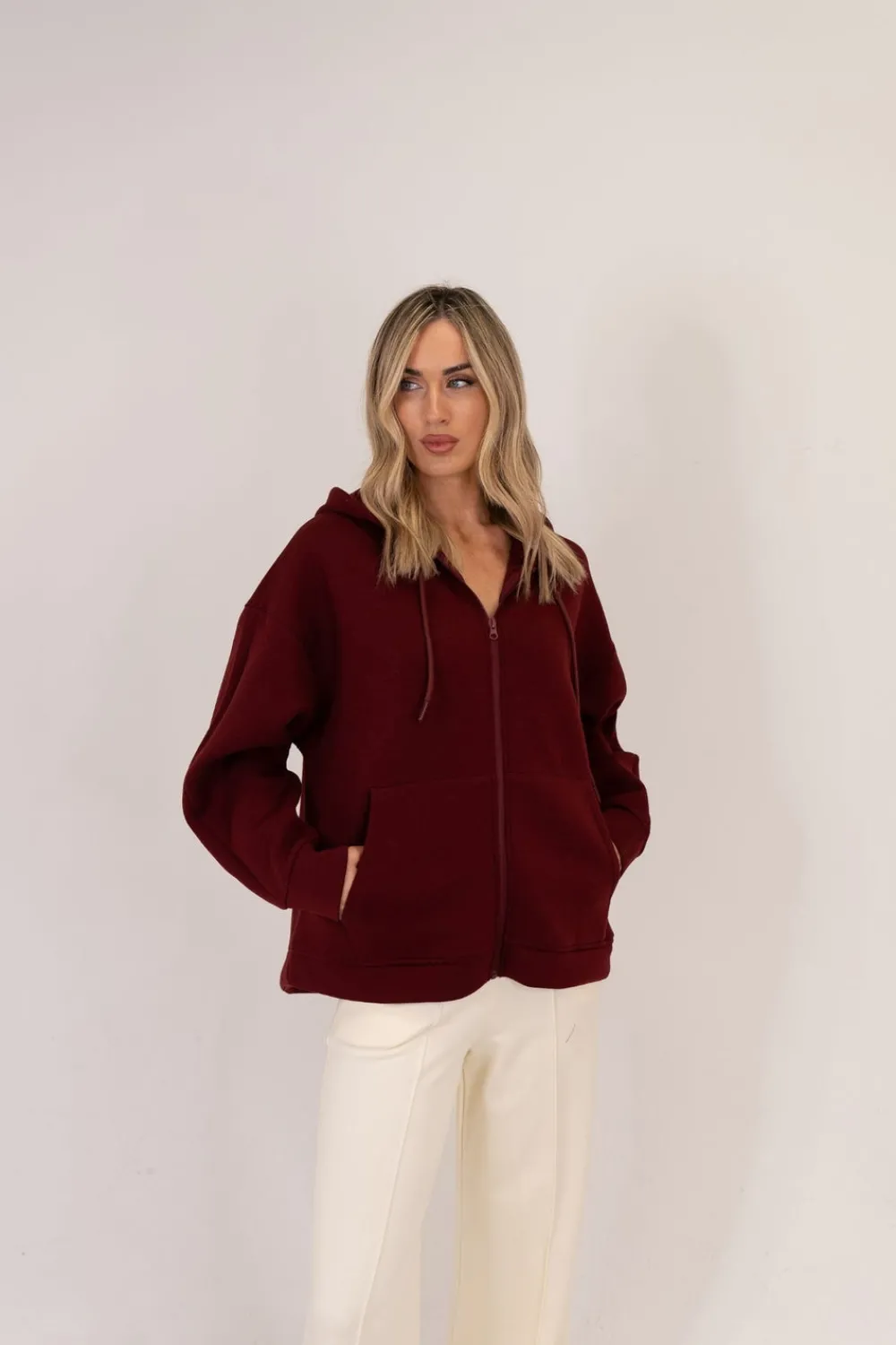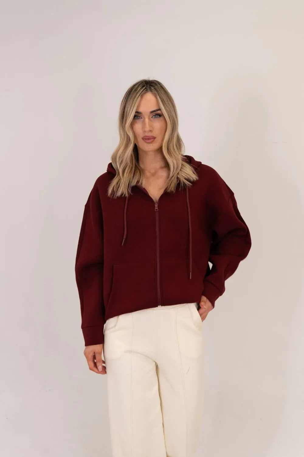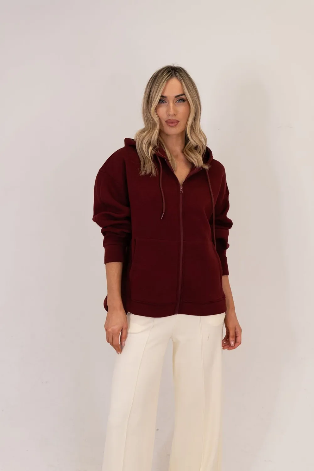 This Taylor Zip Up Hoodie boasts a zip front and drawstring hood for easy wearing and adjusting. With large front pockets and a drop shoulder, it’s perfect for carrying essentials and adding a relaxed look. Fitted cuffs ensure a cosy fit while the deep bordeaux colour adds a touch of sophistication.