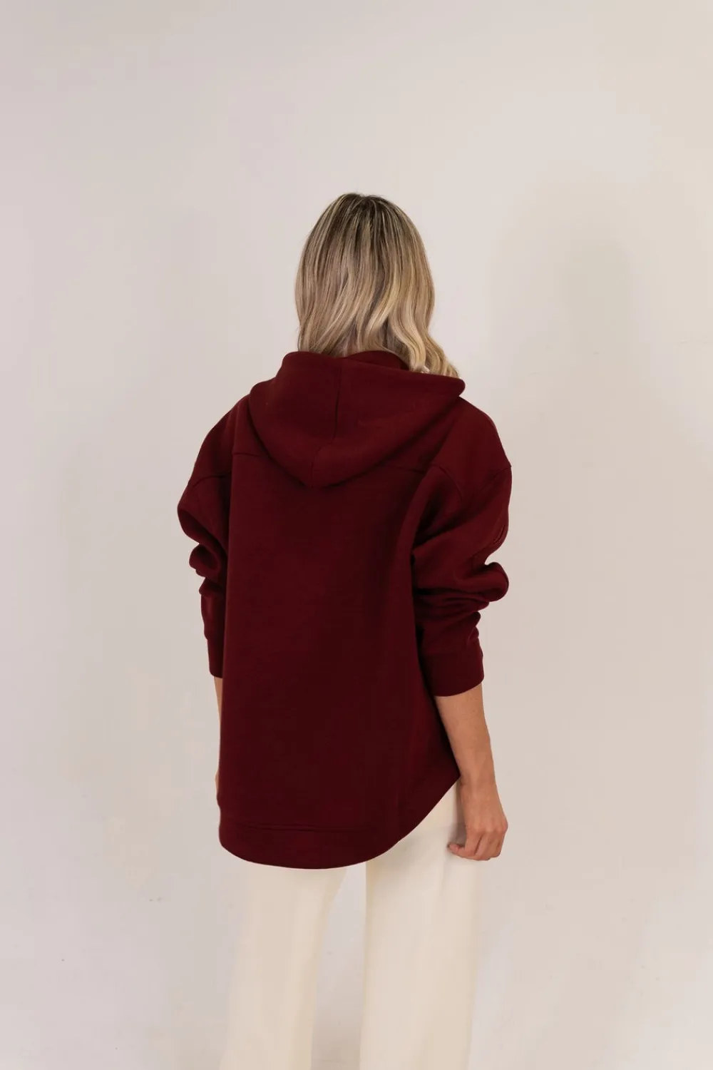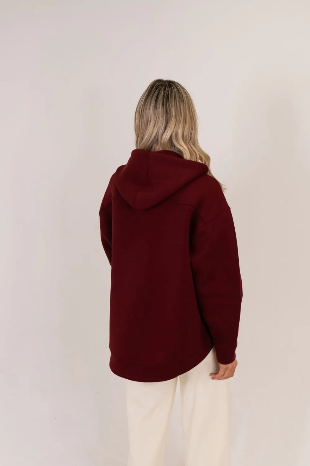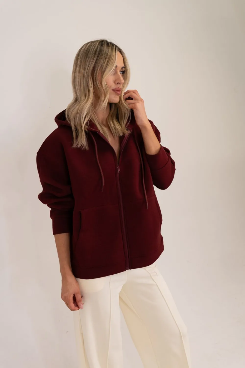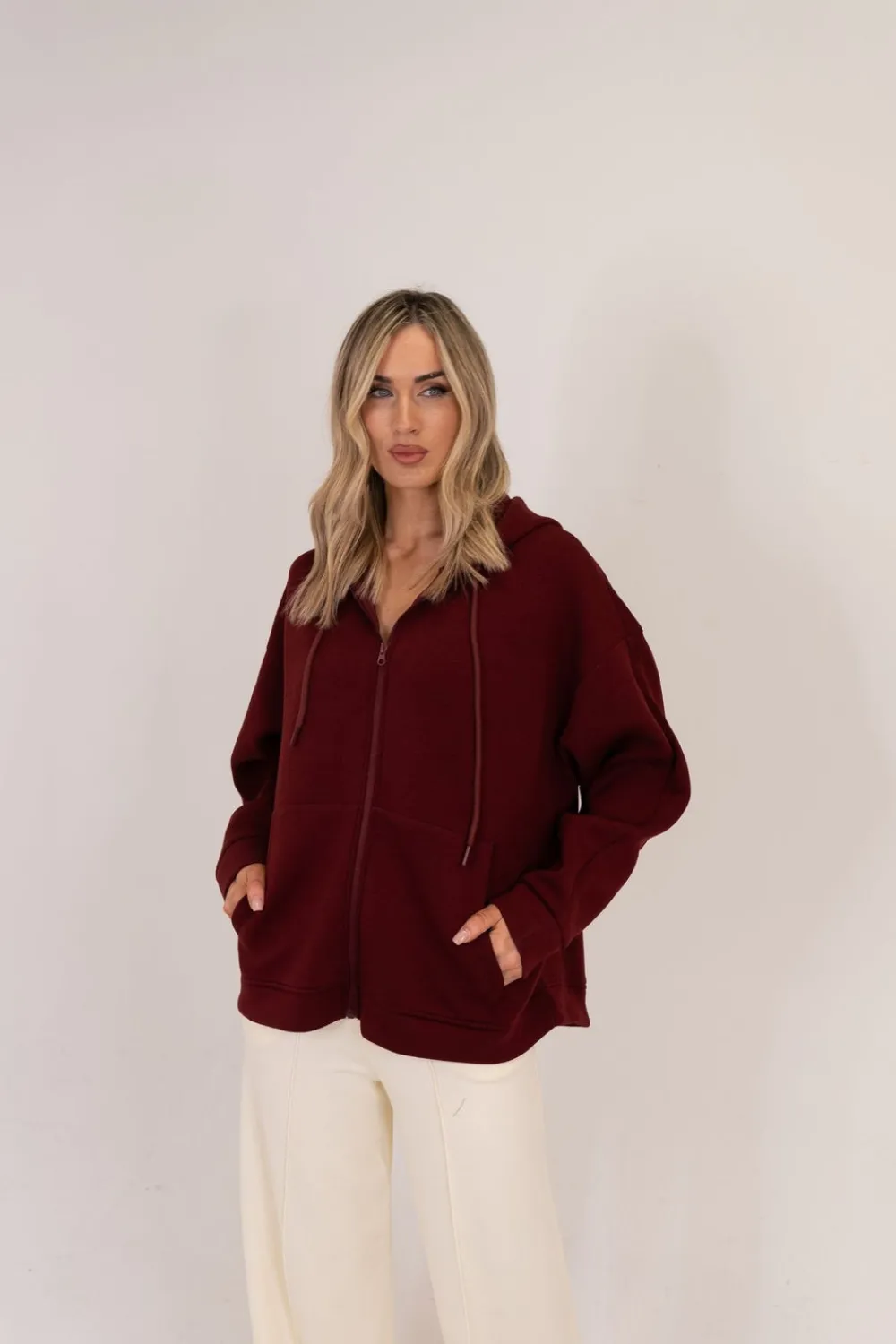 This Taylor Zip Up Hoodie boasts a zip front and drawstring hood for easy wearing and adjusting. With large front pockets and a drop shoulder, it’s perfect for carrying essentials and adding a relaxed look. Fitted cuffs ensure a cosy fit while the deep bordeaux colour adds a touch of sophistication.