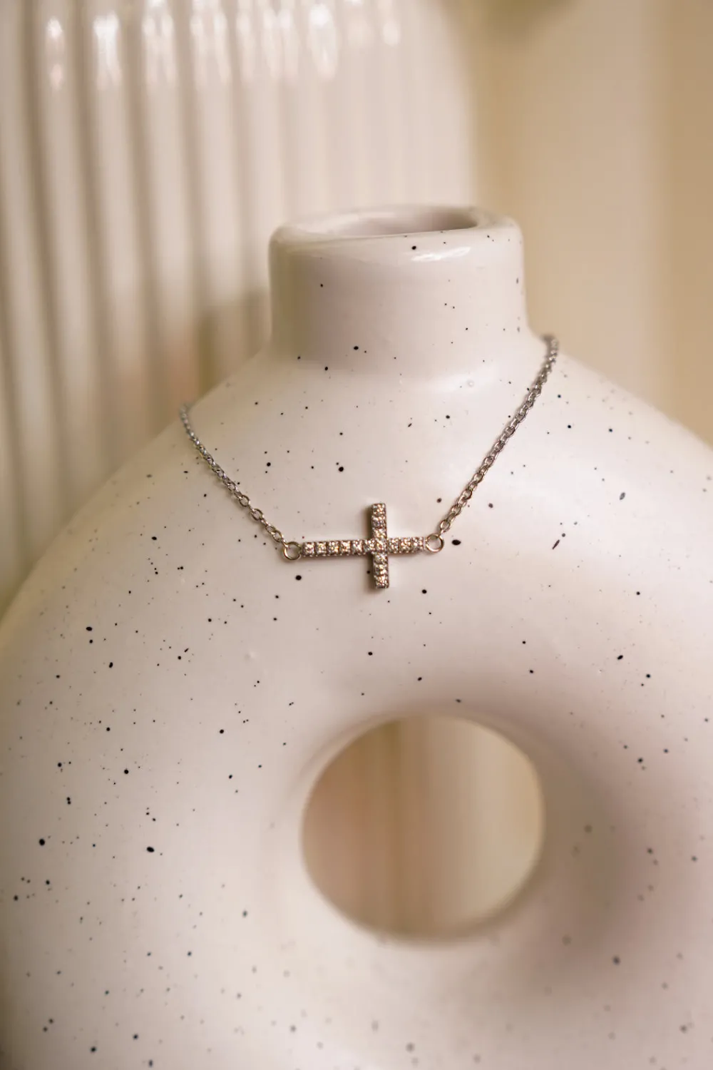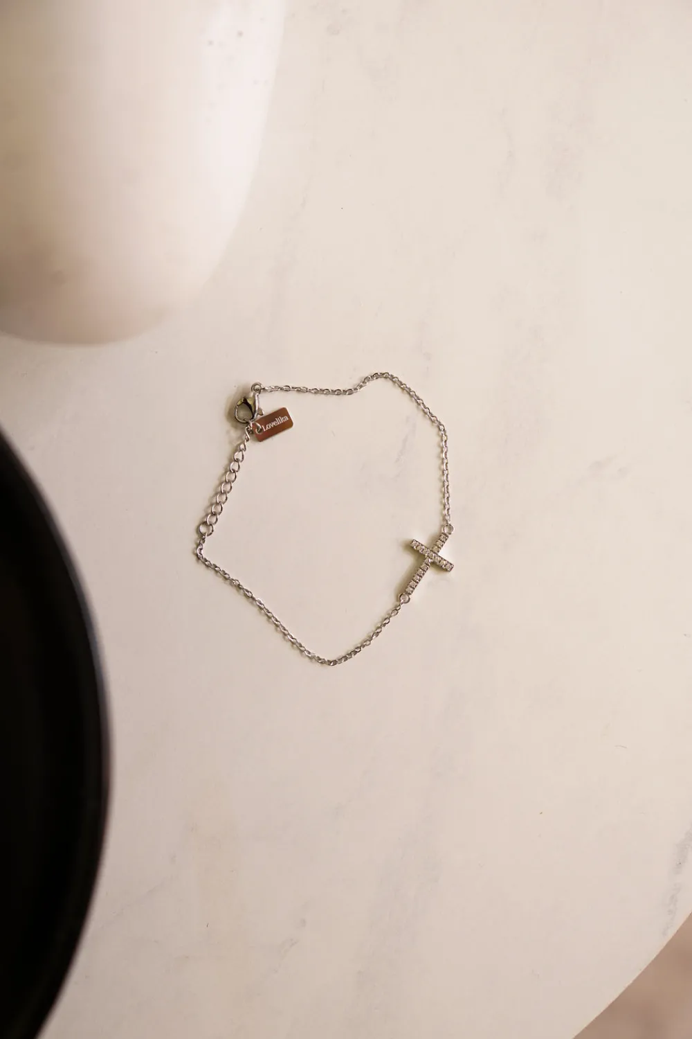 This Olive Cross Bracelet in Silver is a stylish and versatile piece for any outfit. Made with high-quality stainless steel and adorned with a sparkling diamanté cross, this one-size bracelet offers both durability and elegance. Complete the look with the matching necklace for a cohesive and chic ensemble.