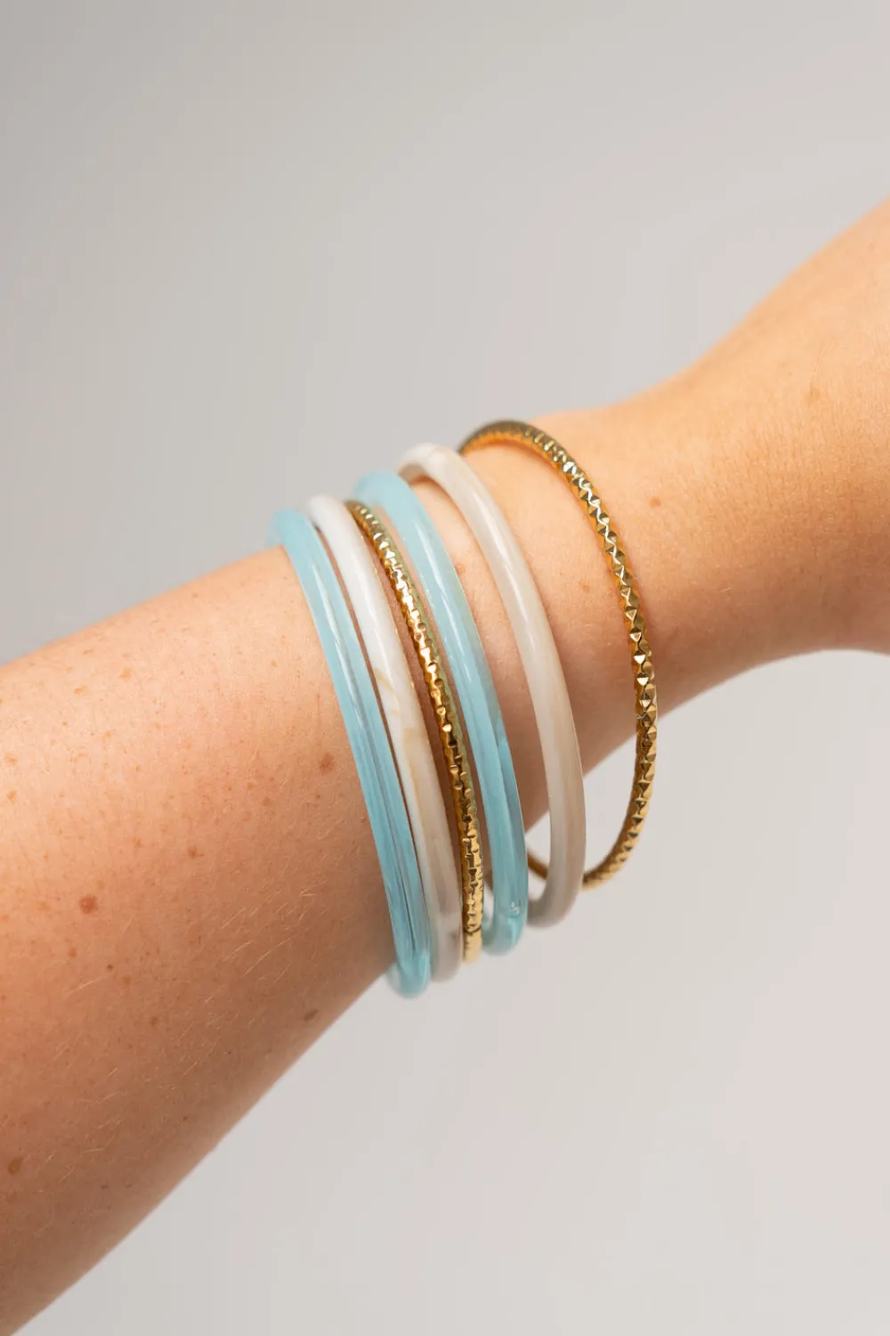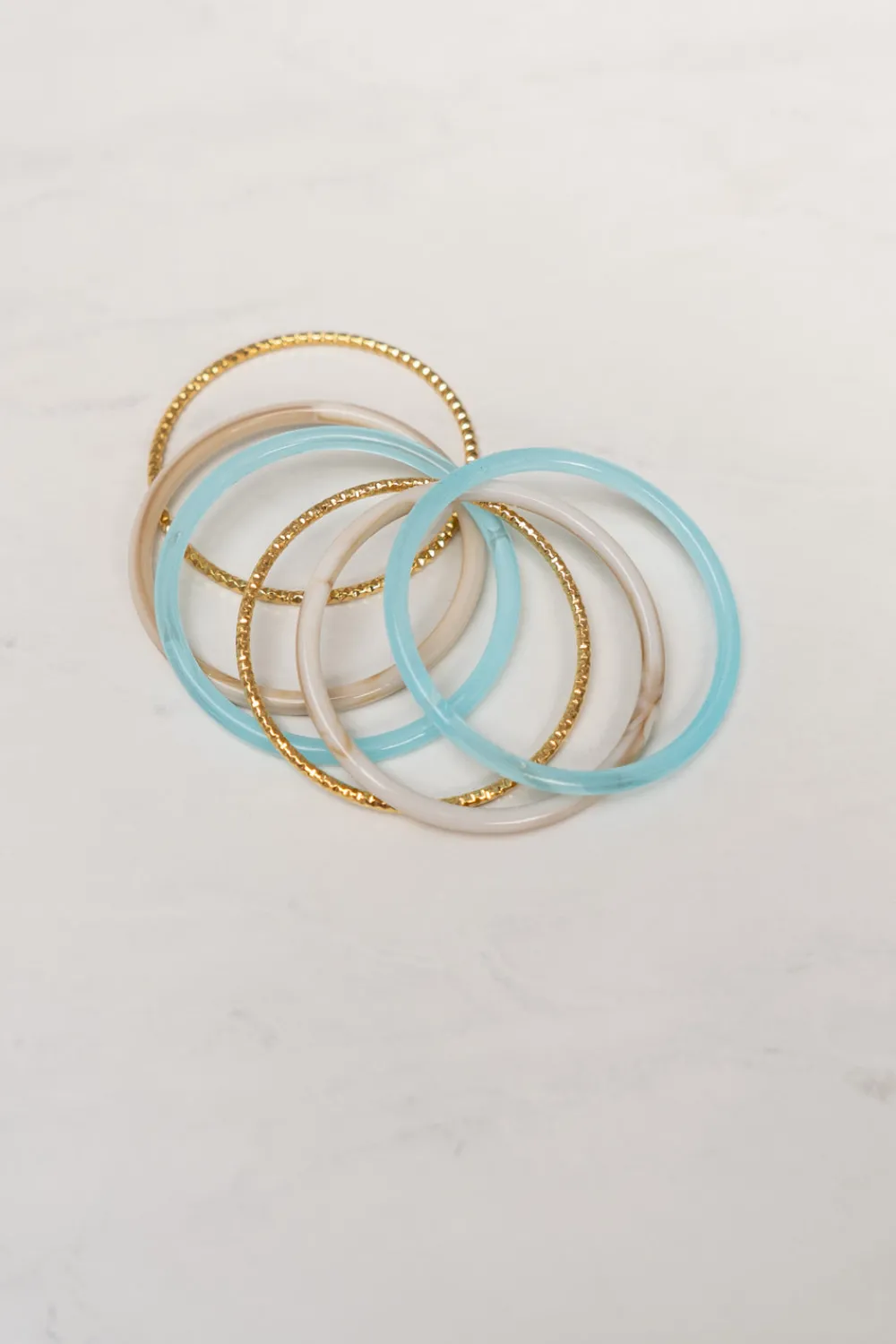 The Olive Gold Mix Bangle Stack in Blue is a stunning accessory that effortlessly adds elegance to any outfit. This set of 6 bangles includes 2 blue, 2 neutral, and 2 gold bangles, all made with high-quality synthetic materials. Designed to fit comfortably with a diameter of 7cm, these bangles are perfect for any occasion.
