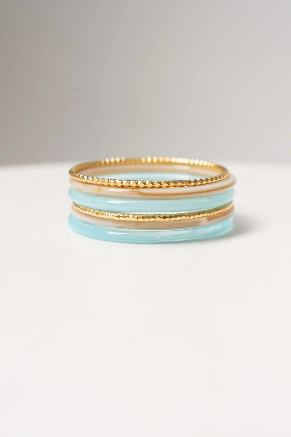 Enhance your accessory game with the Olive Gold Mix Bangle Stack in Fuchsia. This set of 6 bangles features a variety of colours and a sturdy synthetic material. With a comfortable diameter of 7cm, these bangles are one size fits all. Elevate any outfit with a pop of pink or neutral tones.