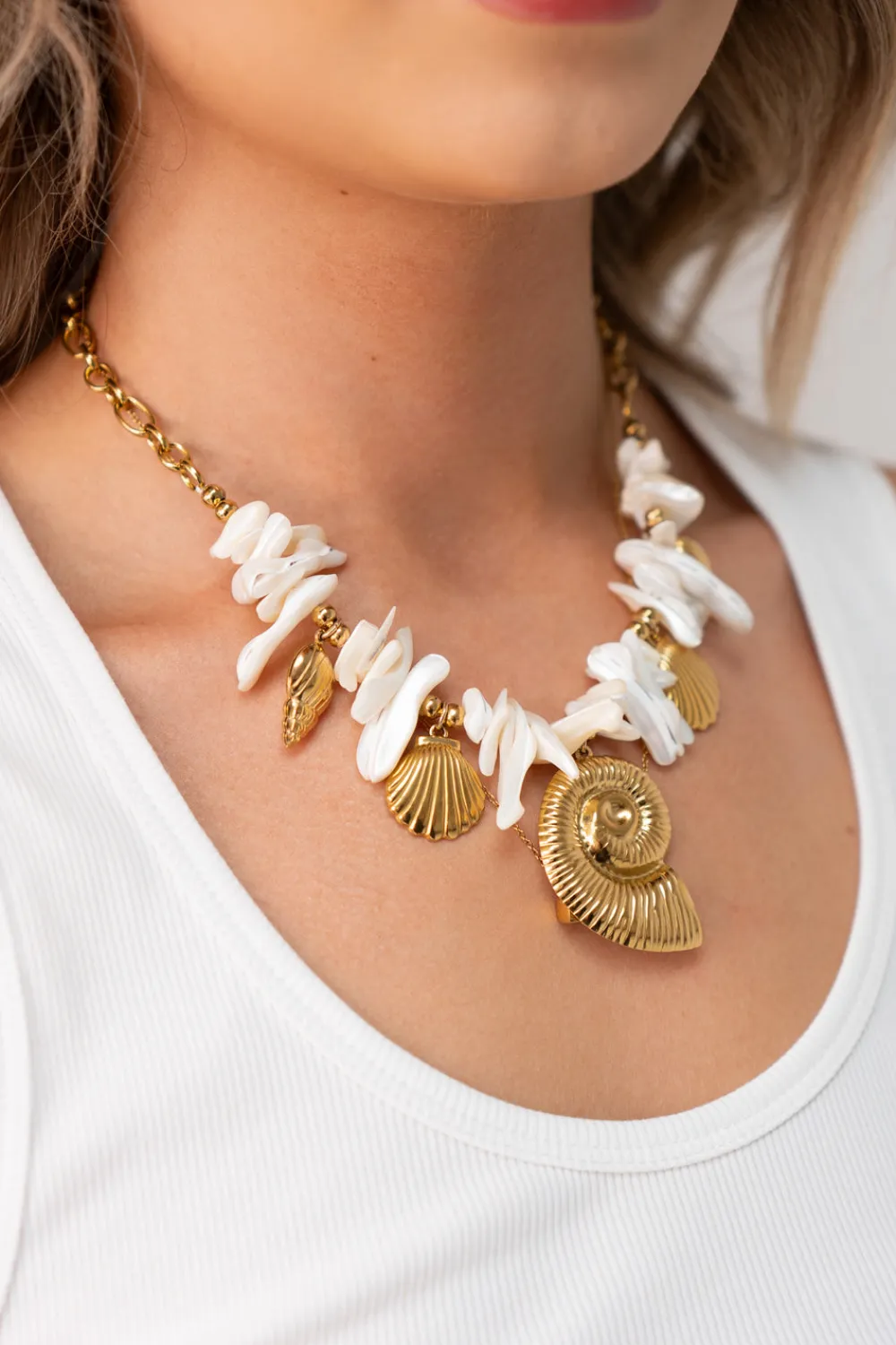 Elevate your ensemble with this sophisticated Olive Multi Shell Necklace in Gold. Crafted from premium stainless steel with an elegant gold finish, this versatile piece features multiple shell charms for a refined coastal aesthetic. The adjustable clasp ensures perfect positioning for any neckline, while the one-size design offers universal wearability. A timeless accessory that transitions effortlessly from casual daywear to evening elegance.