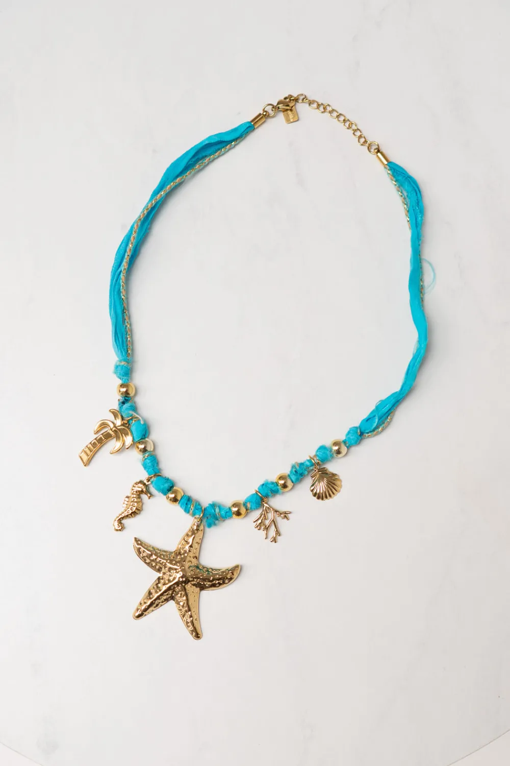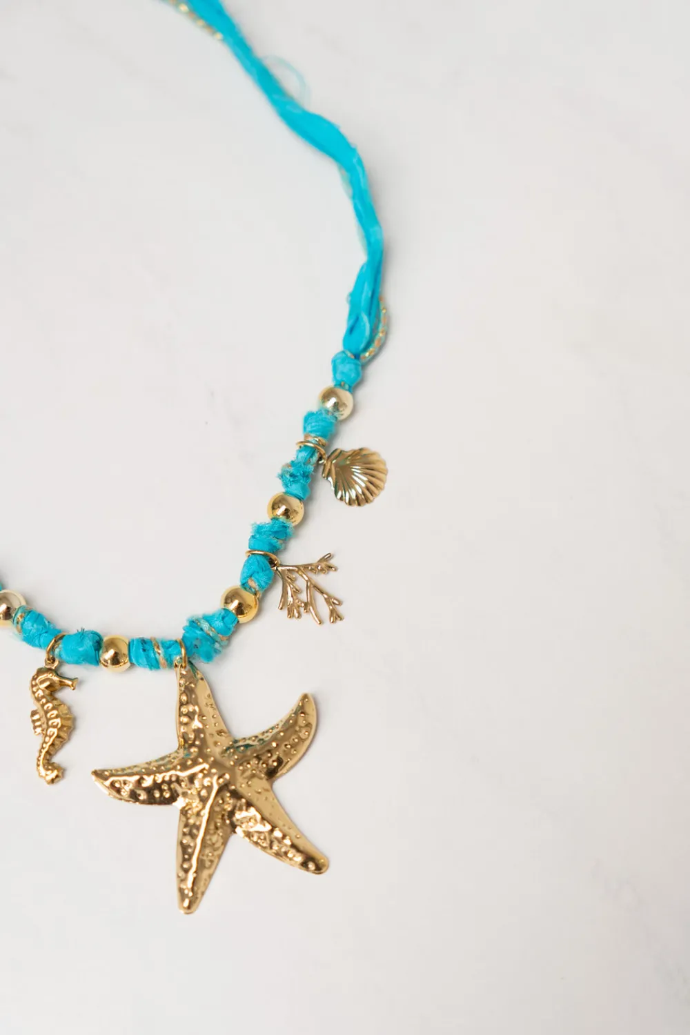 Crafted with a gold-coloured stainless steel charm in the shape of a starfish, this beaded and fabric layered necklace is a stunning addition to any outfit. The beautiful turquoise beads add a pop of colour, and the adjustable clasp closure ensures a perfect fit for all. Wear this one-size necklace for a touch of beachy elegance.