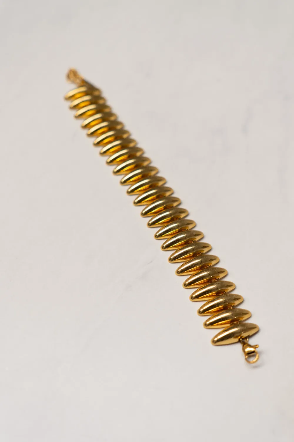 This Olive Torpedo Link Bracelet in Gold is the perfect addition to any jewellery collection with its sleek stainless steel design and easy-to-use clasp closure. With a width of 2cm and adjustable length up to 22cm, it fits comfortably on any wrist. Elevate your style with this timeless piece.