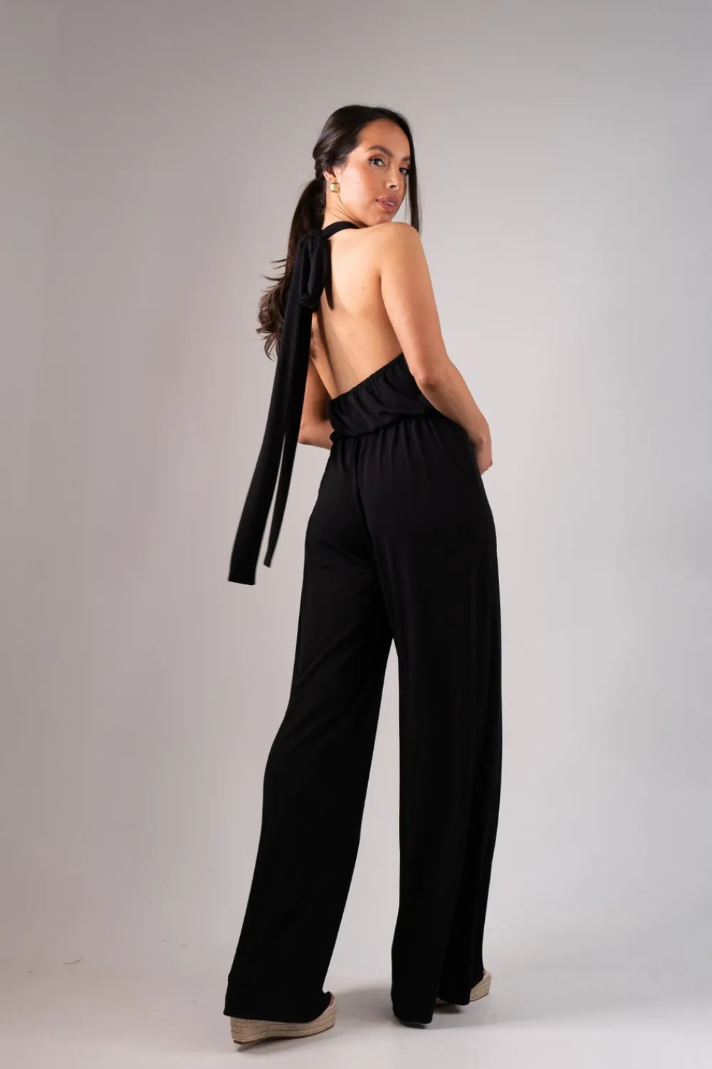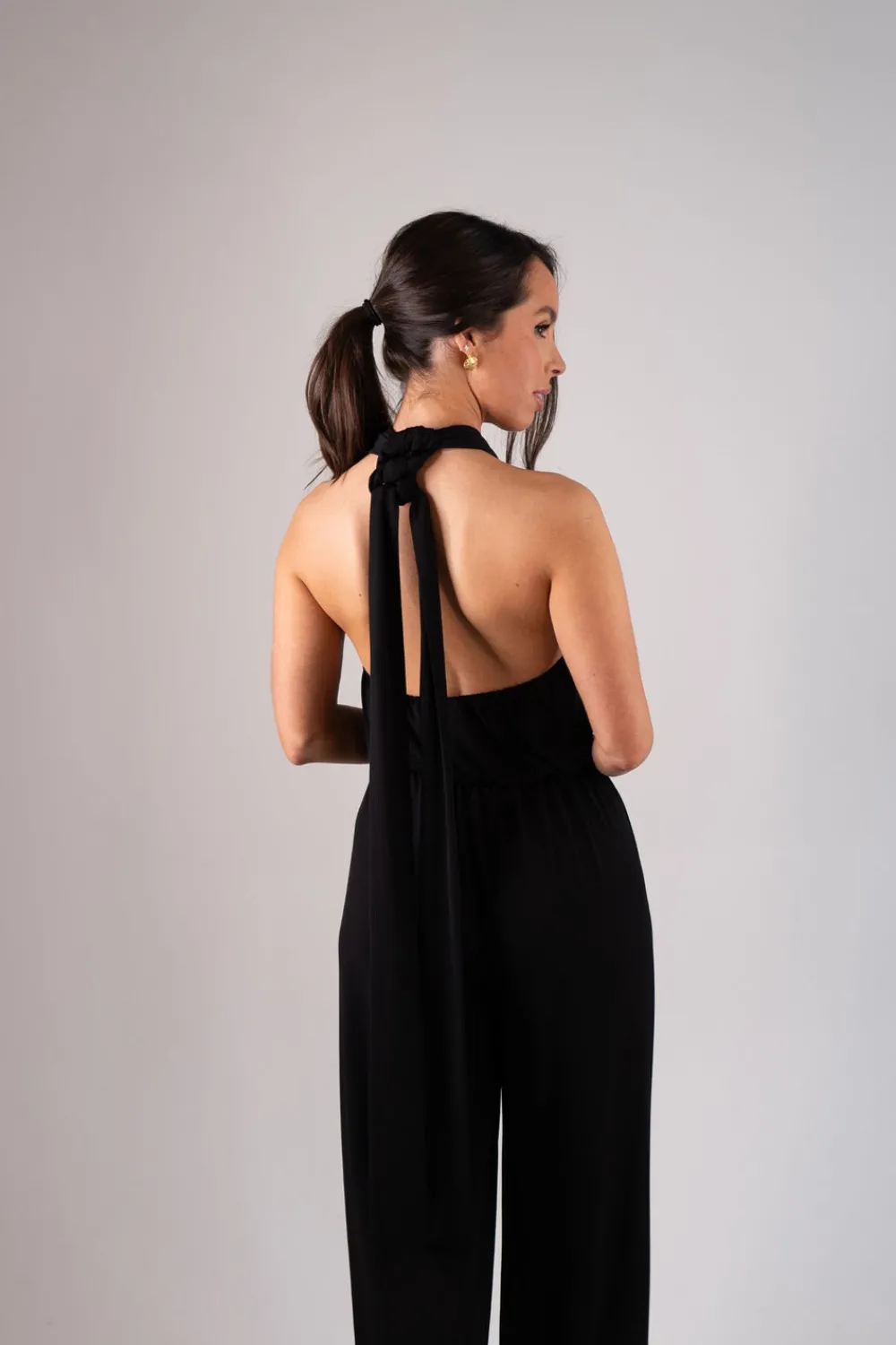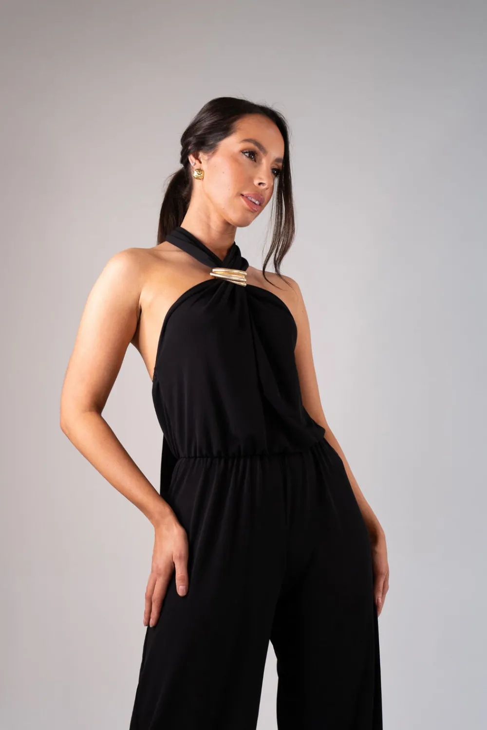 This black Alana halter jumpsuit features a straight leg design and halter neck style with a gold detail twist front. The elasticated back provides a comfortable fit, while the tie detail adds a touch of elegance. Complete with a zip closure, this versatile jumpsuit is perfect for any occasion.
