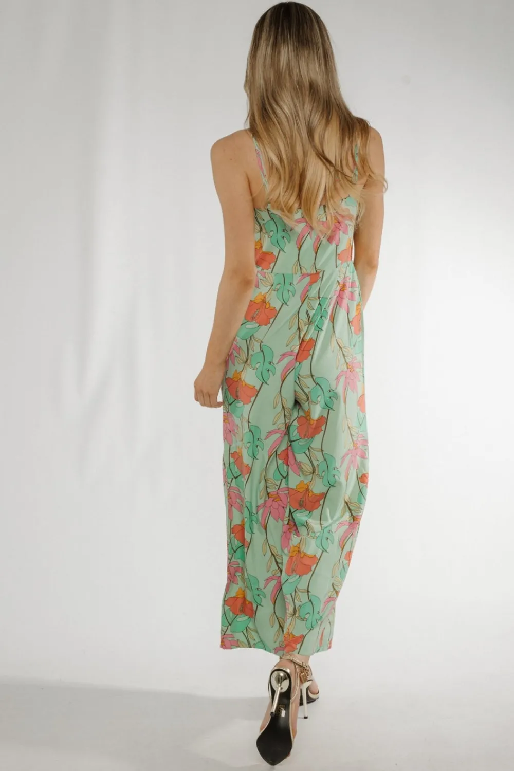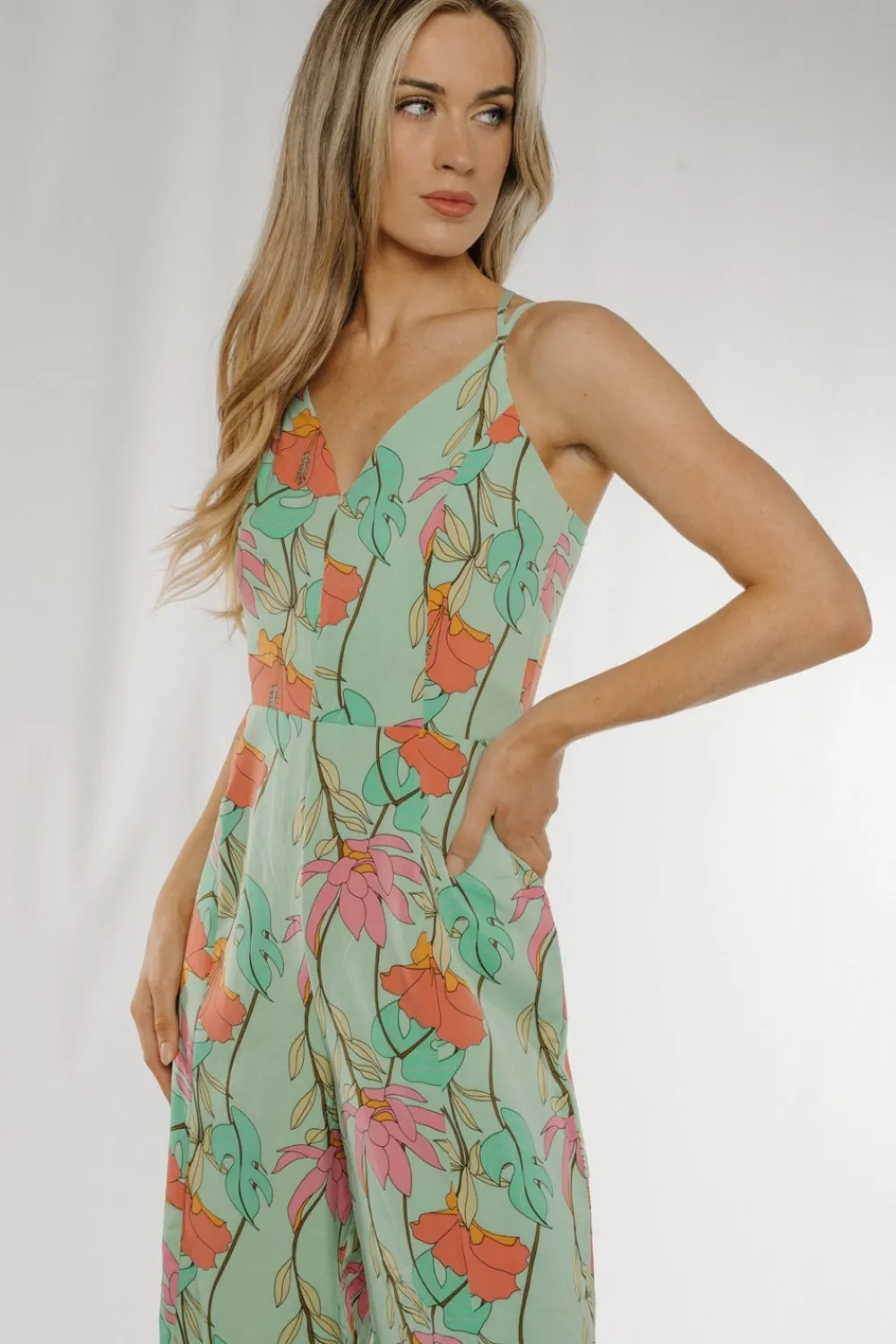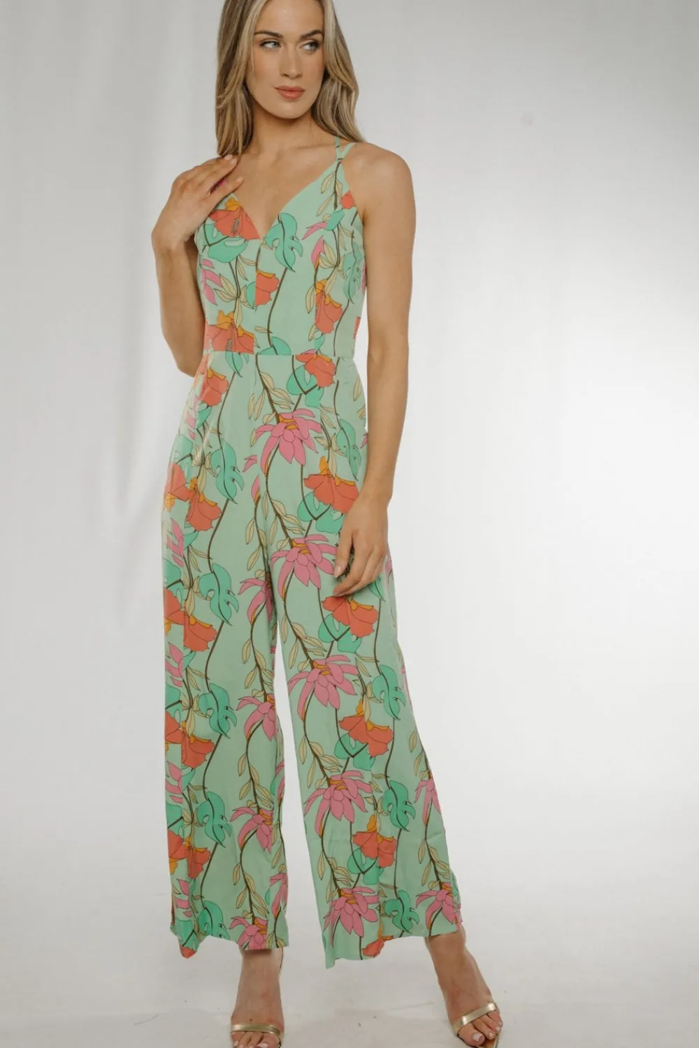 Wide Leg Green Floral V-Neck Cross Back Detail
