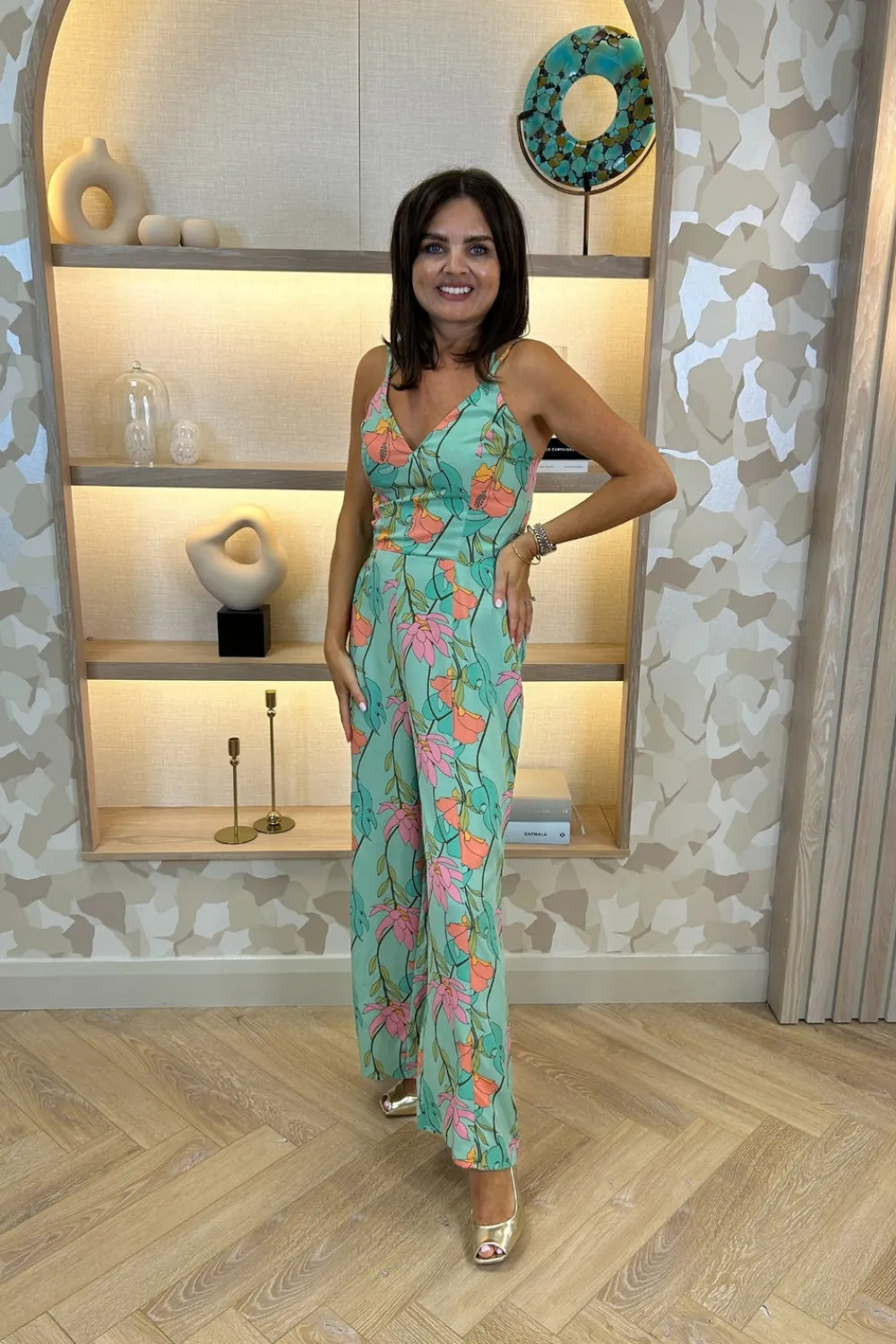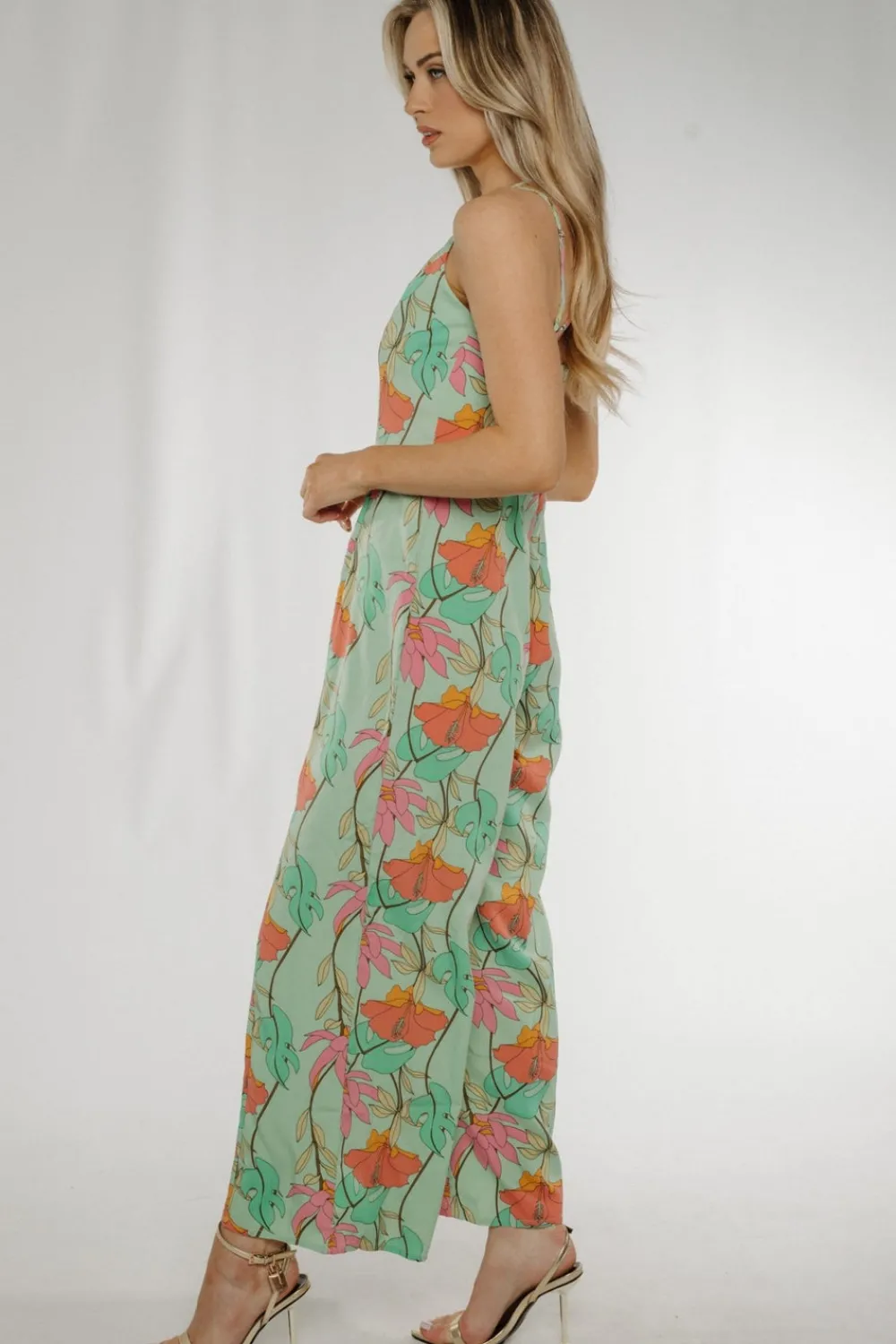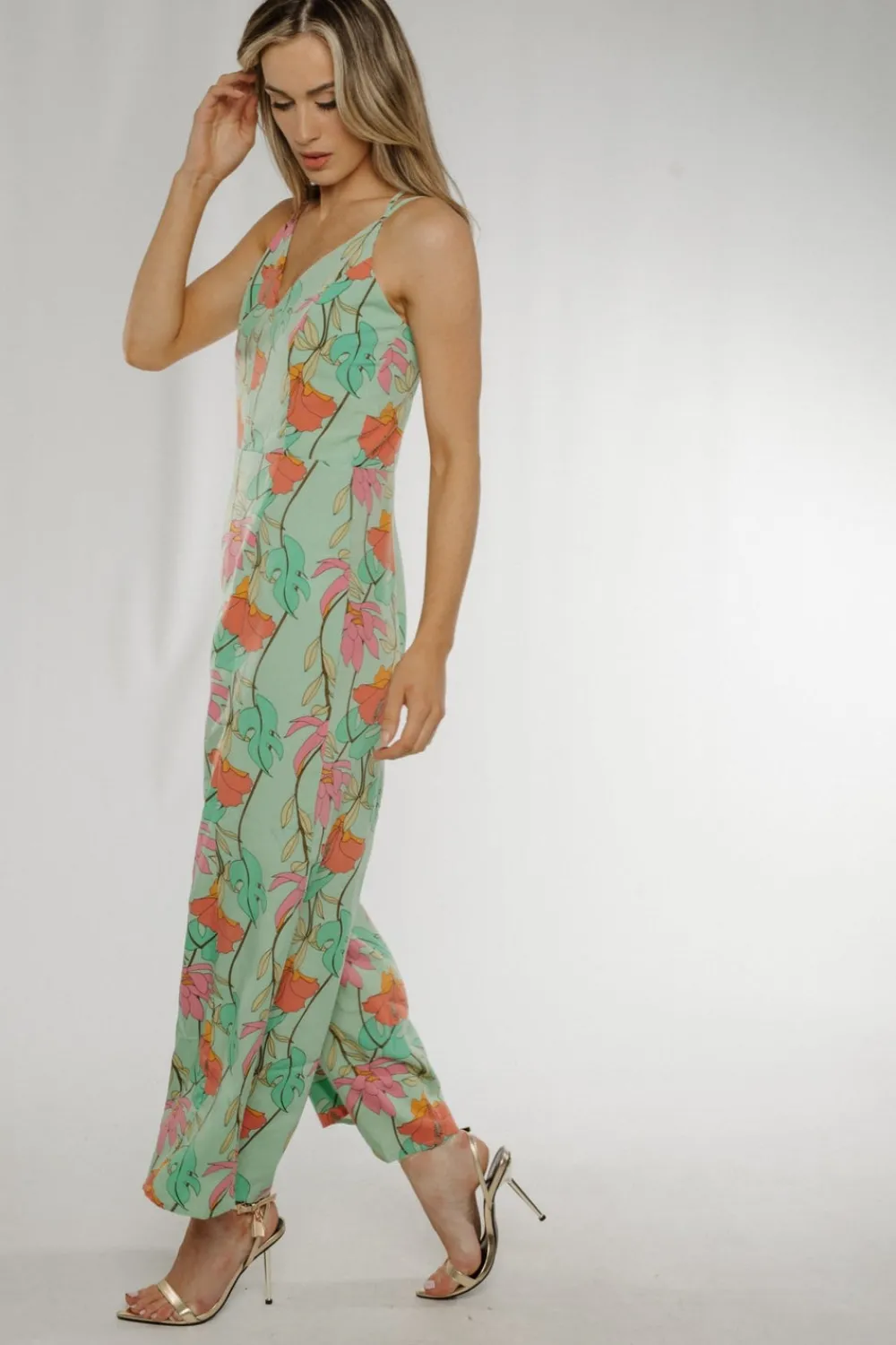 Wide Leg Green Floral V-Neck Cross Back Detail