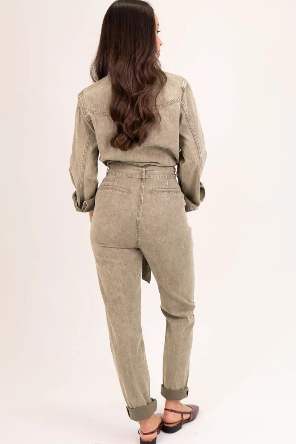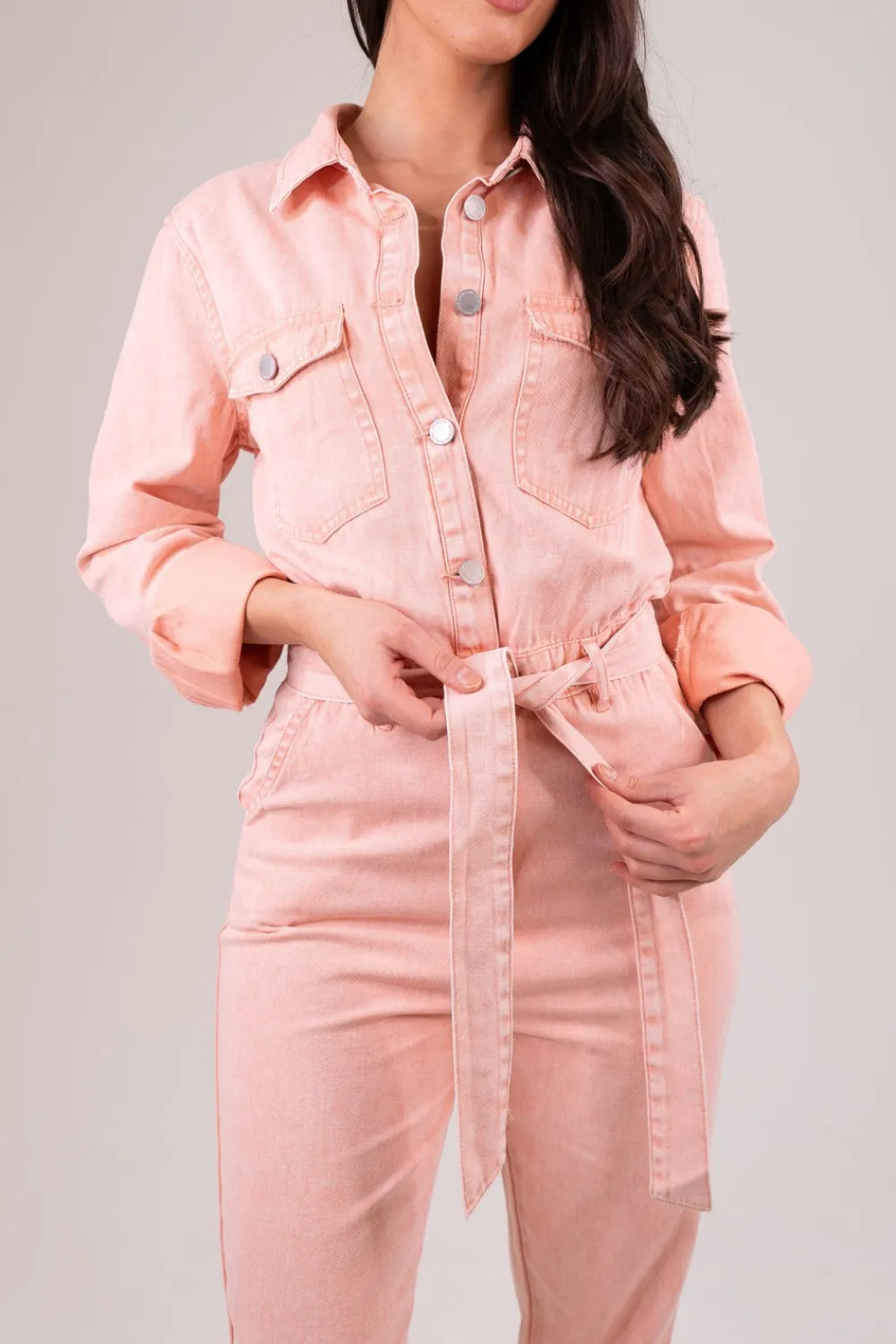 Expertly tailored with a tie waist, button front, and a classic collar, our Cora Jumpsuit in Rose Pink is a versatile and timeless piece. Made from soft and durable rose pink denim, it features a straight leg and convenient pockets, making it the perfect addition to any wardrobe.