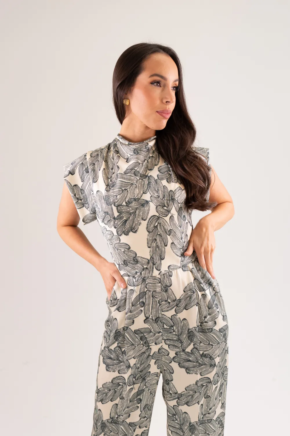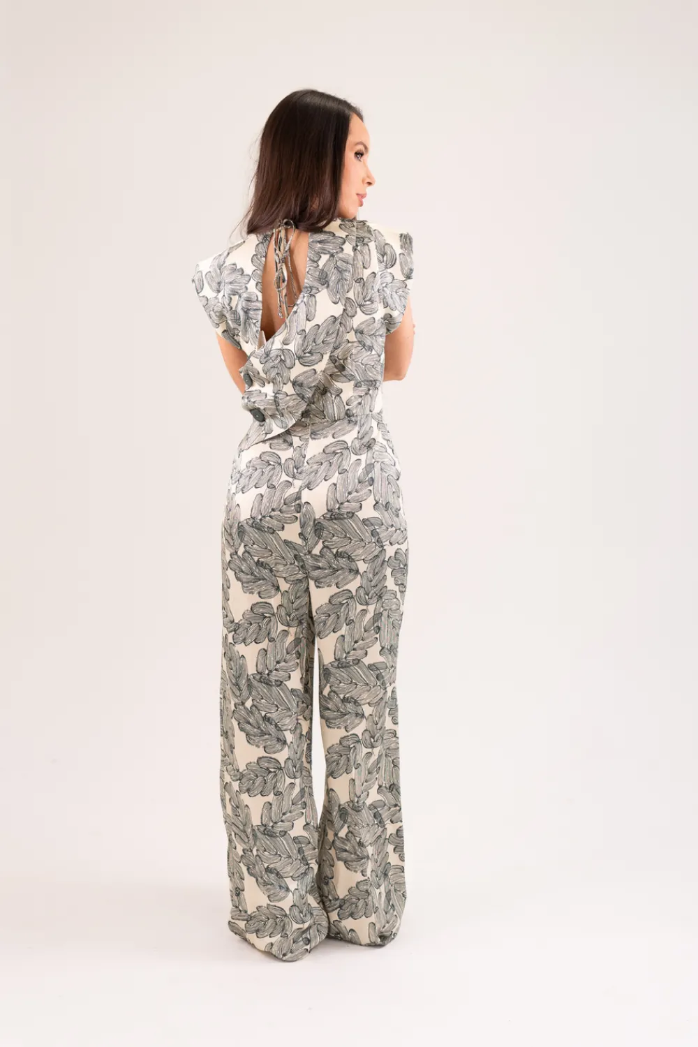 Expertly crafted for the modern fashionista, the Kayla Printed Satin Jumpsuit features a flattering pleat front and convenient pockets. The round neck and cap sleeves add a touch of elegance, while the wide leg design provides comfort and style. The dark green print, button detail, and tie back complete the look with a chic and sophisticated touch.