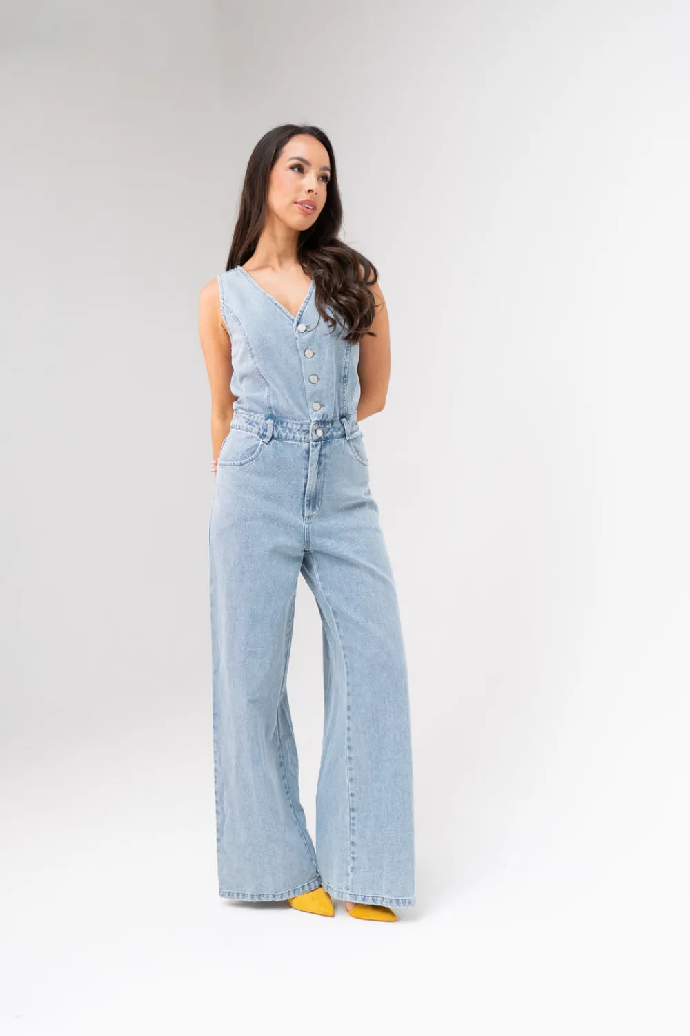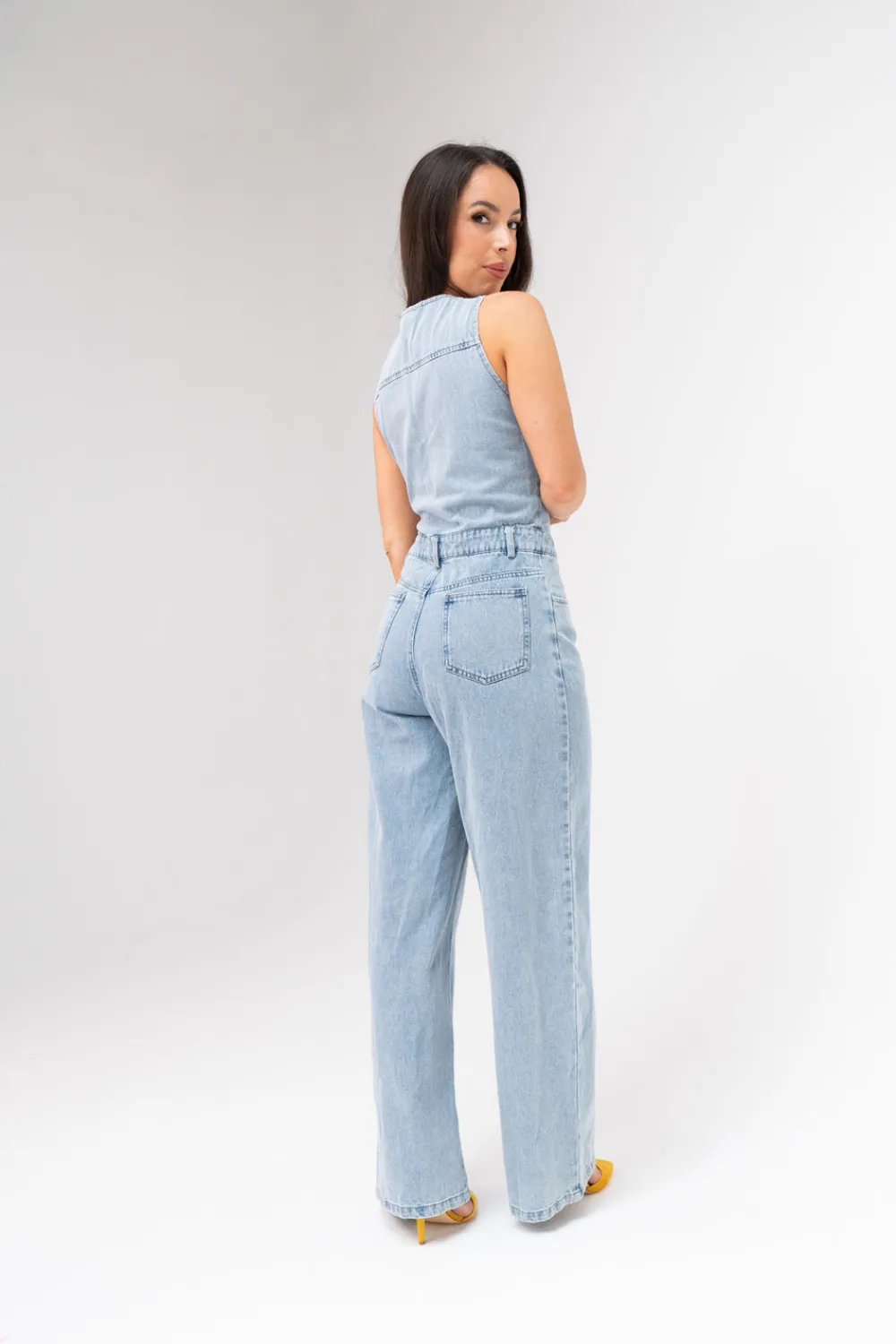 Expertly crafted, the Kendra V-Neck Denim Jumpsuit in Light Wash offers a elegant and versatile addition to your wardrobe. Featuring a flattering V-neckline, functional button front, and convenient pockets, this sleeveless jumpsuit is designed for both style and practicality. Made with a light wash denim and tailored with a straight leg fit, this jumpsuit is the perfect combination of comfort and chic.