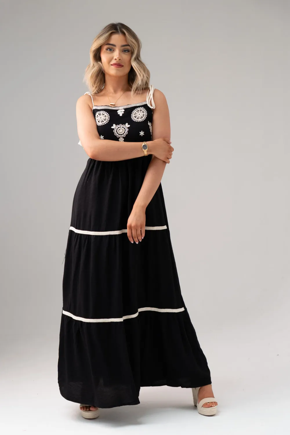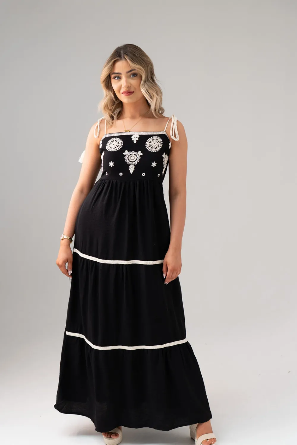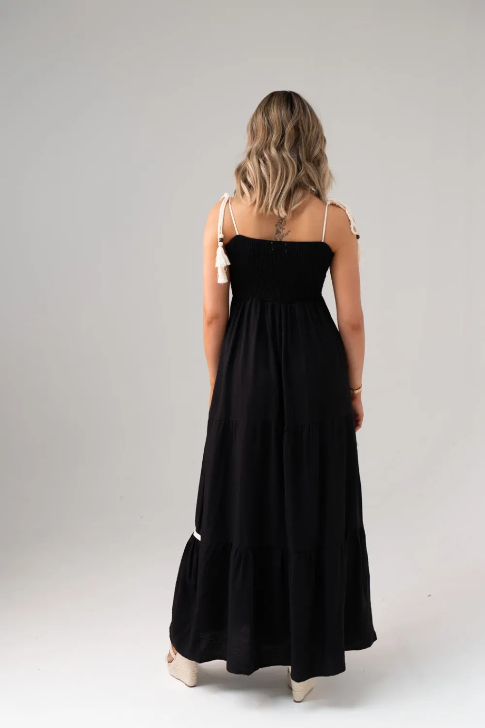 Elevate your wardrobe with our Ally Tiered Maxi Dress in Black Mix. Featuring a sophisticated square neckline and tiered design, this cotton-blend dress combines comfort with elegance. The distinctive tie straps with beaded tassels and white embroidered details create a striking contrast against the black fabric, making this a versatile statement piece for both casual outings and special occasions.