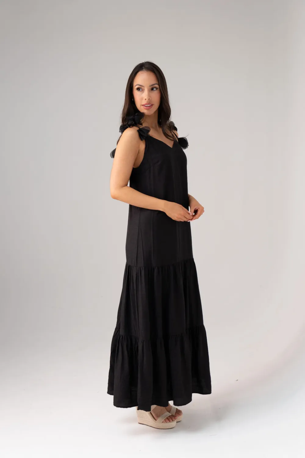 This Connie Tiered Maxi Dress in black features a sophisticated V-neckline and delicate floral-detail fine straps, adding a subtle feminine touch. Its tiered design creates graceful movement and an elegant silhouette, while the maxi length offers timeless style suitable for various occasions. Perfect for those seeking a refined yet effortless look.