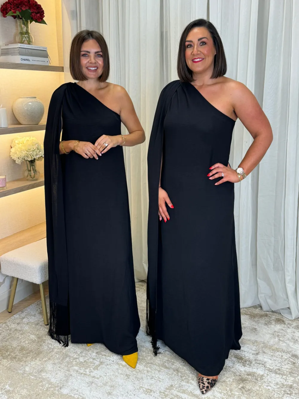 This Frankie One Shoulder Maxi Dress in Black offers a sleek and elegant silhouette with its one shoulder design and maxi length. The drape detail and fringing add a touch of texture, while the stretch crepe fabric ensures a comfortable fit. A must-have addition to any wardrobe.