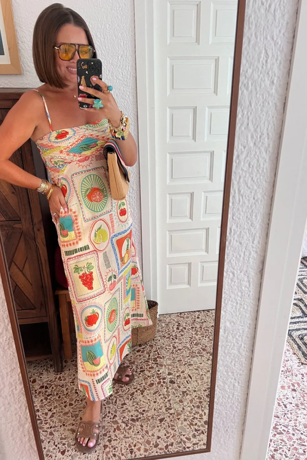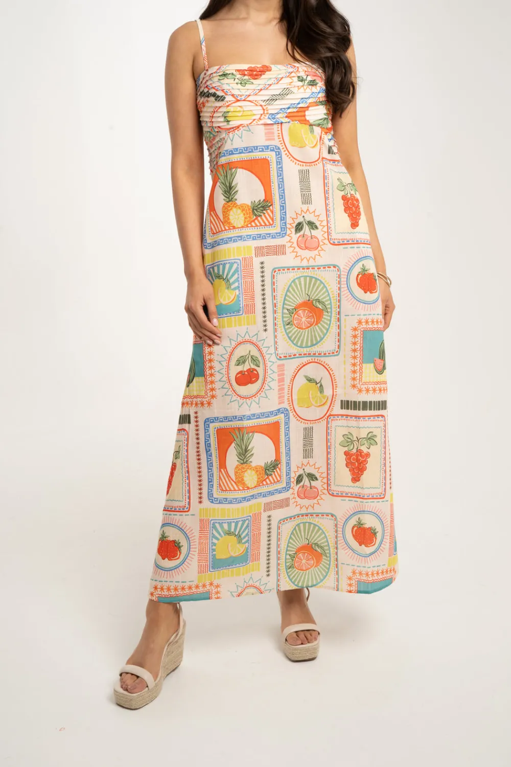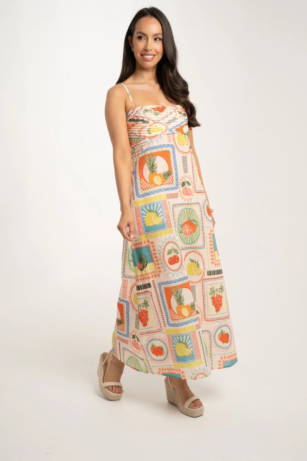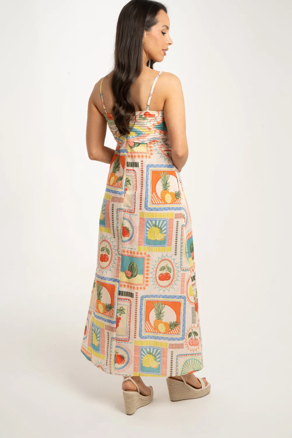 Introducing the Holly Fruit Print Dress In Multi! Designed with a ruched bodice, fine adjustable straps, and an elasticated back, this dress provides a comfortable and flattering fit. The vibrant multi-coloured fruit print adds a playful touch. Perfect for a sunny day out, this maxi dress will become a staple in your wardrobe.