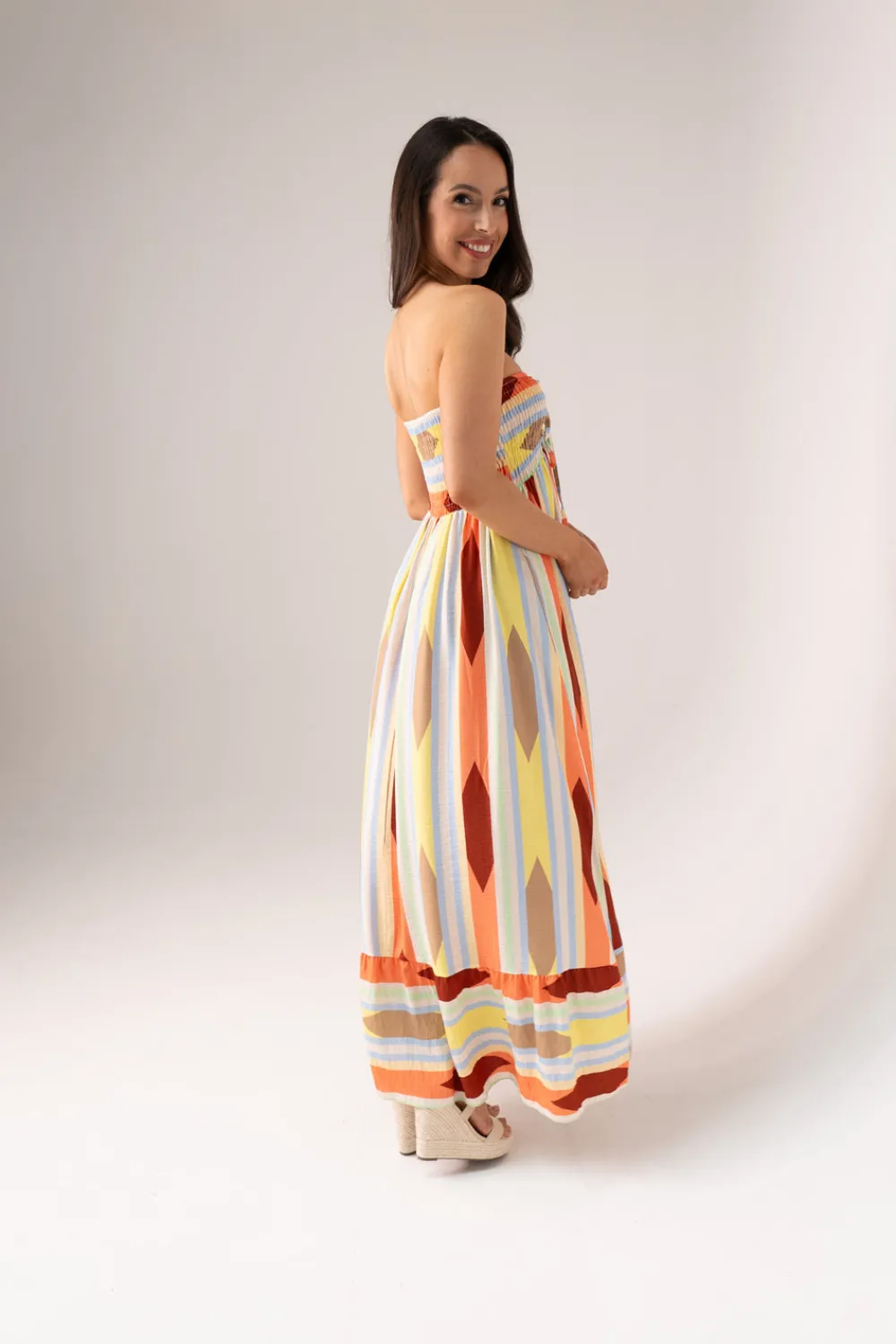 This strapless maxi dress features a tiered design and an elasticated bust for a comfortable, secure fit. Its vibrant multi-colour print adds a lively touch, making it a versatile choice for various occasions. Designed to fit sizes 8 to 14, this one-size dress combines style and ease effortlessly.