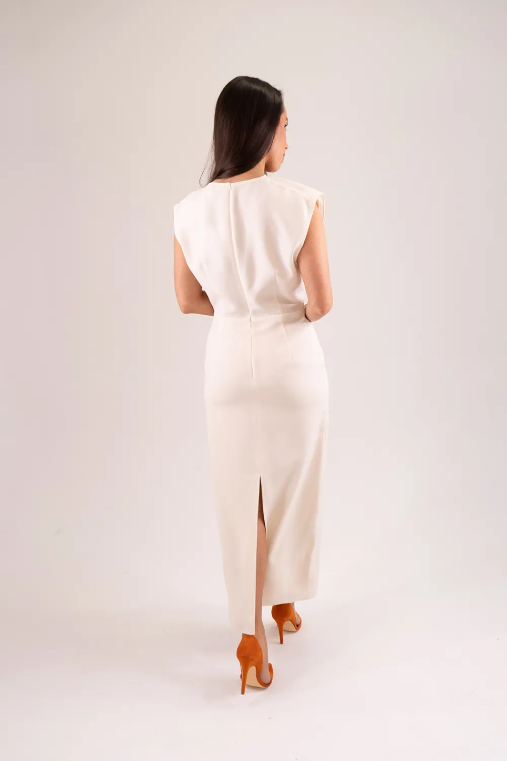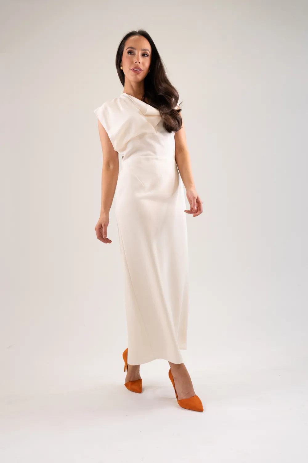 Introducing our Kayla Layered Cowl Dress in Cream. This elegant dress features a sleeveless design, a drape effect cowl, and a round neckline. The back zip and back split add a touch of sophistication, while the cream colour gives a classic and timeless look. Perfect for any formal occasion, this dress is sure to make you stand out.