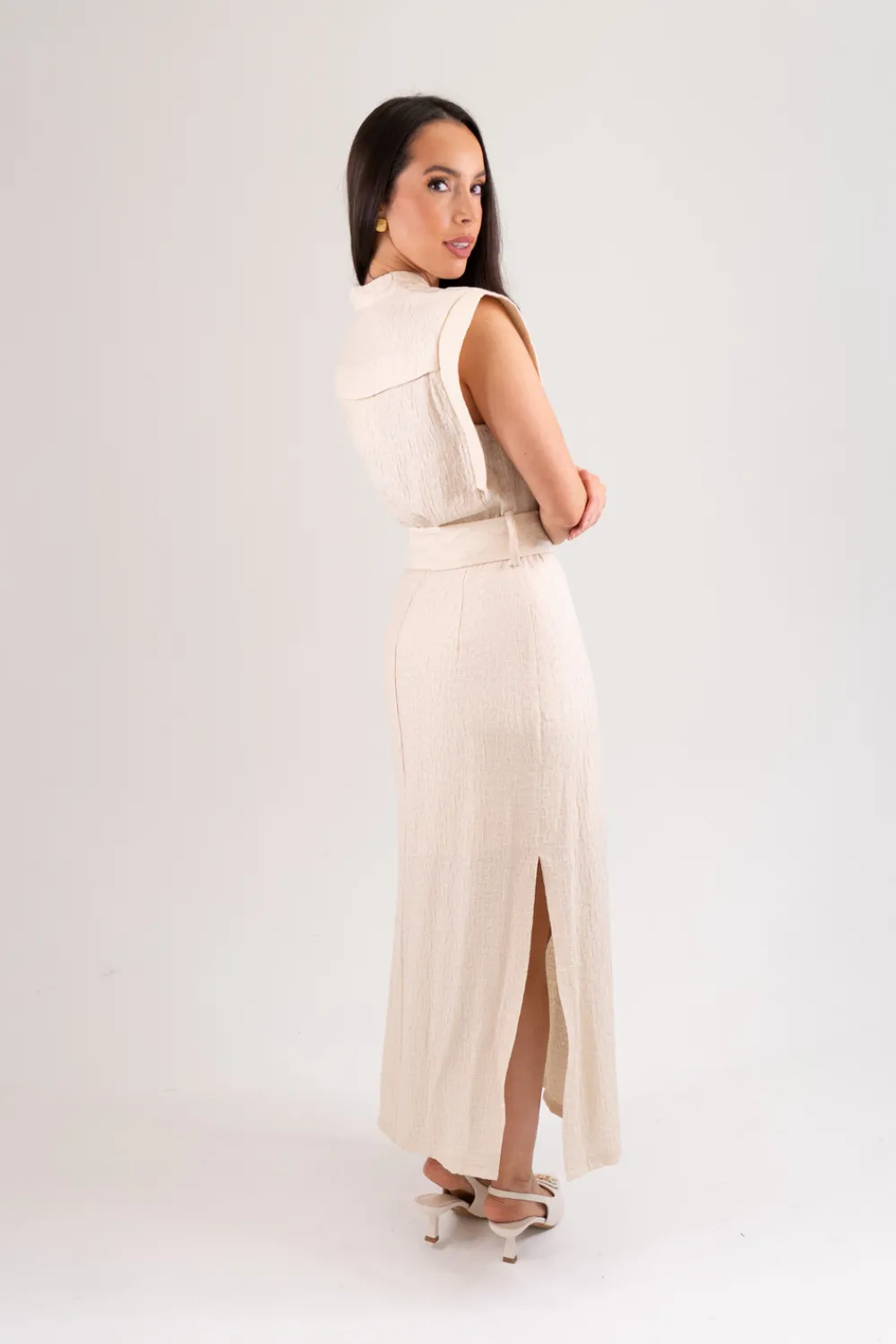 The Kayla Tie Waist Dress In Neutral is the perfect blend of style and comfort. Featuring a flattering V-neck and cap sleeves, this midi dress also boasts pleated detailing at the bust and a textured fabric. The concealed side zip and detachable tie belt add functionality to this neutral-coloured dress.