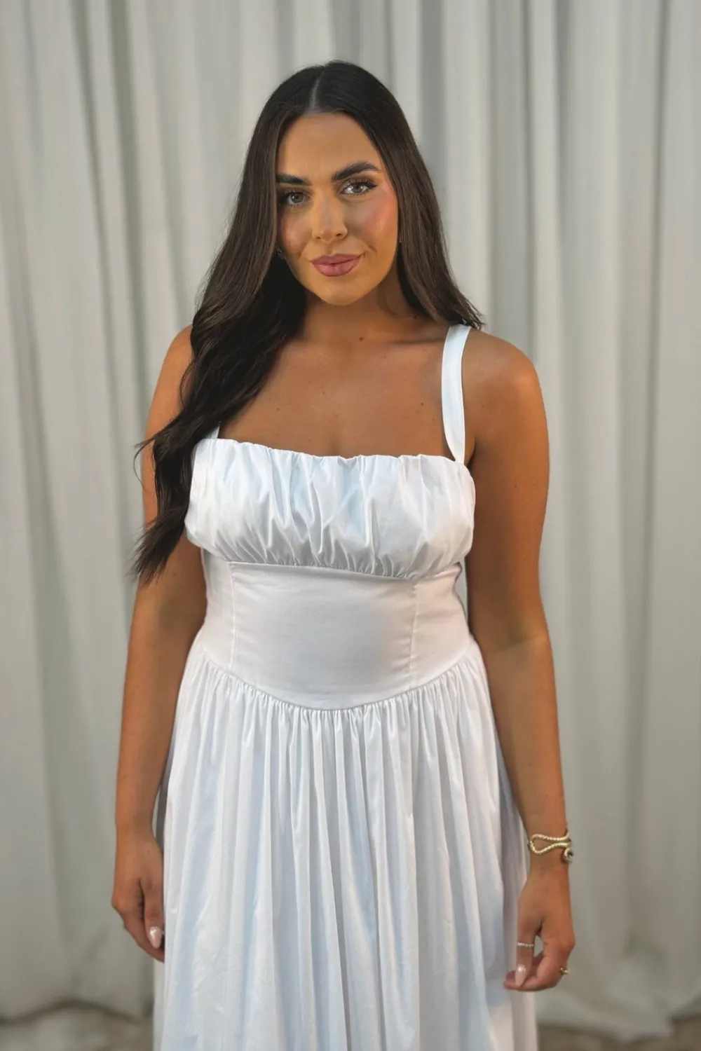 Expertly designed for the perfect fit, the Erica Corset Waist Midi Dress features thicker straps for added support and a corset-style waist to accentuate your figure. The elegant white colour and elasticated back make this a versatile and comfortable option for any occasion.