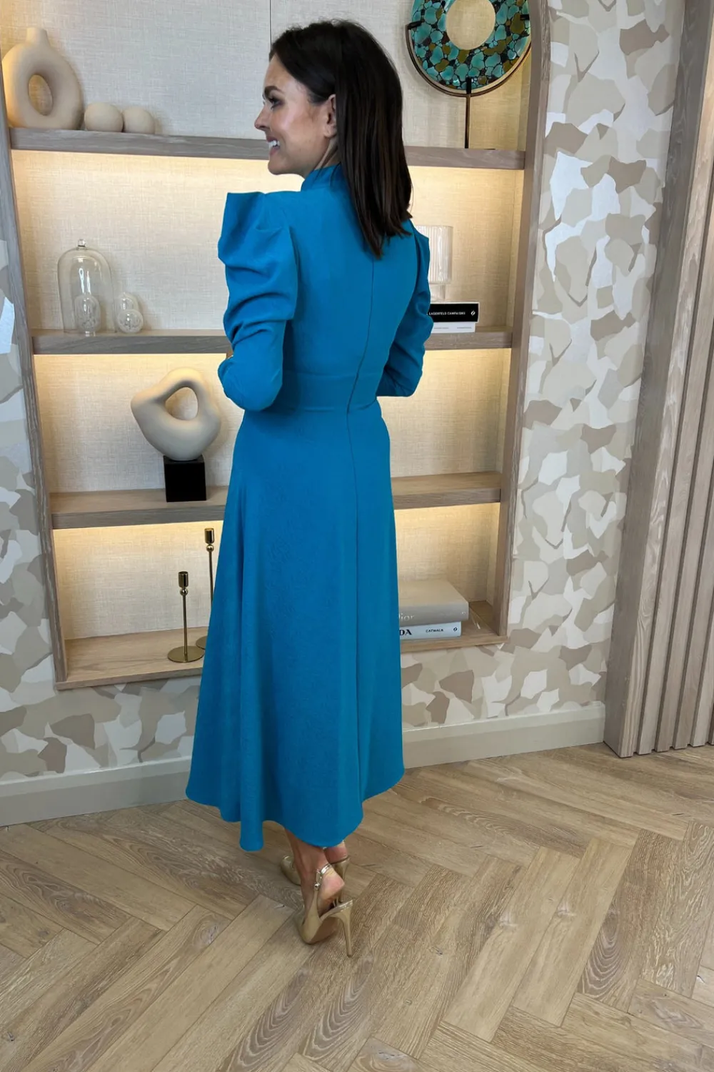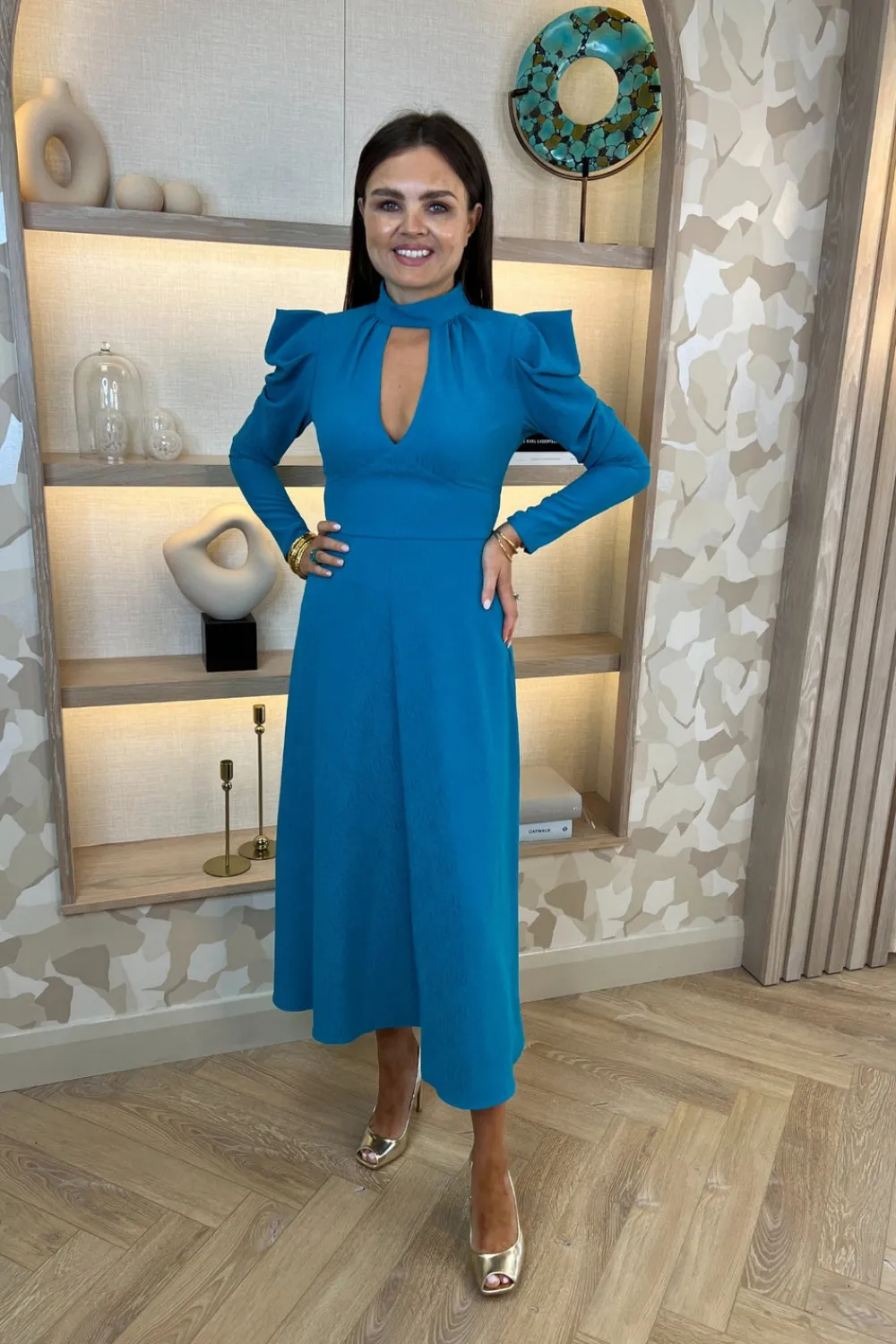 Ruching At ShoulderConcealed Back ZipHigh Neck Cut Out DetailSubtle Print