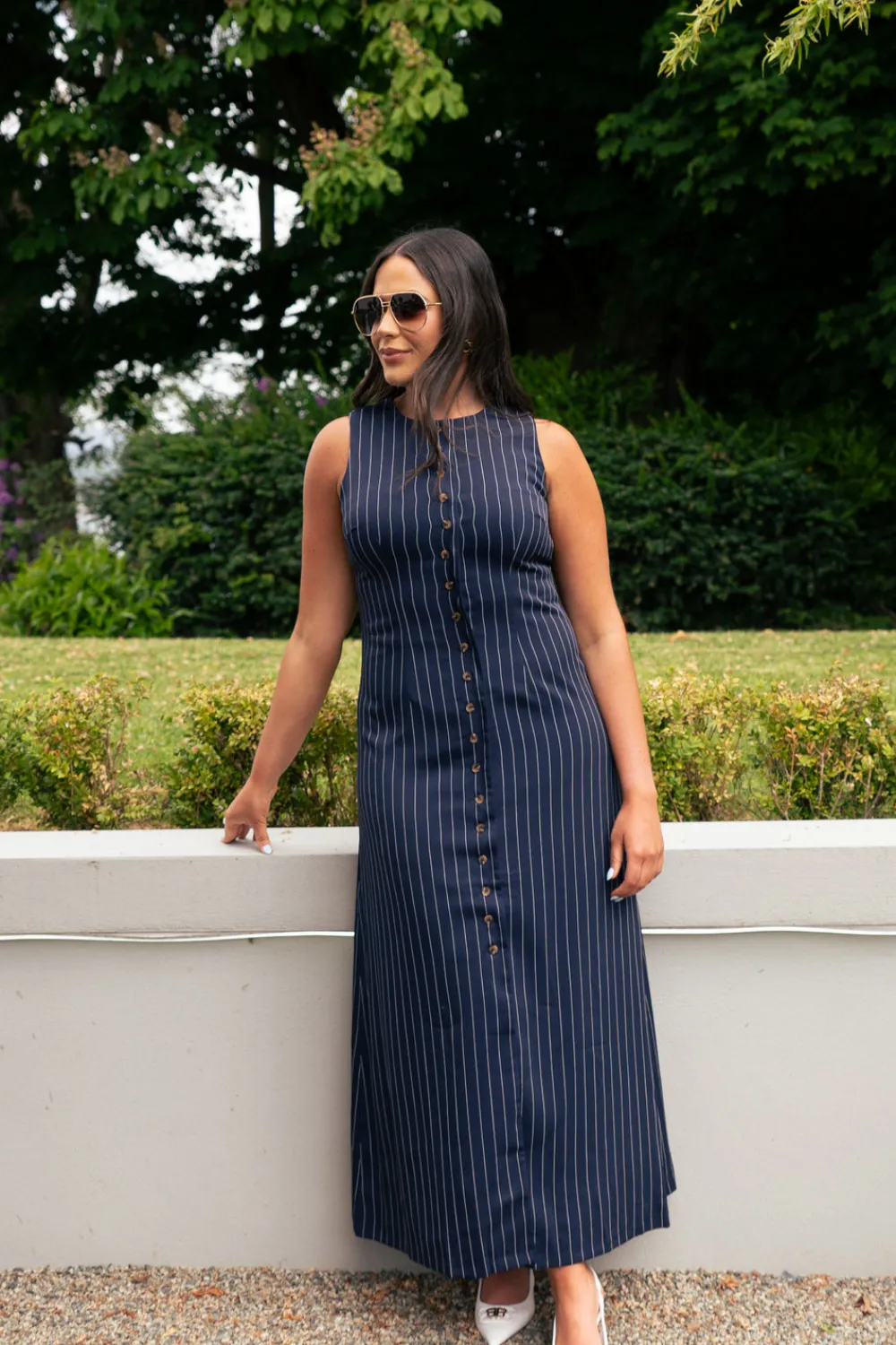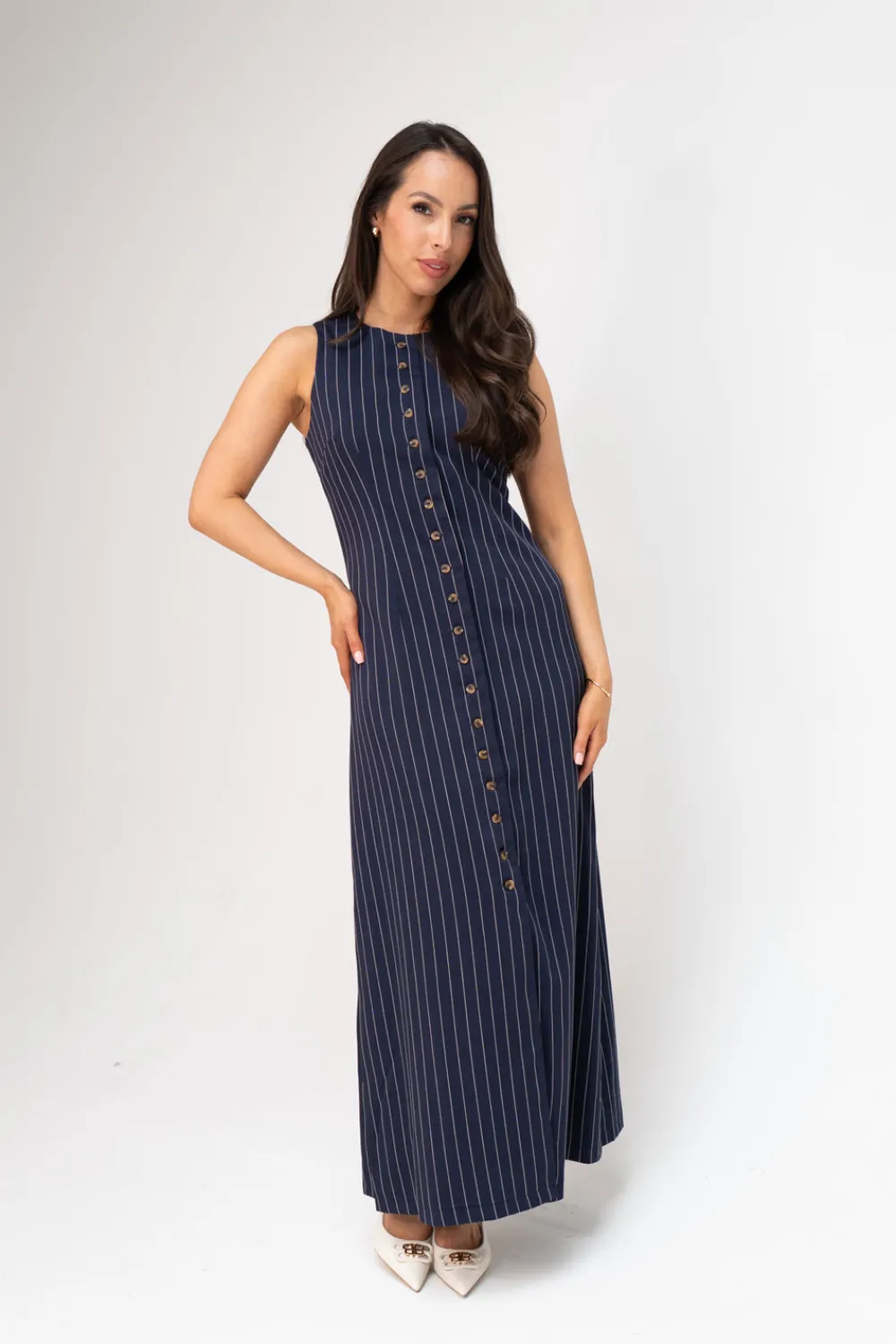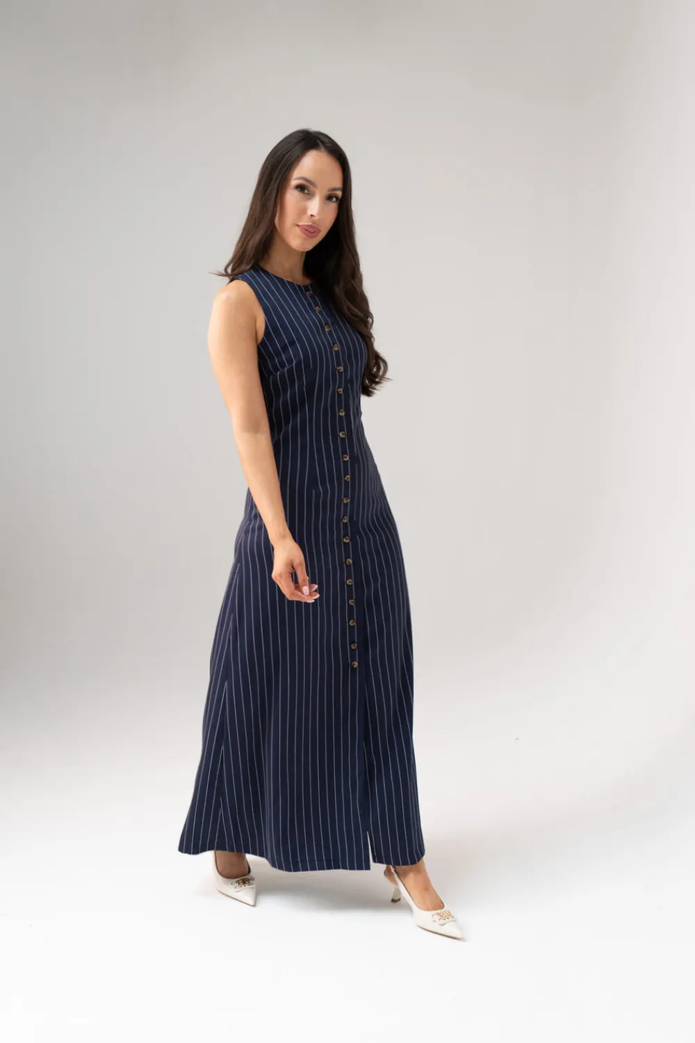 Elevate your wardrobe with this sophisticated Love Laura Pinstripe Shirt Dress in Navy. Featuring a classic round neck and sleeveless design, this versatile piece combines timeless navy with crisp white pinstripes. The button front detail adds structure while the back zip ensures a perfect fit. Fully lined for comfort and quality, this dress offers polished style for both professional settings and social occasions. Available in sizes 6-18.