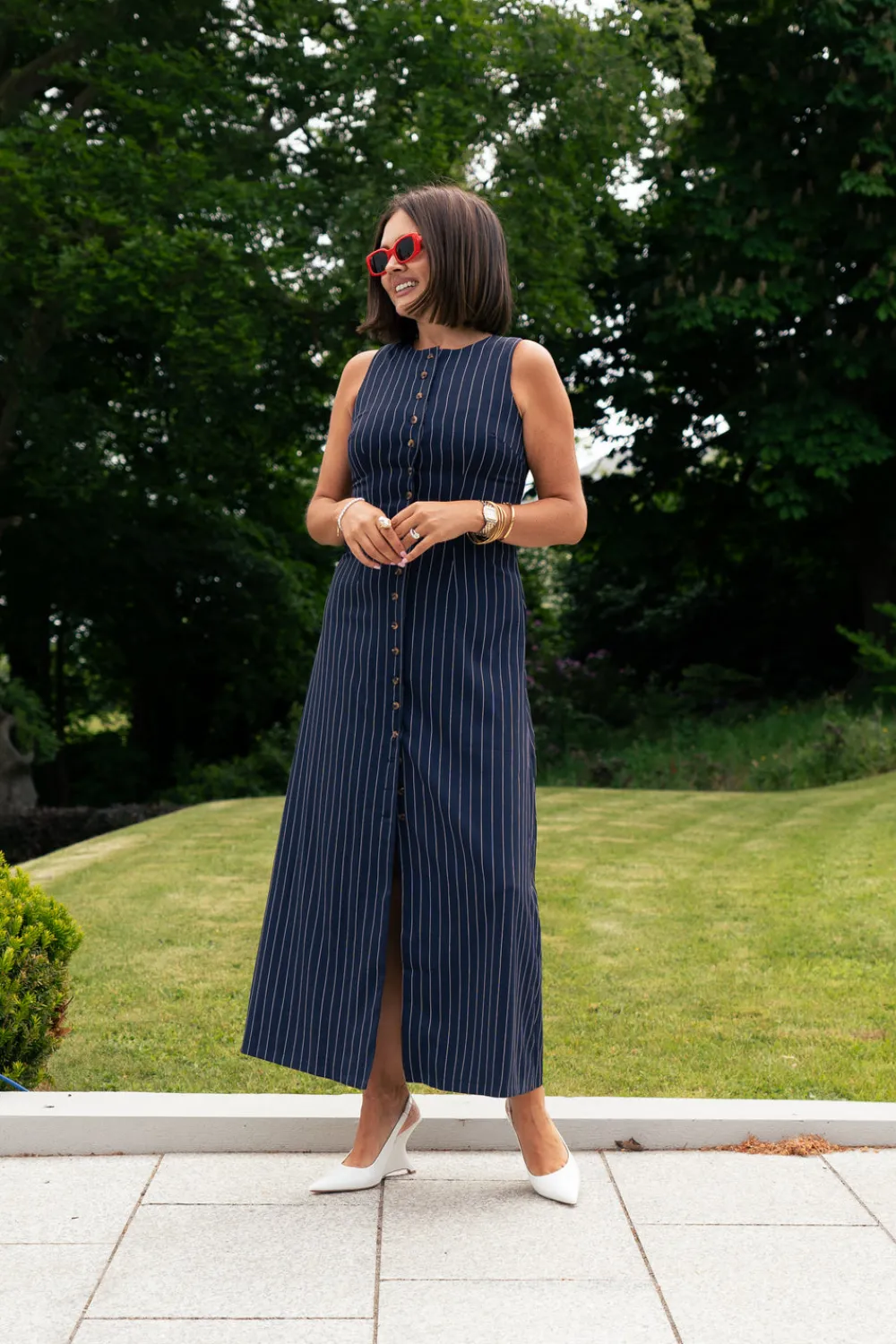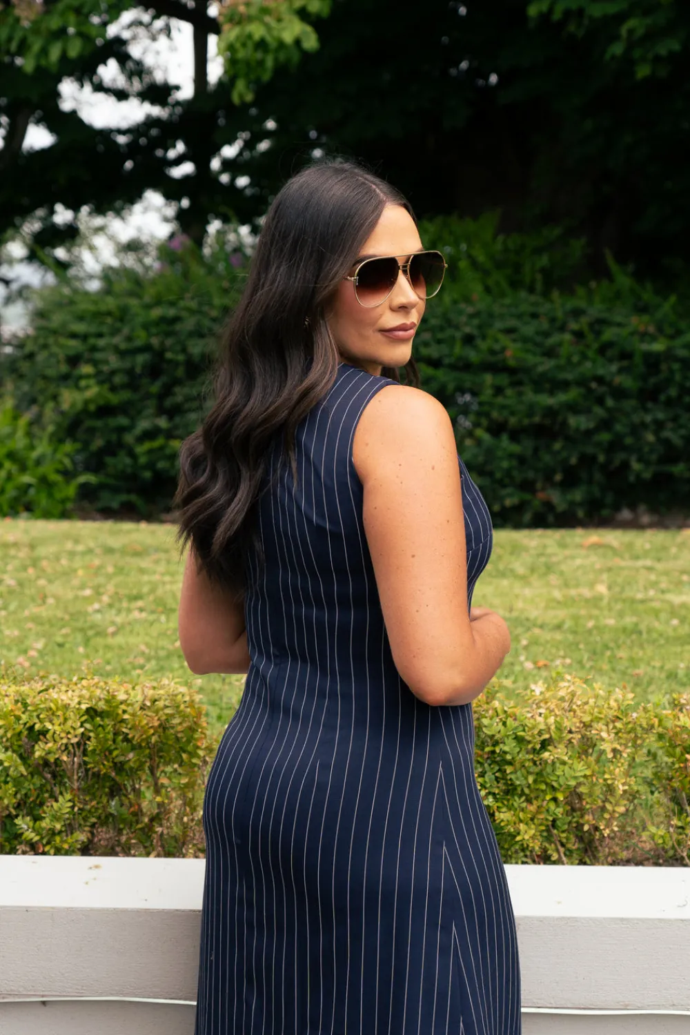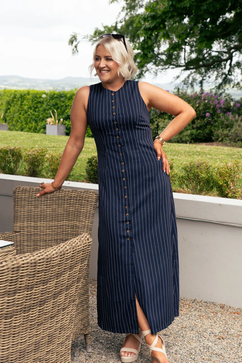 Elevate your wardrobe with this sophisticated Love Laura Pinstripe Shirt Dress in Navy. Featuring a classic round neck and sleeveless design, this versatile piece combines timeless navy with crisp white pinstripes. The button front detail adds structure while the back zip ensures a perfect fit. Fully lined for comfort and quality, this dress offers polished style for both professional settings and social occasions. Available in sizes 6-18.