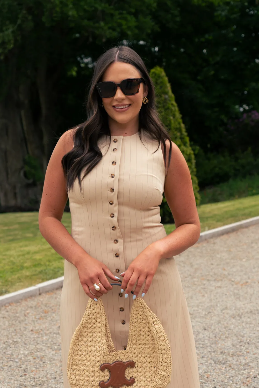 This sophisticated Love Laura Pinstripe Shirt Dress in a versatile neutral, sand tone with wine pinstripe detailing is the perfect addition to any wardrobe. Featuring a classic round neck and sleeveless design, this fully lined dress combines elegance with practicality. The button front adds a tailored touch while the back zip ensures a perfect fit. Available in sizes 6-18, this piece transitions effortlessly from office to evening occasions.