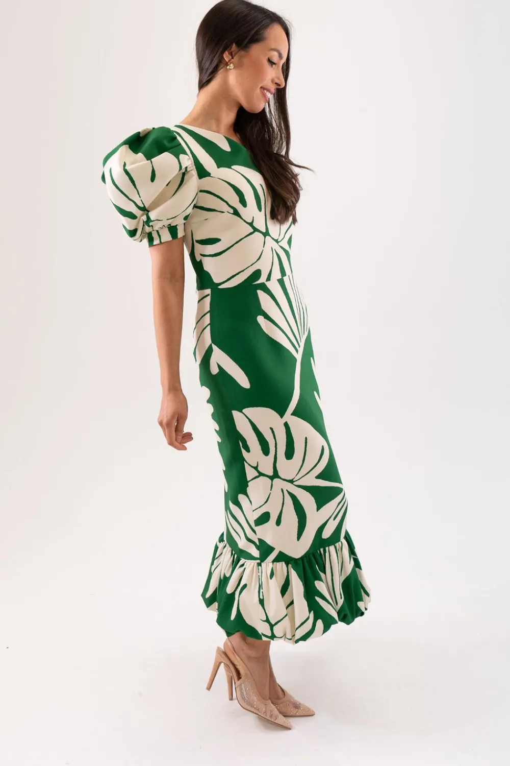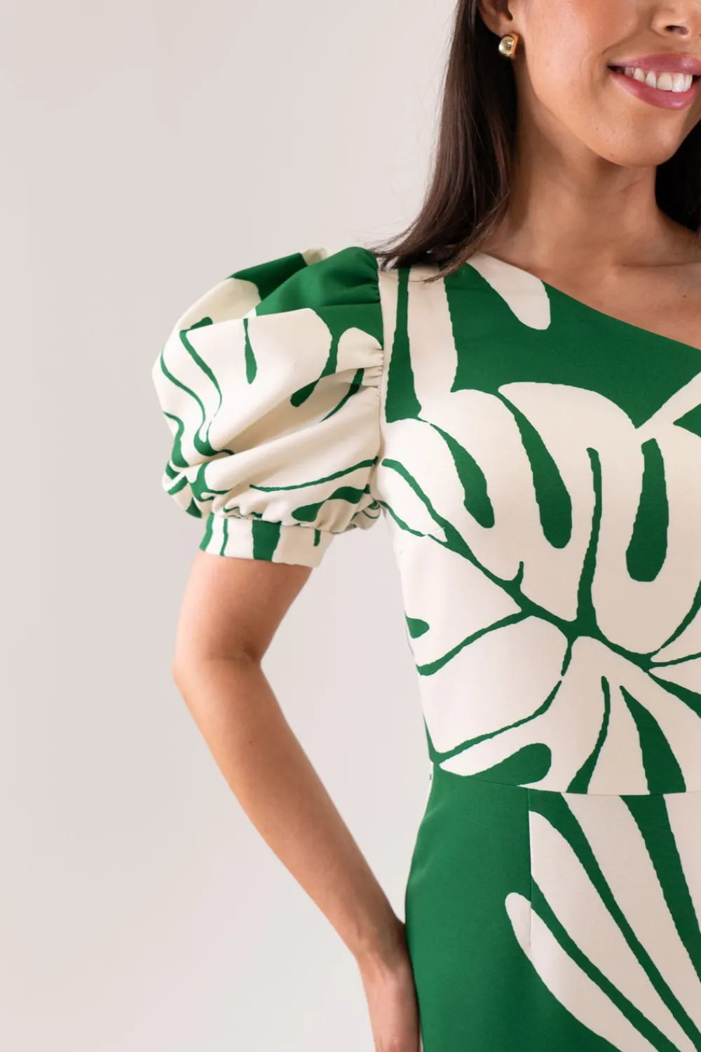 Expertly crafted with a one shoulder design and short puff sleeves, the Marissa Printed Dress exudes elegance. The green and cream print adds a touch of sophistication, while the peplum hem and side zip provide a comfortable and flattering fit. Perfect for any occasion, this midi dress is a must-have in your wardrobe.