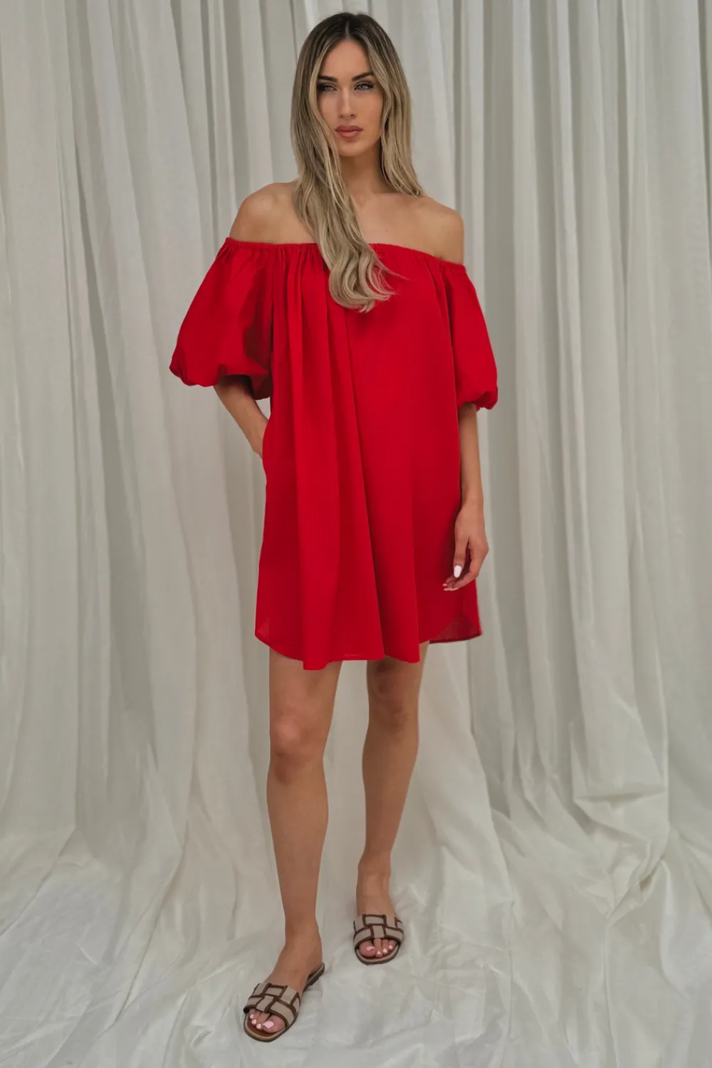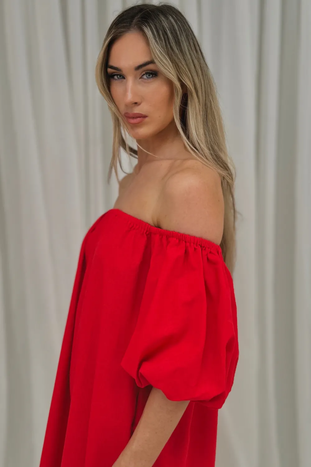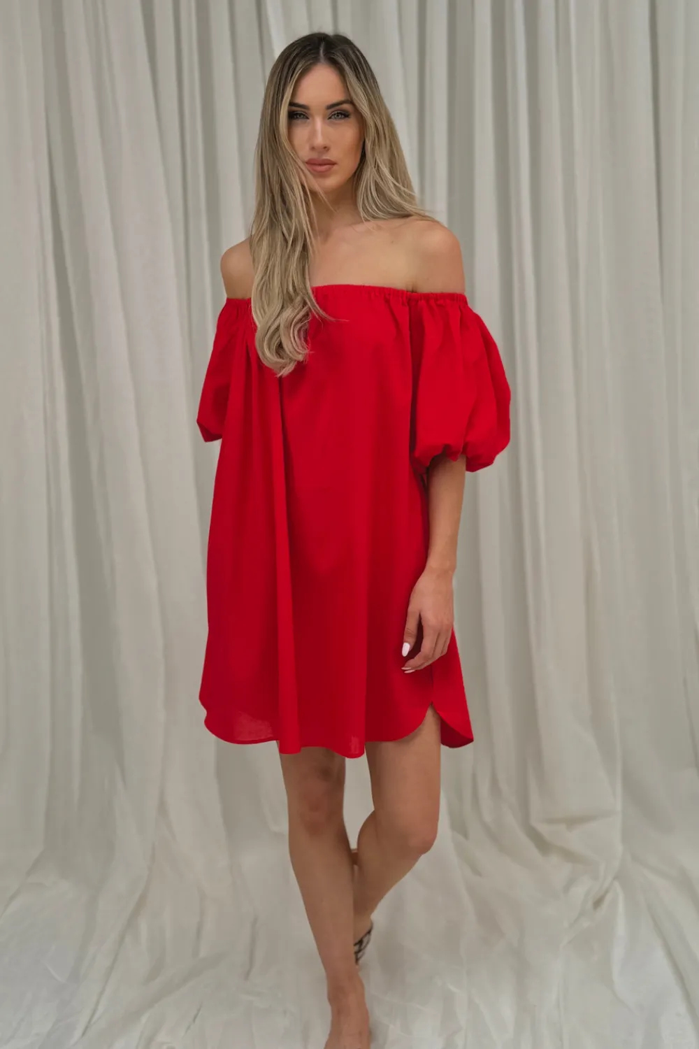 Expertly crafted with a linen mix material, the Caitlyn Puff Sleeve Bardot Dress in Red is a striking summer dress. Featuring an elasticated neck and cuffs, this Bardot style dress boasts a top to hem length of 76cm and convenient pockets. The bold red colour and puff sleeves add a touch of elegance to this versatile piece.
