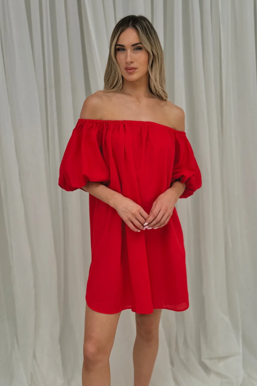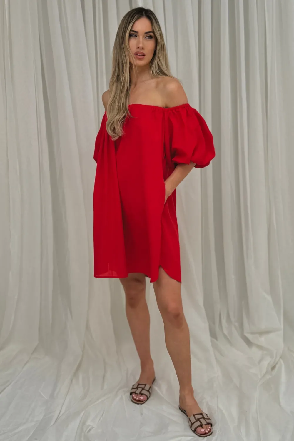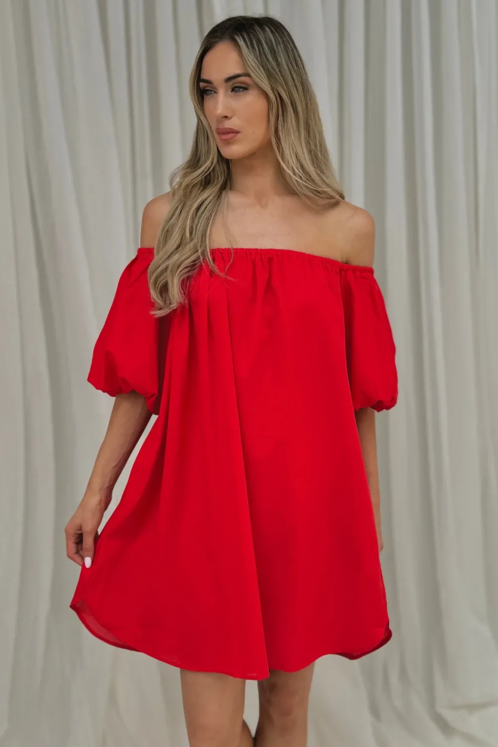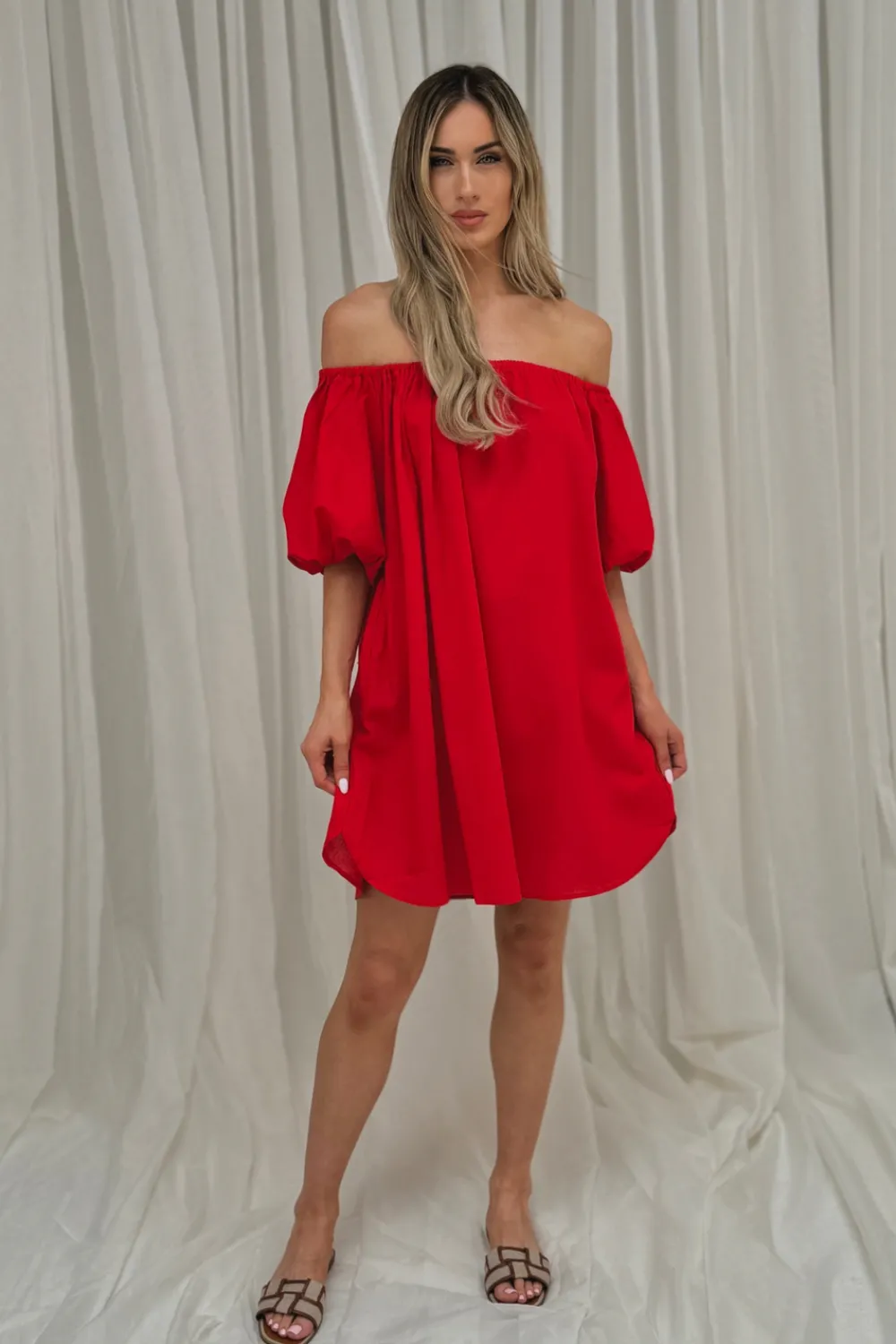 Expertly crafted with a linen mix material, the Caitlyn Puff Sleeve Bardot Dress in Red is a striking summer dress. Featuring an elasticated neck and cuffs, this Bardot style dress boasts a top to hem length of 76cm and convenient pockets. The bold red colour and puff sleeves add a touch of elegance to this versatile piece.