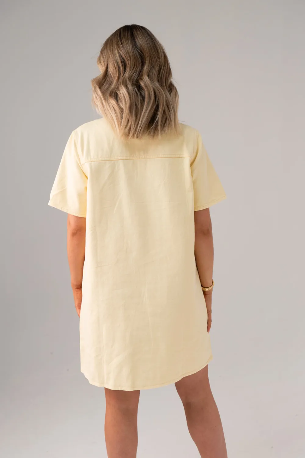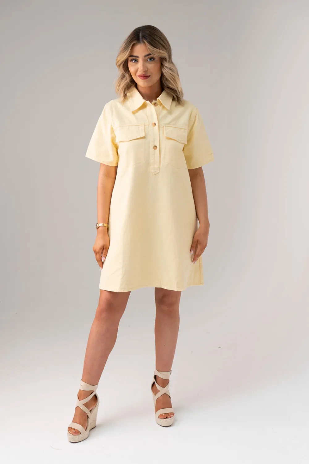 This structured denim shirt dress features a classic collar and convenient button-front closure. The short sleeves and knee-length silhouette create a balanced, flattering profile, while practical pockets add functionality. Crafted in a vibrant lemon hue, this versatile piece combines the durability of denim with a refreshing colour palette for a sophisticated yet casual statement.