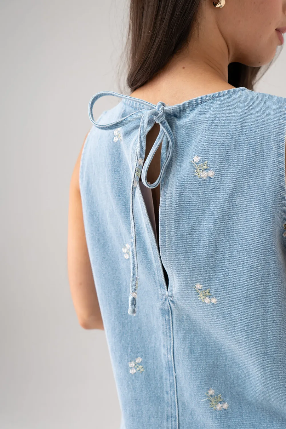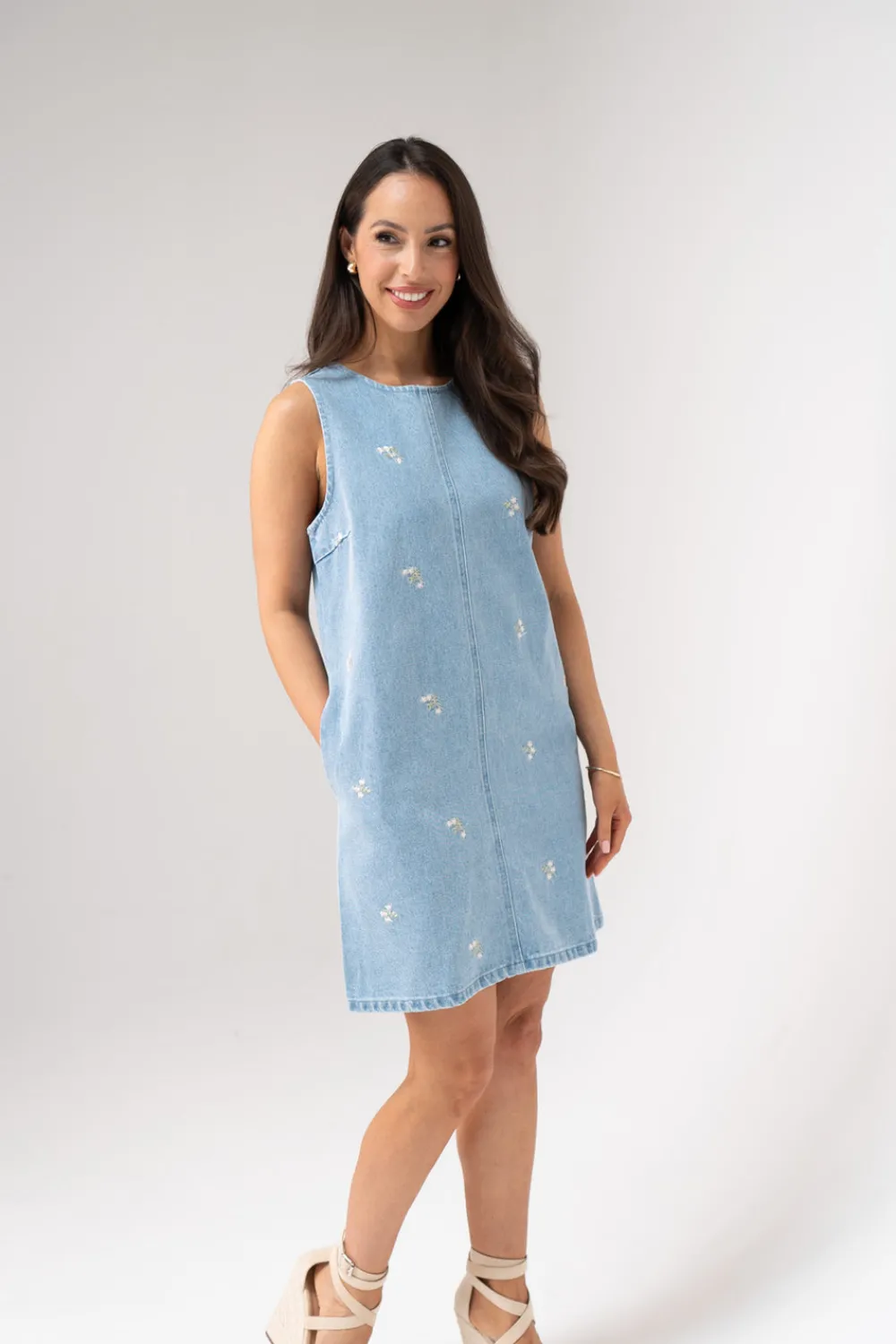 This Daisy Floral Denim Shift Dress features a light wash finish and a flattering round neck design. Its sleeveless cut and mini length offer a fresh, summery silhouette, while delicate floral detailing adds a subtle feminine touch. Perfect for casual outings, this dress combines classic denim durability with stylish, expert tailoring.