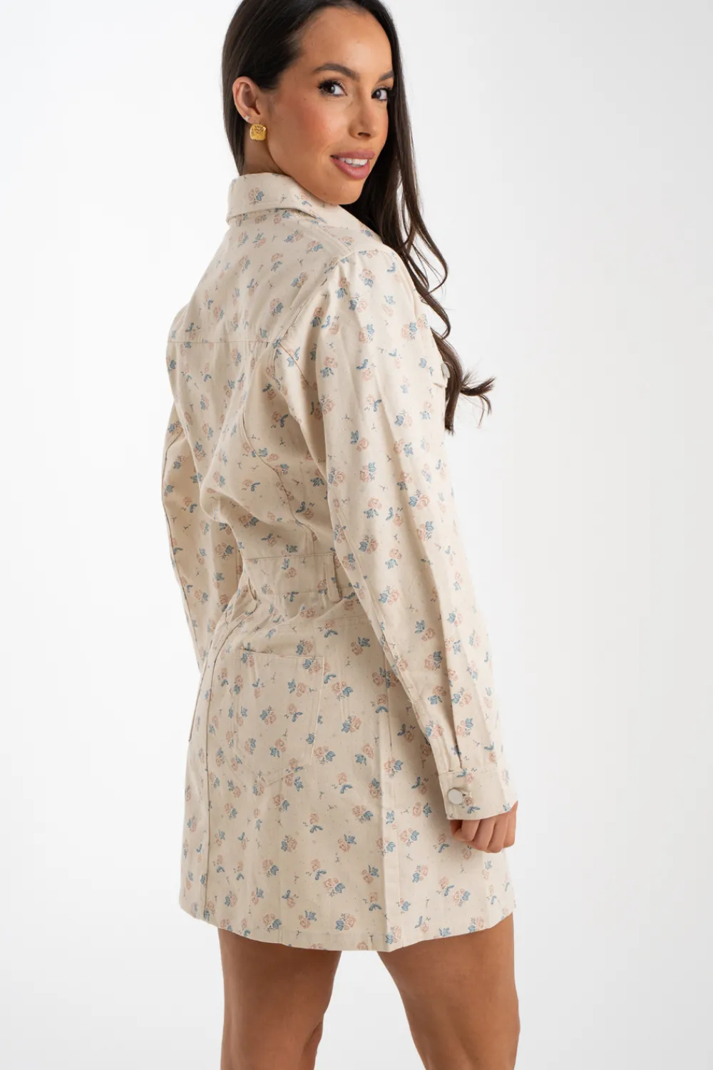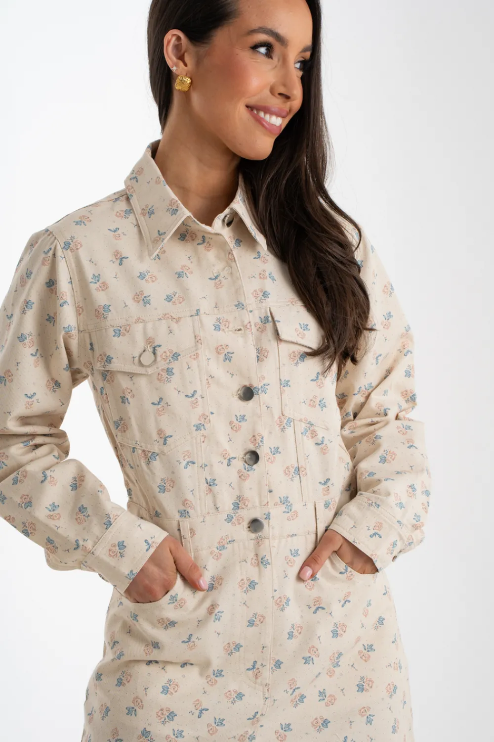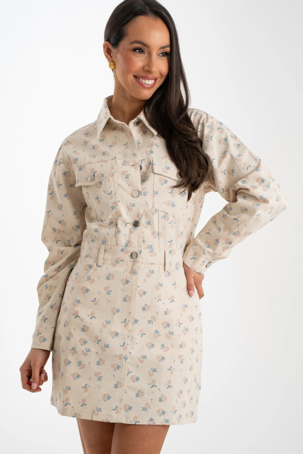 Expertly crafted, this Daisy Floral Denim Shirt Dress is both stylish and functional. Made with high-quality cream denim, this dress features a flattering button front and top and bottom pockets for convenience. Its floral print adds a touch of femininity, making it the perfect addition to your wardrobe.